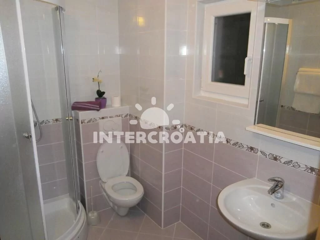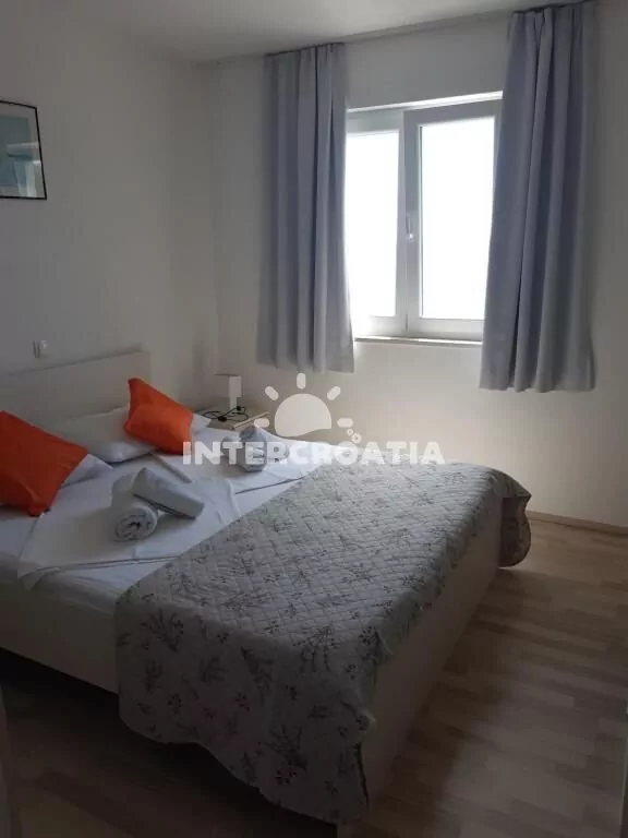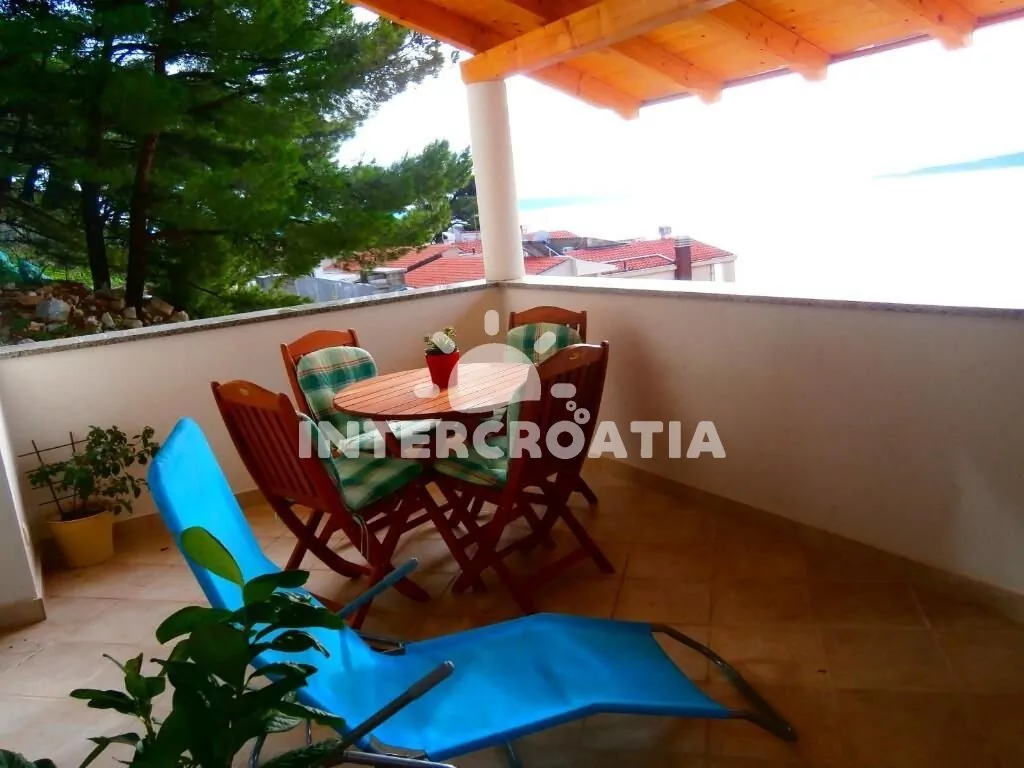 Apartmán (45 m2) s terasou, posezením a výhledem na moře se nachází v 1. patře domu. Apartmán má 2 ložnice a je vhodný pro 3 až 4 osoby. Obývací pokoj je spojený s kuchyní. Kuchyňská linka je vybavena dvouplotýnkovým vařičem, digestoří, rychlovarnou konvicí, mikrovlnnou troubou, kávovarem, nádobím a lednicí s mrazákem. Obývací pokoj s jídelním stolem, pohovkou (rozložitelná na extra lůžko pro 1 osobu), televizí se satelitním programem, klimatizací a vstupem na terasu. První ložnice s dvoulůžkem a sejfem. Druhá ložnice s jedním jednolůžkem. Koupelna se sprchovým koutem, umyvadlem, fénem a wc. Hostům je k dispozici parkování u objektu zdarma.