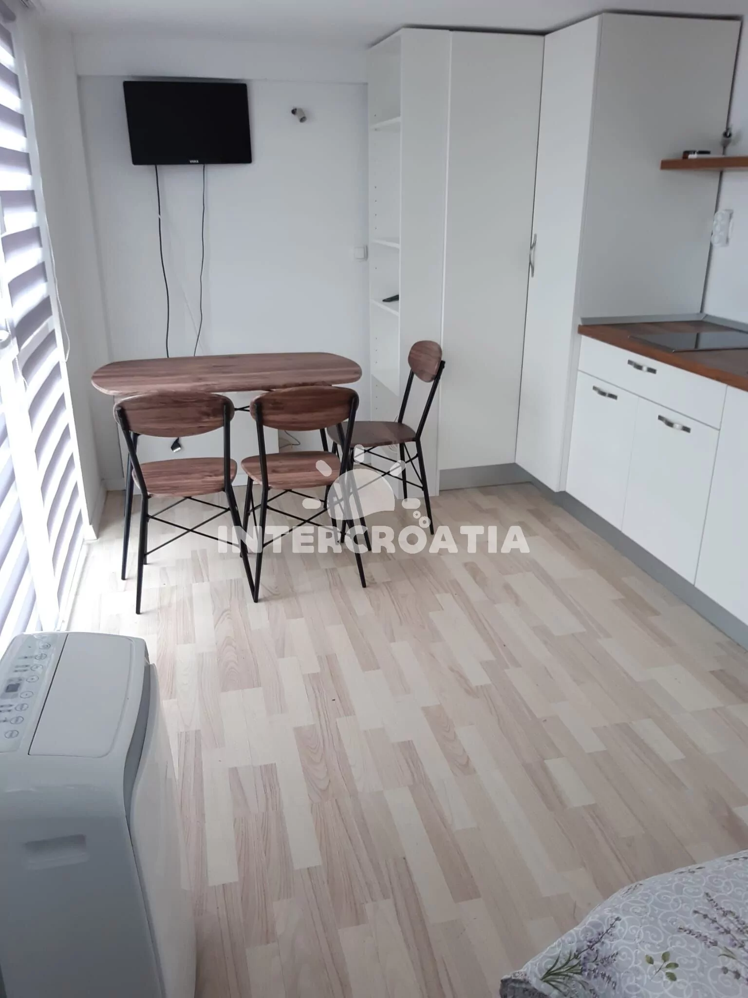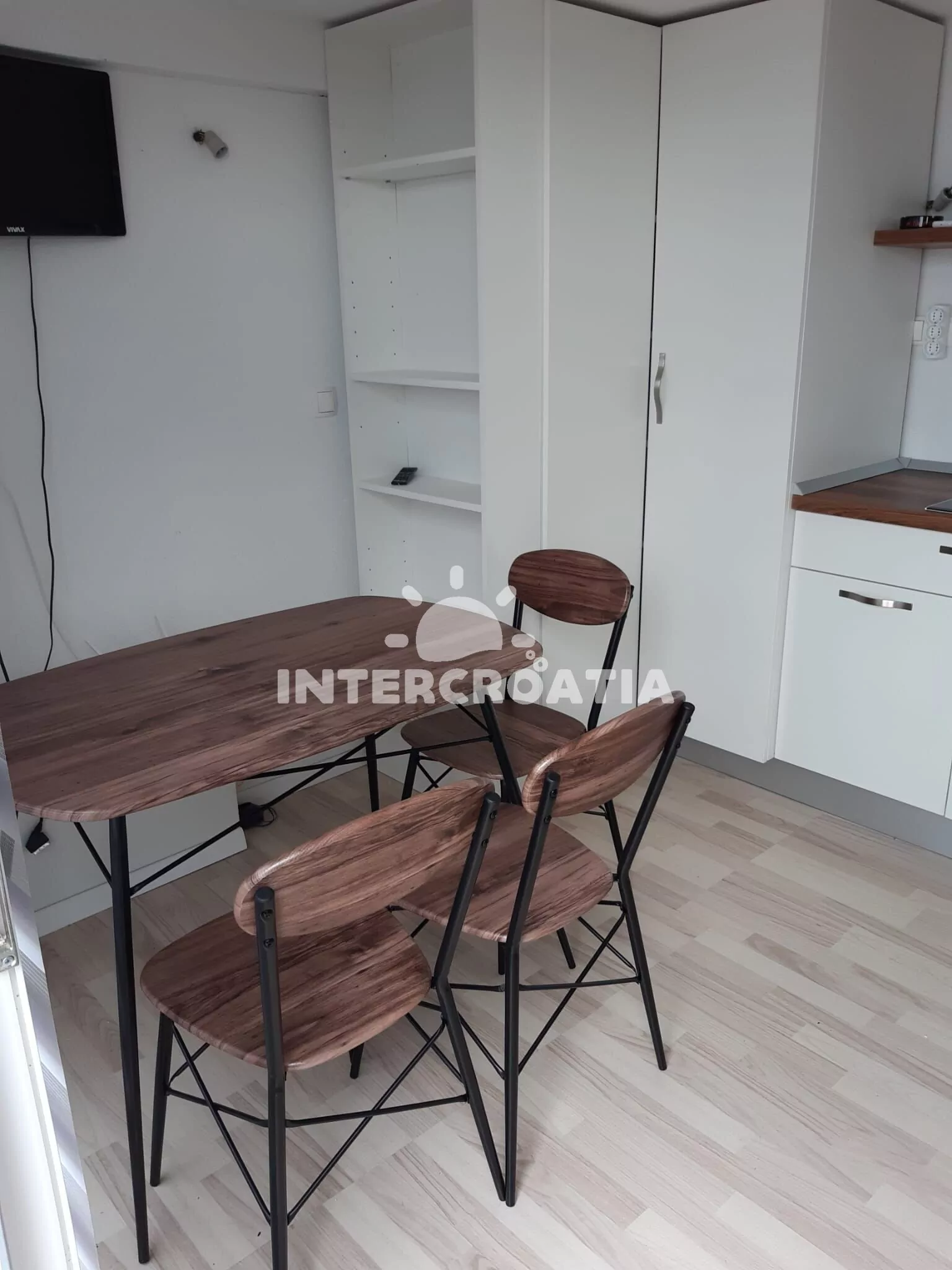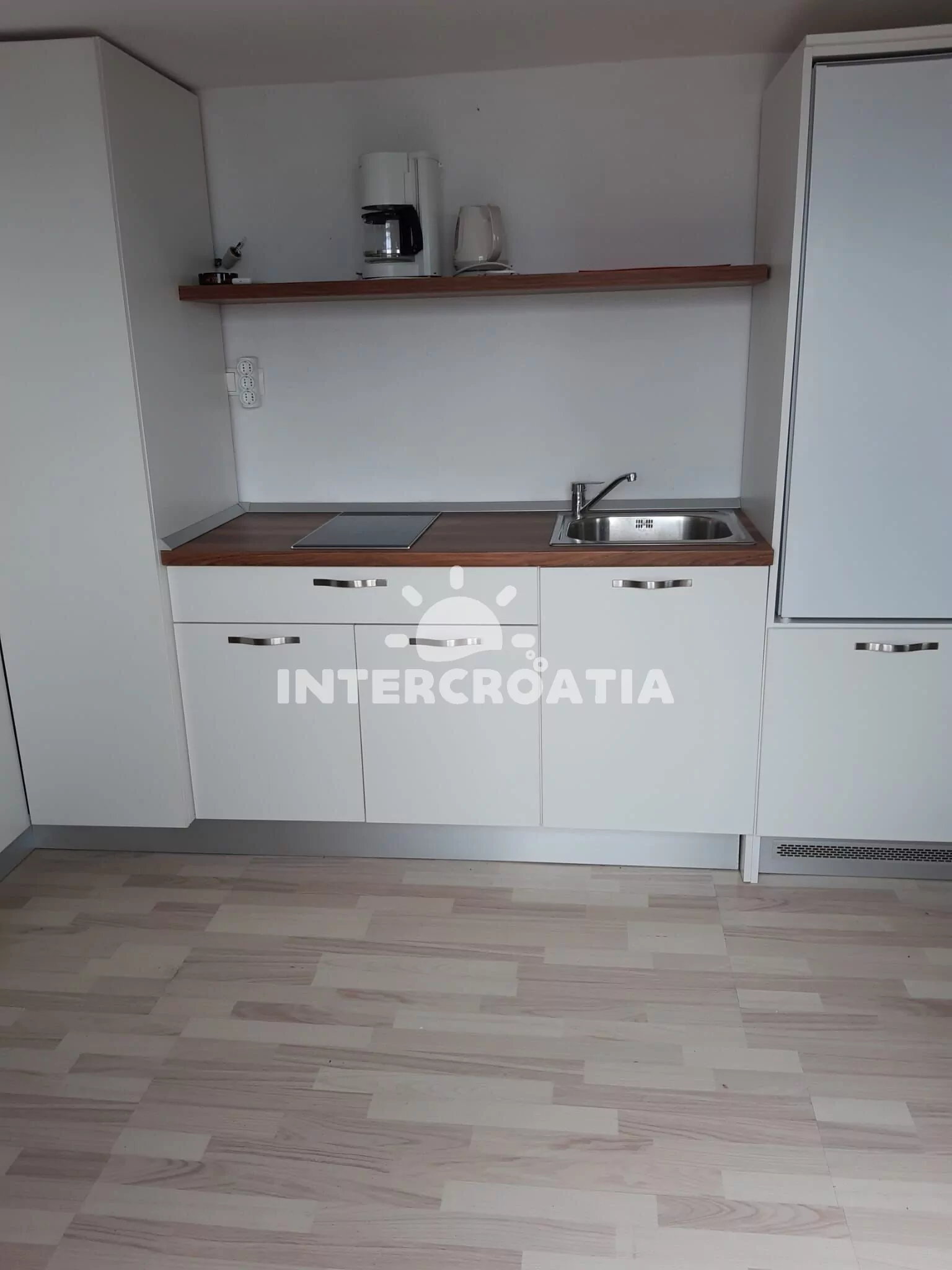 Apartmán (20 m2) typu studio s terasou, posezením a výhledem na moře se nachází v přízemí domu. Obývací místnost je spojena s kuchyní. Kuchyňská linka je vybavena dvouplotýnkovým vařičem,…