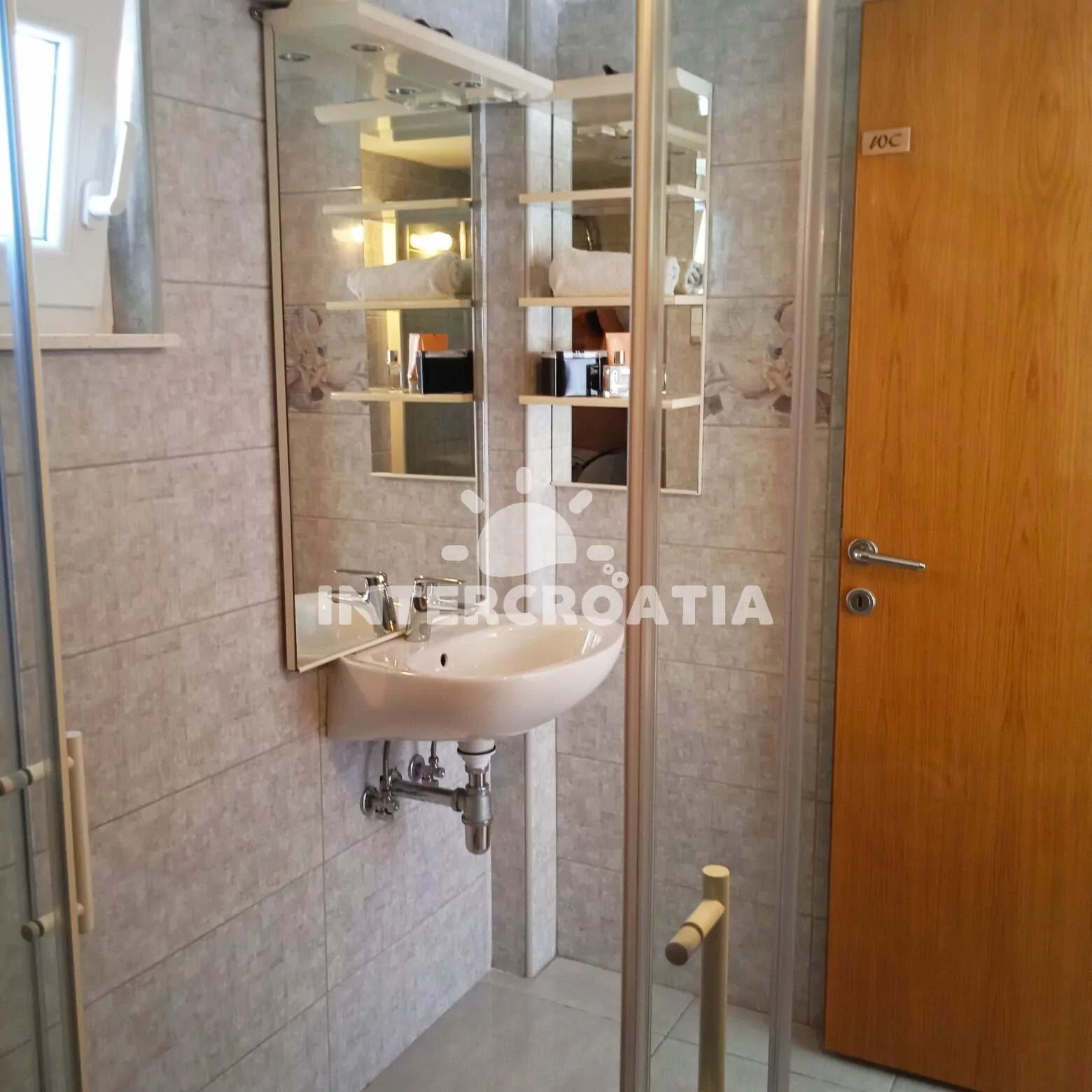 Apartmán (20 m2) typu studio s terasou, posezením a výhledem na moře se nachází v přízemí domu. Obývací místnost je spojena s kuchyní. Kuchyňská linka je vybavena dvouplotýnkovým vařičem, rychlovarnou konvicí, mikrovlnnou troubou, kávovarem, nádobím a lednicí s mrazákem. Obývací místnost s jídelním stolem, pohovkou (rozložitelná na extra lůžko pro 2 osoby), televizí, klimatizací, sejfem a vstupem na terasu. Koupelna se sprchovým koutem, umyvadlem, fénem a wc. Hostům je k dispozici parkování u objektu zdarma.