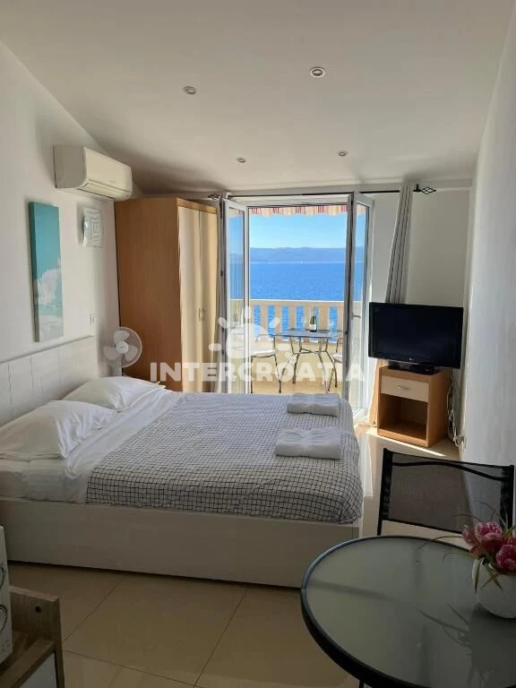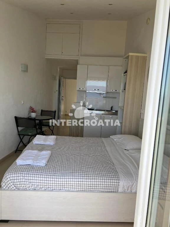 Apartmán (36 m2) typu studio s balkonem, posezením a výhledem na moře se nachází ve 3. patře domu. Obývací místnost je spojena s kuchyní. Kuchyňská linka je vybavena dvouplotýnkovým vařičem,…