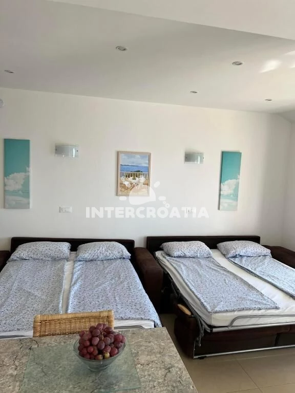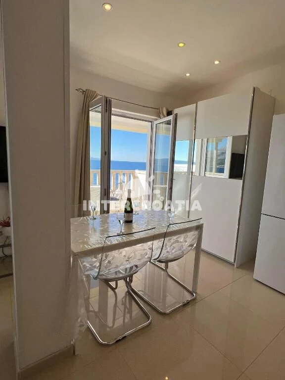 Apartmán (50 m2) s balkonem, posezením a výhledem na moře se nachází ve 3. patře domu. Apartmán má 1 ložnici a je vhodný pro až 4 osoby. Obývací pokoj je spojený s kuchyní. Kuchyňská linka je vybavena varnou deskou, digestoří, vestavěnou troubou, myčkou na nádobí, mikrovlnnou troubou, rychlovarnou konvicí, toustovačem, kávovarem, nádobím a lednicí s mrazákem. Obývací pokoj s jídelním stolem, dvěma pohovkami (rozložitelné na extra lůžka pro 2 osoby), televizí, klimatizací a vstupem na balkon. Ložnice s dvoulůžkem, sejfem a klimatizací. Koupelna se sprchovým koutem, umyvadlem, fénem, pračkou, žehličkou a wc. Hostům je k dispozici parkování 150-300 m od objektu zdarma.