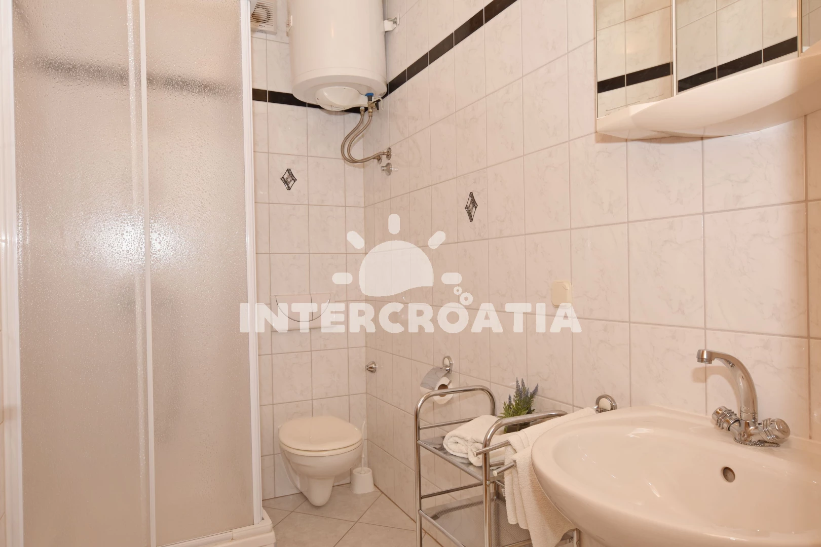 Vzdálenosti: Moře 140 m, pláž 330 m (oblázky), supermarket 122 m, veřejná doprava 260 m, bar 300 m, restaurace 300 m, mini golf 2 km, kotviště pro čluny 2 km, půjčovna motorových člunů 2 km, potápění 2 km, směnárna 2 km, půjčovna kol 2 km, centrum 2 km, tenisové kurty 2 km, pošta 2 km, marina 2 km, lékárna 2 km, banka 4 km, diskotéka 4 km, ambulance 4 km, muzeum 10 km, čerpací stanice 10 km, trajekt (Makarska) 13 km, letiště (Split) 90 km,