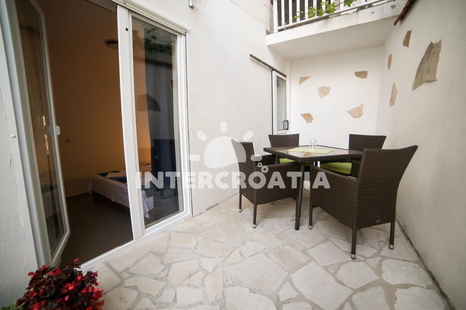 Apartmán (2) s terasou. Nachází se v objektu. Apartmán má 2 ložnice a je vhodný pro až 2 osoby. Kuchyňská linka je vybavena varnou deskou, kávovarem, mikrovlnnou troubou, rychlovarnou konvicí, nádobím, lednicí. K dispozici televize, žehlička. První ložnice s dvoulůžky. Druhá ložnice s dvoulůžkem.