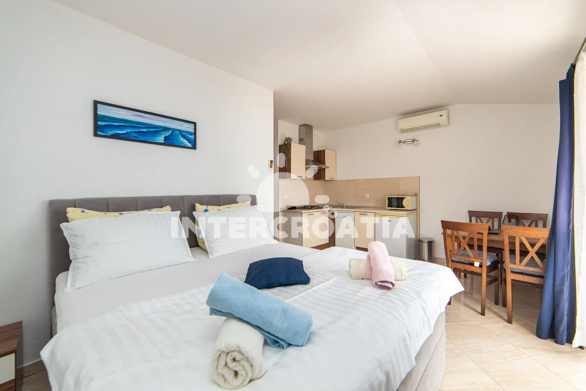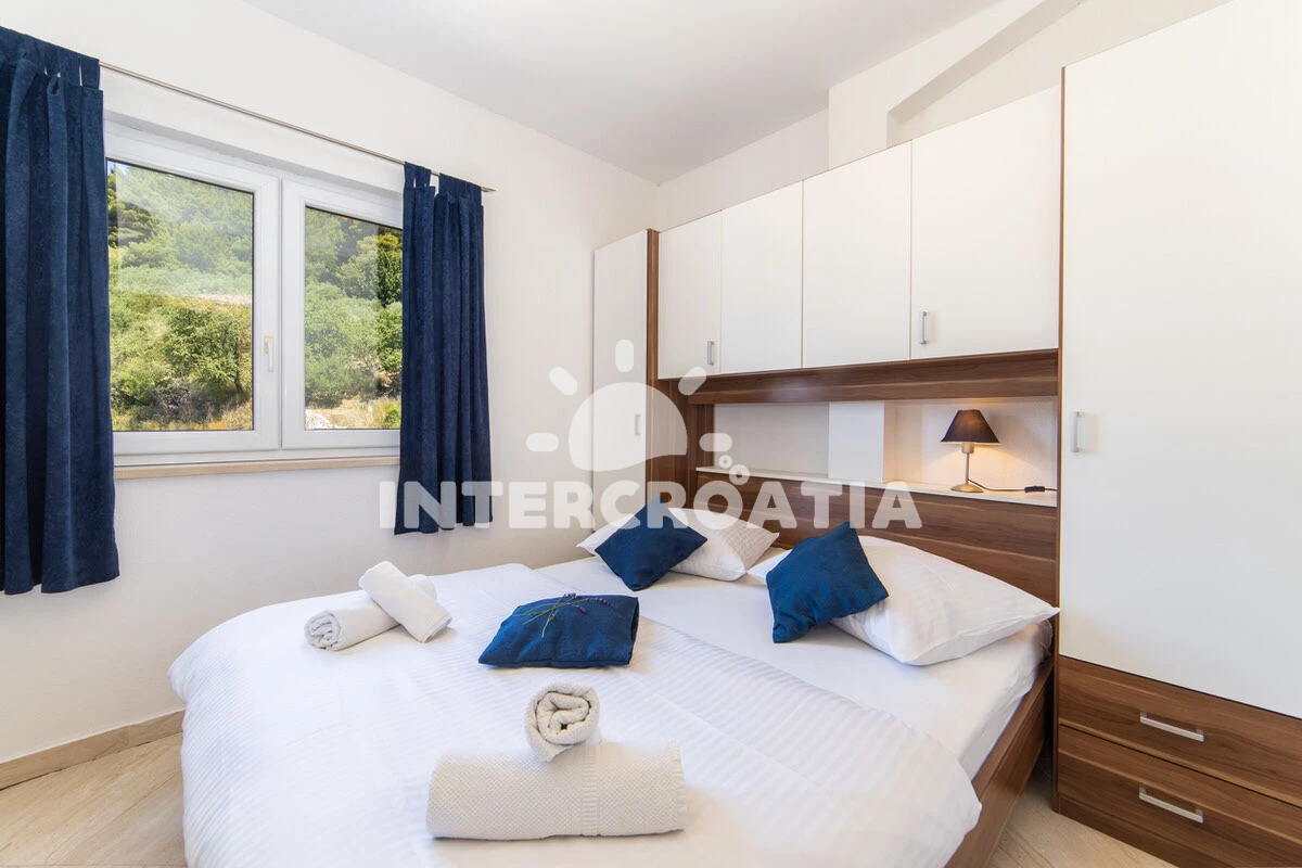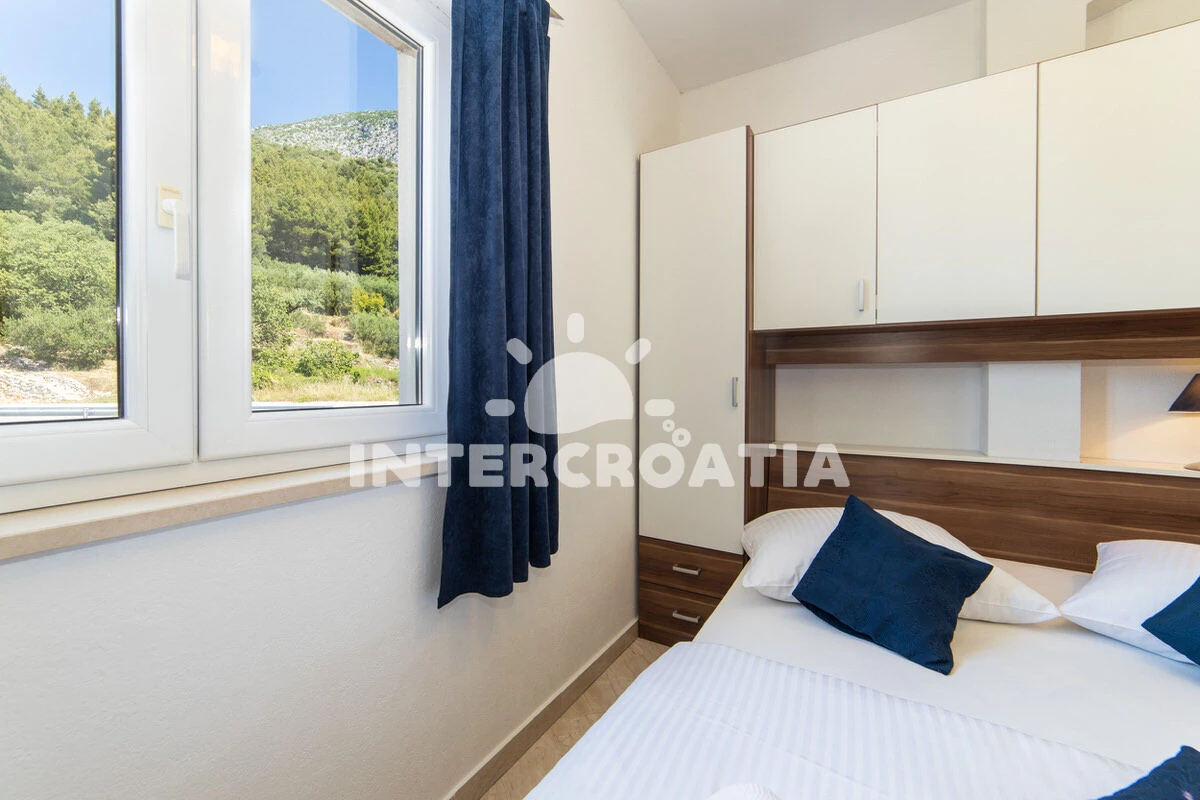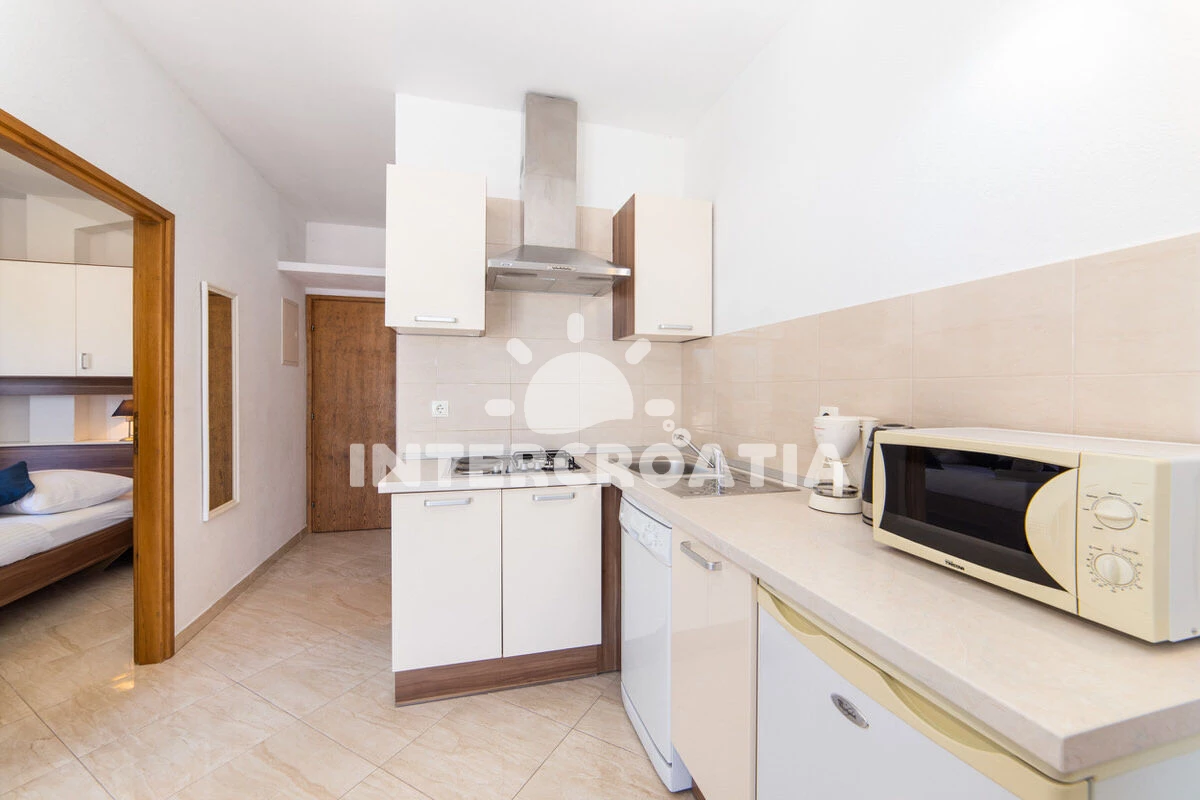 Vzdálenosti: Moře 50 m, pláž 50 m (oblázky), půjčovna motorových člunů 10 m, kotviště pro čluny 70 m, restaurace 70 m, bar 70 m, půjčovna kol 300 m, centrum 300 m, supermarket 300 m, veřejná doprava 400 m, směnárna 1 km, pošta 1 km, tenisové kurty 1,5 km, potápění 1,5 km, čerpací stanice 2 km, ambulance 2 km, lékárna 2 km, diskotéka 3 km, muzeum 4 km, trajekt (Drvenik) 10 km, banka 15 km, letiště (Split) 100 km,