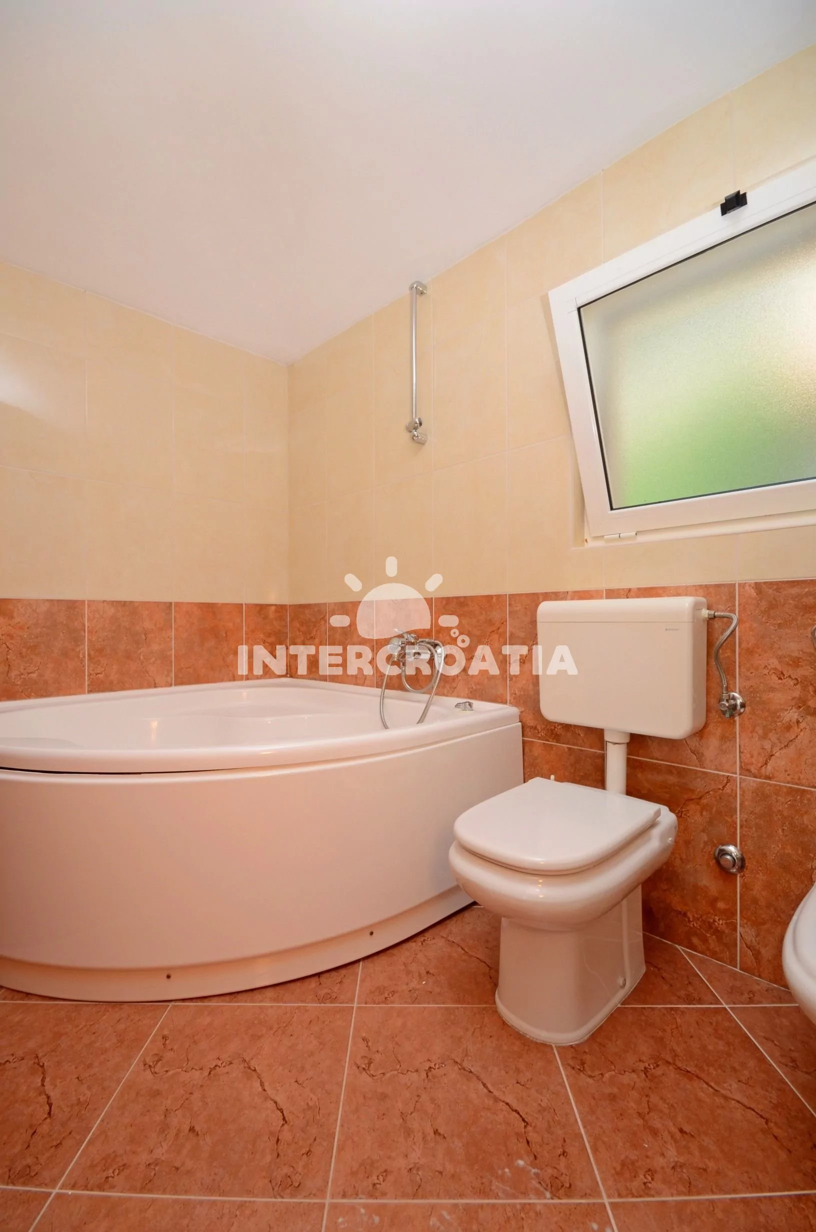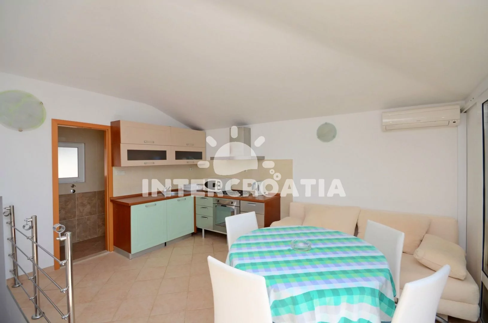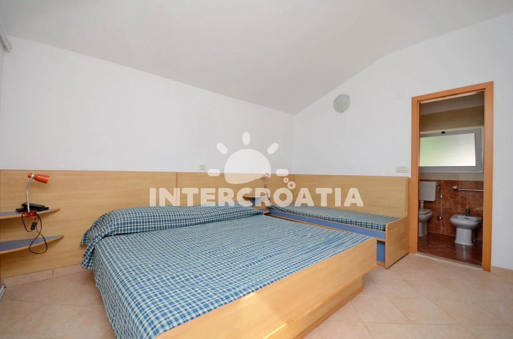 Apartmán (50 m2) s balkonem se nachází ve druhém patře domu. Apartmán má jednu ložnici a je vhodný maximálně pro 5 osob. Kuchyně s jídelním stolem, lednicí s mrazákem, plynovým sporákem s troubou, mikrovlnnou troubou, rychlovarnou konvicí, nádobím, TV se satelitním příjmem, klimatizací, pohovkou (rozložitelnou na extra dvojlůžko) a vstupem na balkon. Ložnice (15 m2) s dvoulůžkem, jednolůžkem, vstupem na balkon a koupelnou s vanou, bidetem, umyvadlem a toaletou. Druhá koupelna se sprchou a wc. Hostům je k dispozici parkování u objektu zdarma.