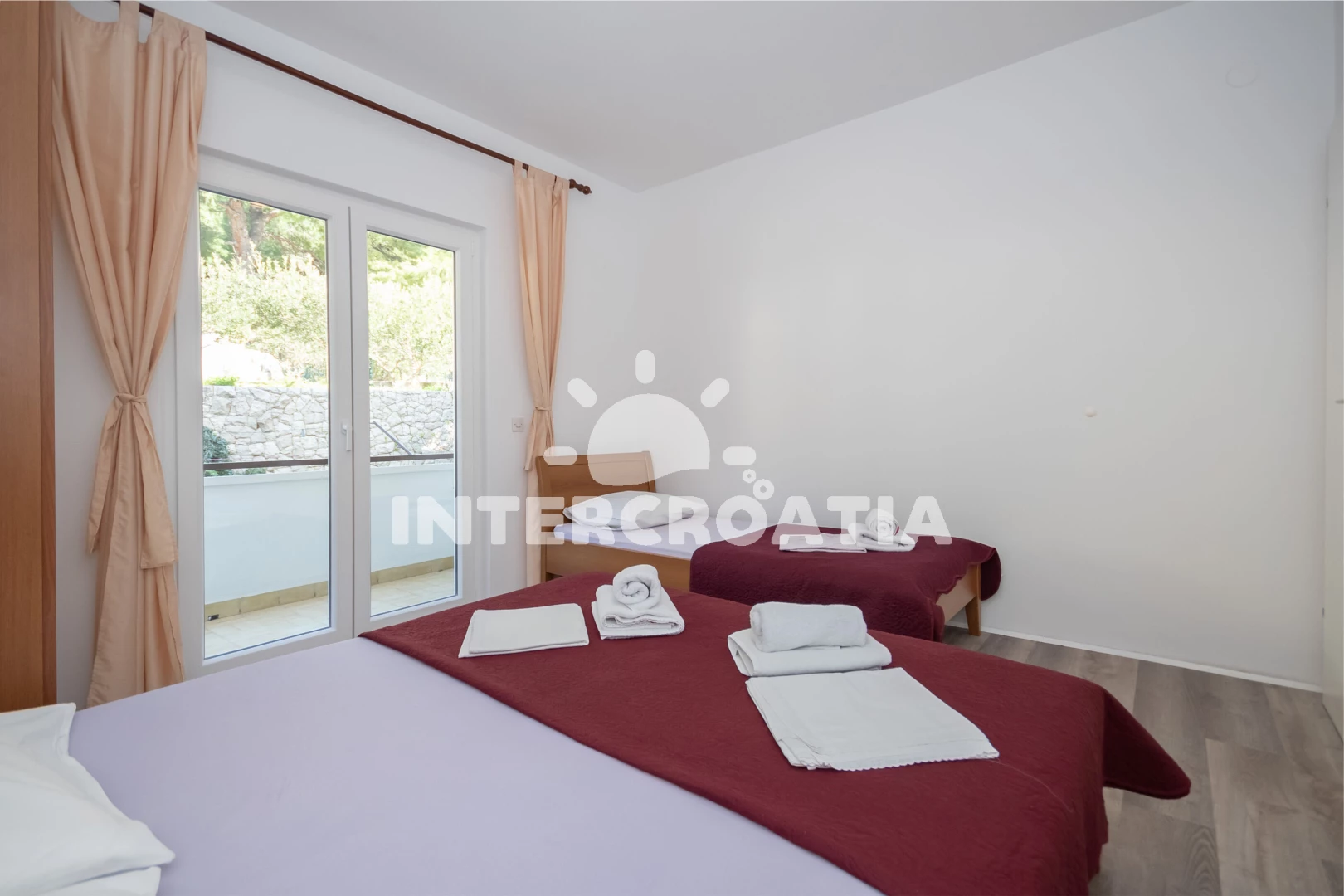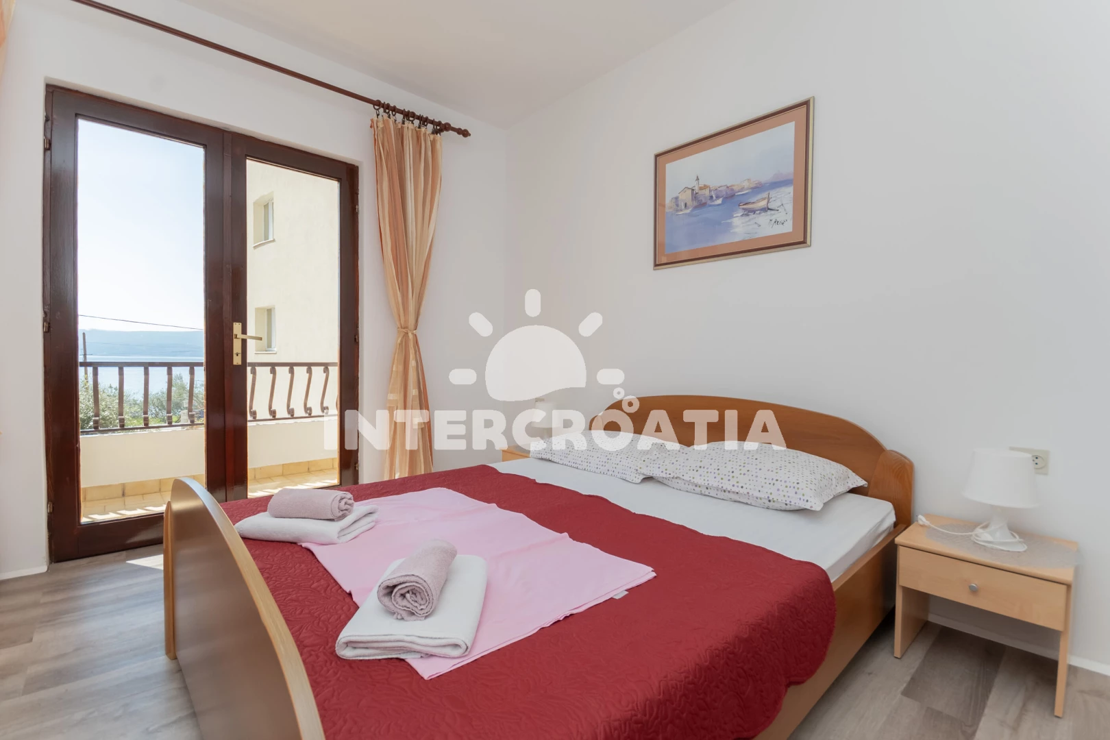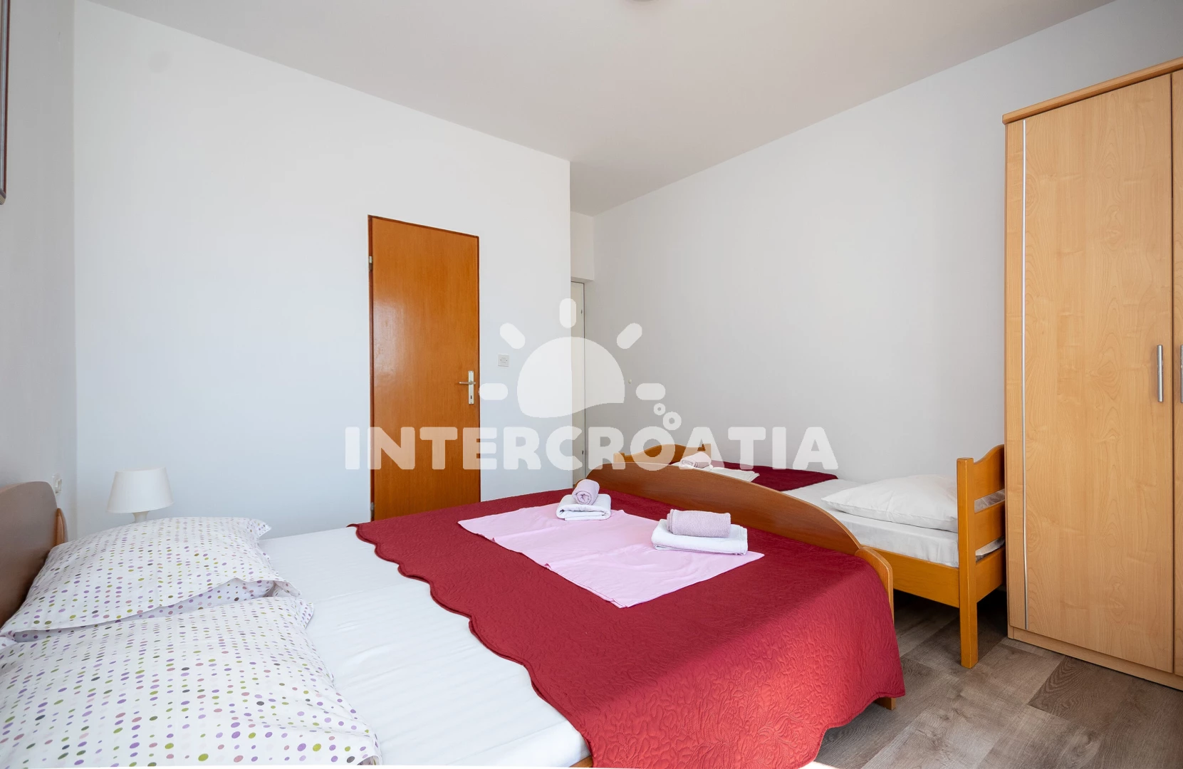 Apartmán (150 m2) s balkonem, s terasou, a výhledem na moře. Nachází se v 1. patře objektu. Apartmán má 3 ložnice a je vhodný pro až 8 osob. Kuchyňská linka je vybavena varnou deskou, troubou, mikrovlnnou troubou, rychlovarnou konvicí, nádobím, lednicí, mrazákem. K dispozici televize se satelitním programem, žehlička. První ložnice s jednolůžkem, dvoulůžkem. Druhá ložnice s jednolůžkem, dvoulůžkem. Třetí ložnice s dvoulůžkem. Koupelna se sprchovým koutem, umyvadlem, fénem a WC.