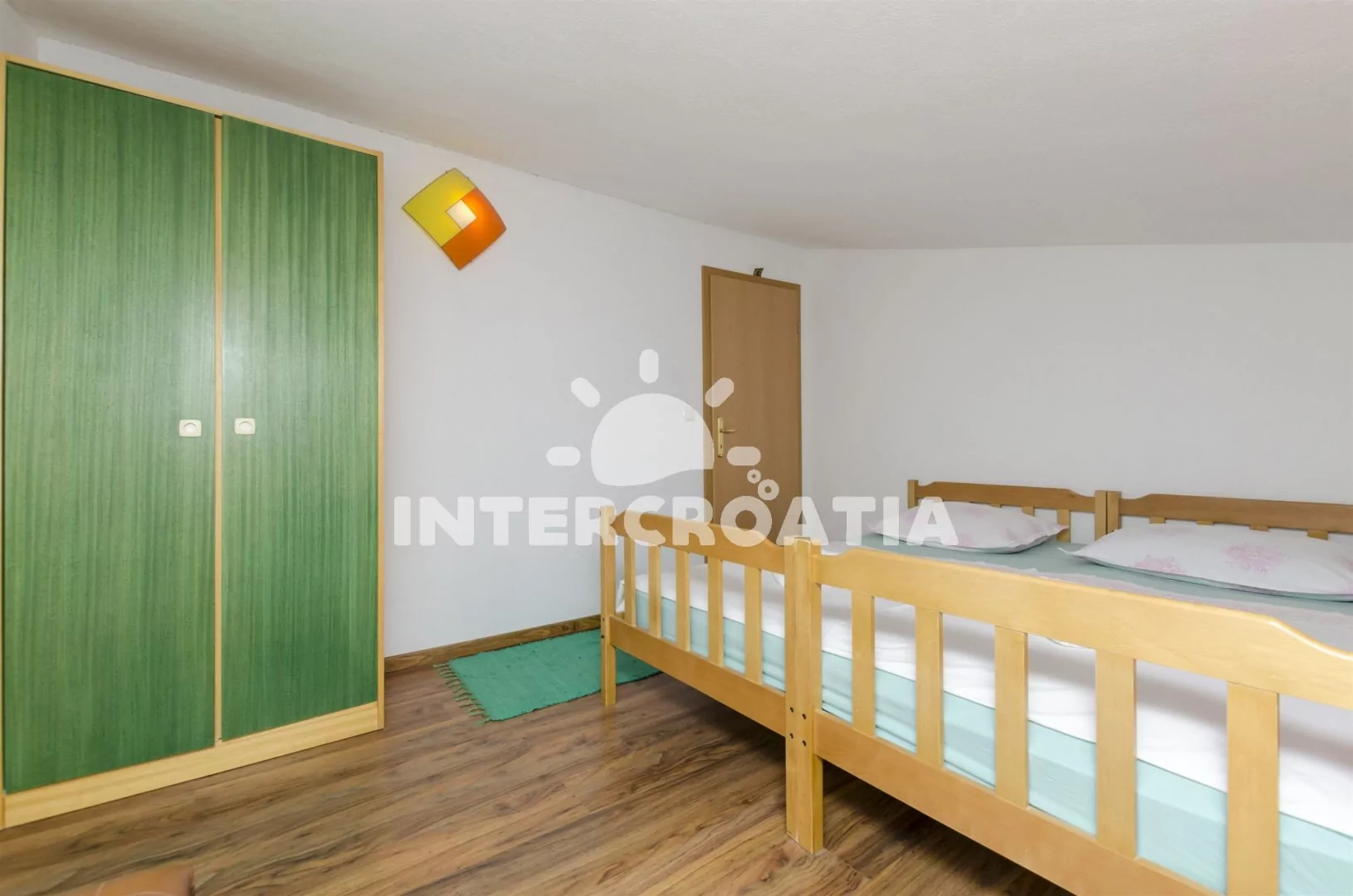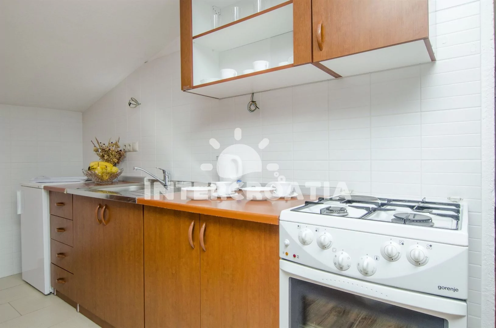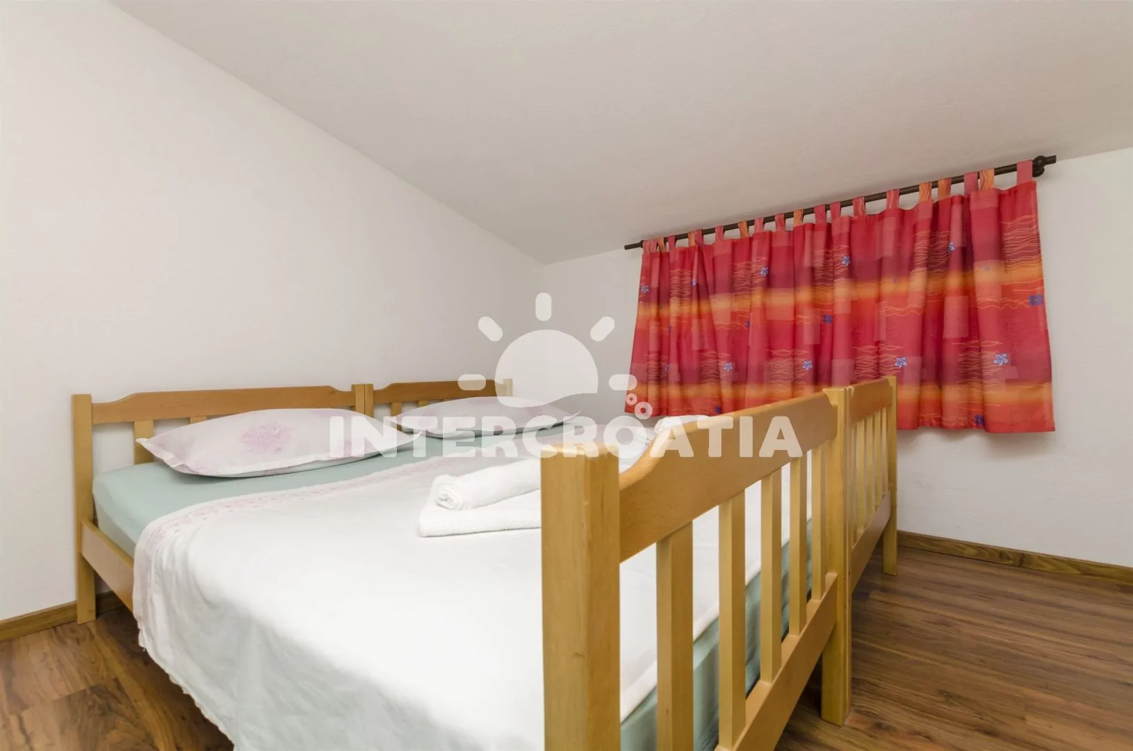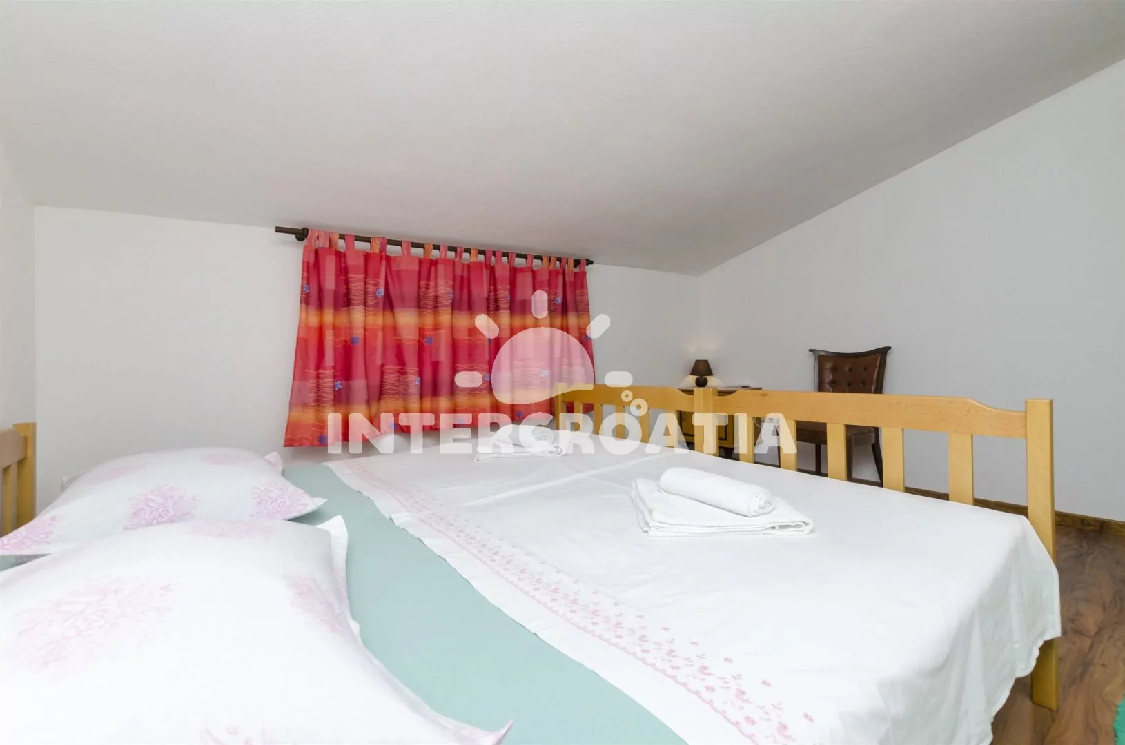 Apartmán (70 m2) s výhledem na moře a terasou s venkovním posezením se nachází ve třetím patře vily a je vhodný pro 4 až 6 osob. Obývací pokoj je spojený s kuchyní. Kuchyňská linka je vybavena sporákem, troubou, nádobím a lednicí s mrazákem. Obývací pokoj s jídelním stolem pro 4 osoby, pohovkou (rozložitelná na extra lůžko pro 2 osoby), televizí se satelitním programem, klimatizací a vstupem na terasu. První ložnice je vybavena jedním dvoulůžkem a vstupem na terasu. Druhá ložnice s dvěma jednolůžky. Koupelna se sprchovým koutem, umyvadlem a wc. Hostům je k dispozici parkování u objektu zdarma.