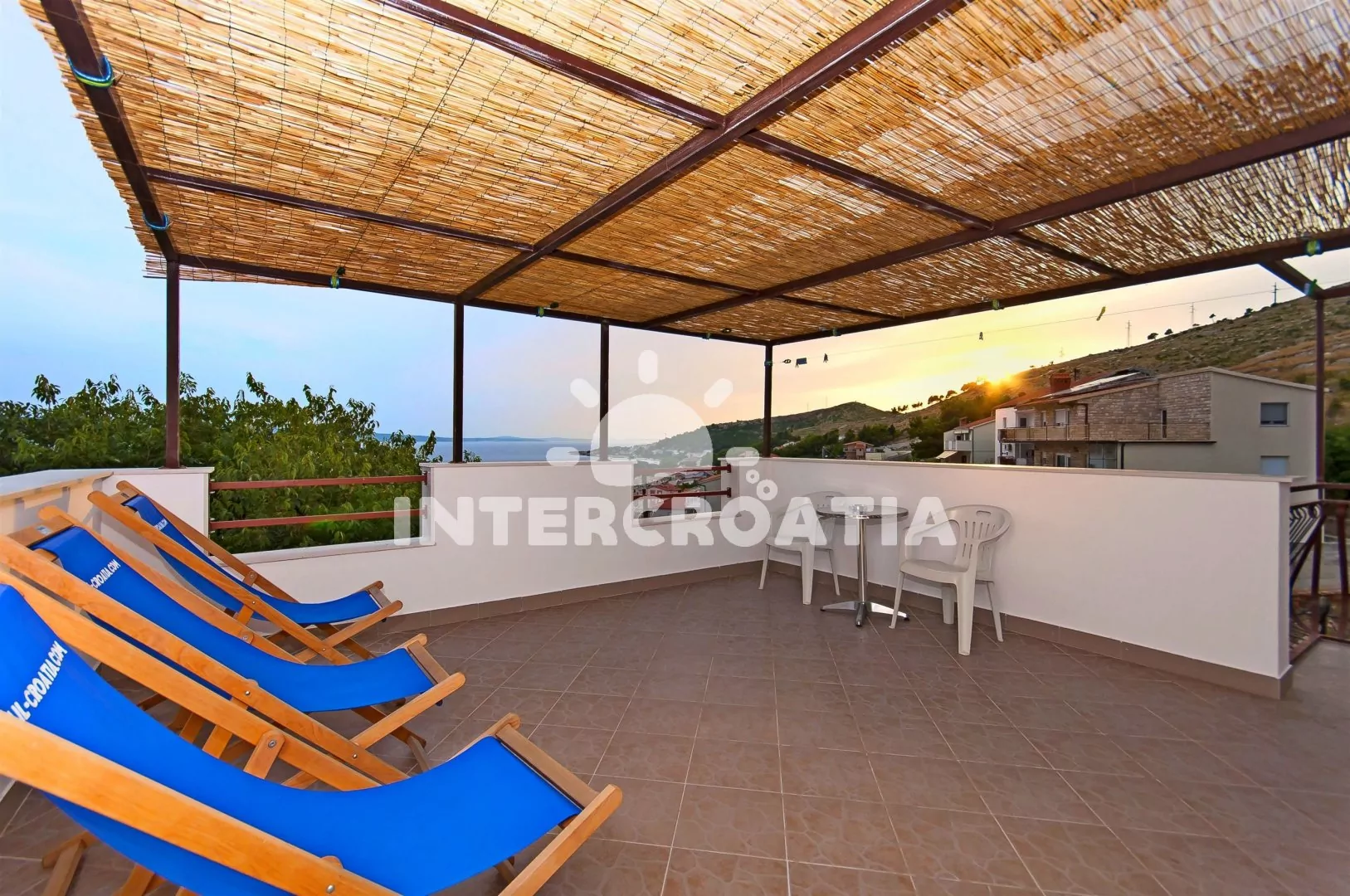 Apartmán má velkou terasu krásný výhled na moře a po okolí, příjemnou paní domácí Sandru