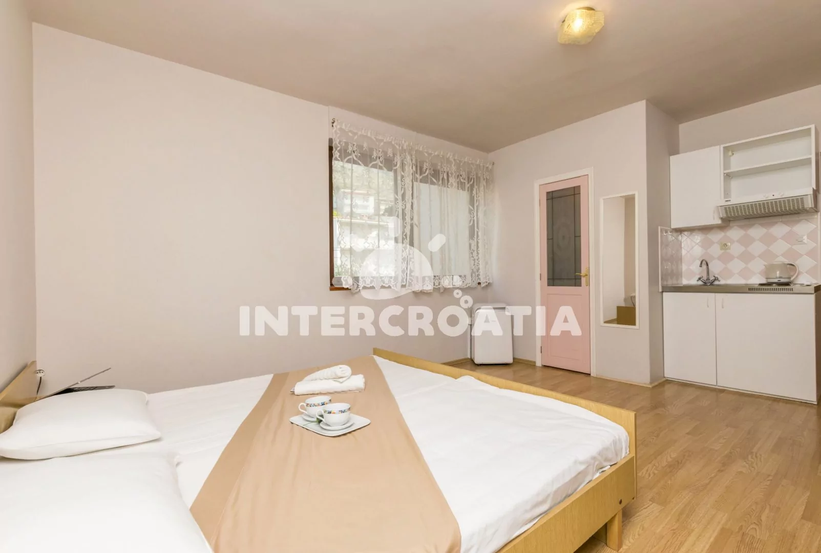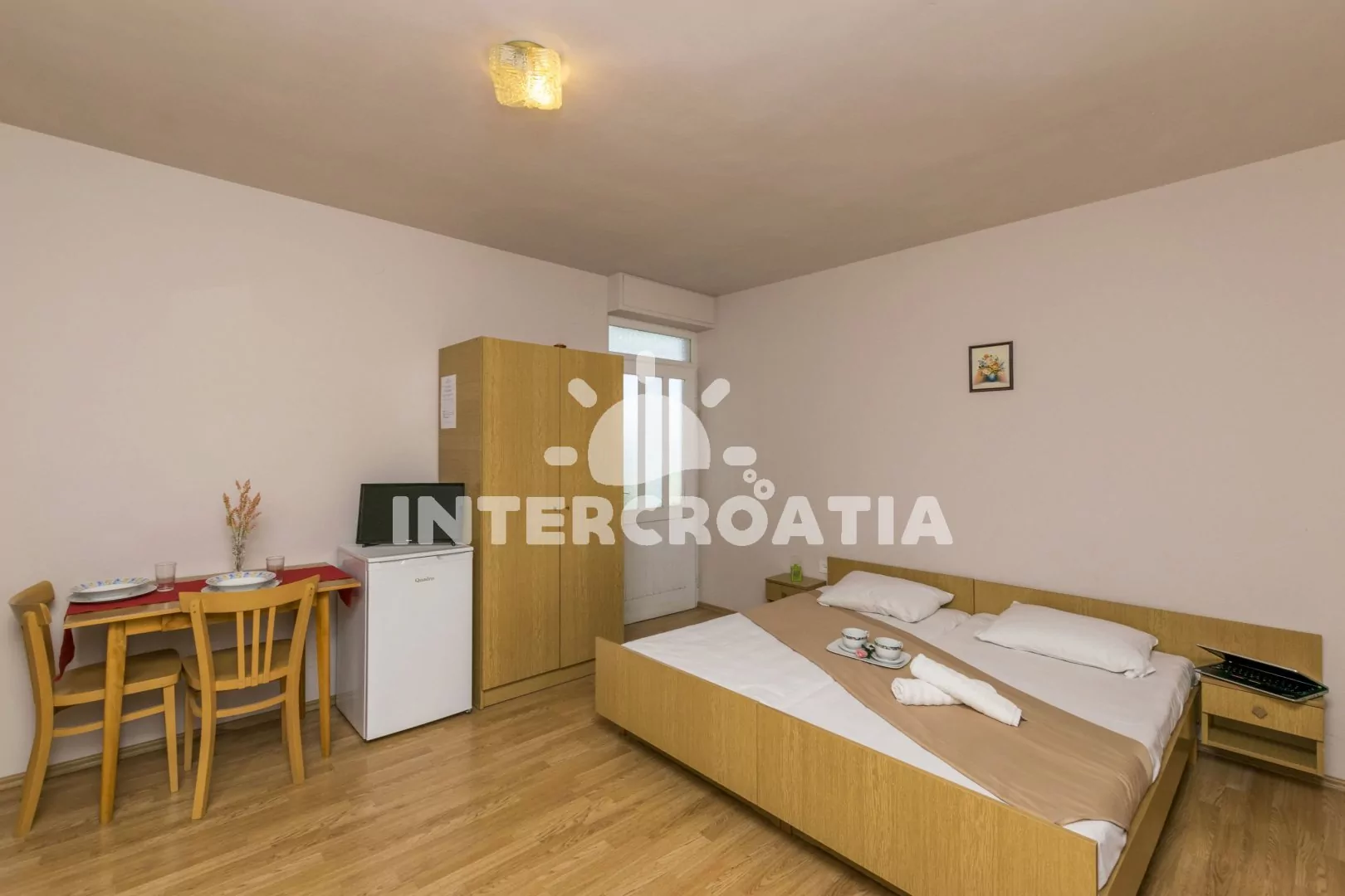 Apartmán (30 m2) typu studio, s balkonem a výhledem na moře je vhodný pro 2 až 3 osoby. Nachází se v prvním patře domu. Kuchyňská linka s elektrickým dvouplotýnkovým sporákem, digestoří, mikrovlnnou…