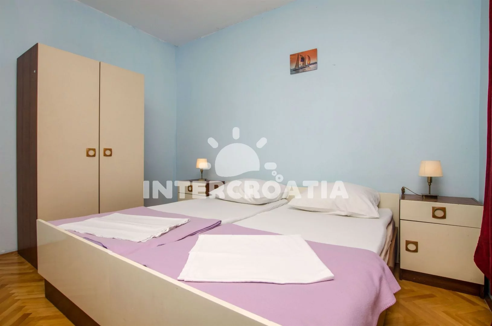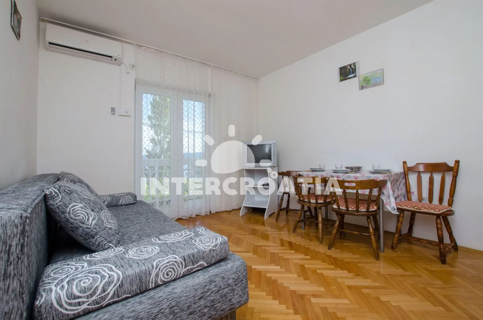 Apartmán v prvním patře domu s výhledem na moře a terasou je vhodný pro 2 až 4 osoby. Obývací pokoj je spojený s kuchyní. Kuchyňská linka s dvouplotýnkovým sporákem, kávovarem, rychlovarnou konvicí, nádobím a lednicí s mrazákem. Obývací pokoj s jídelním stolem pro 4 osoby, pohovkou (rozložitelná na extra lůžko pro 2 osoby), televizí, klimatizací a vstupem na terasu. Ložnice s jedním dvoulůžkem. Koupelna se sprchovým koutem, umyvadlem a wc. Hostům je k dispozici parkování u objektu zdarma.