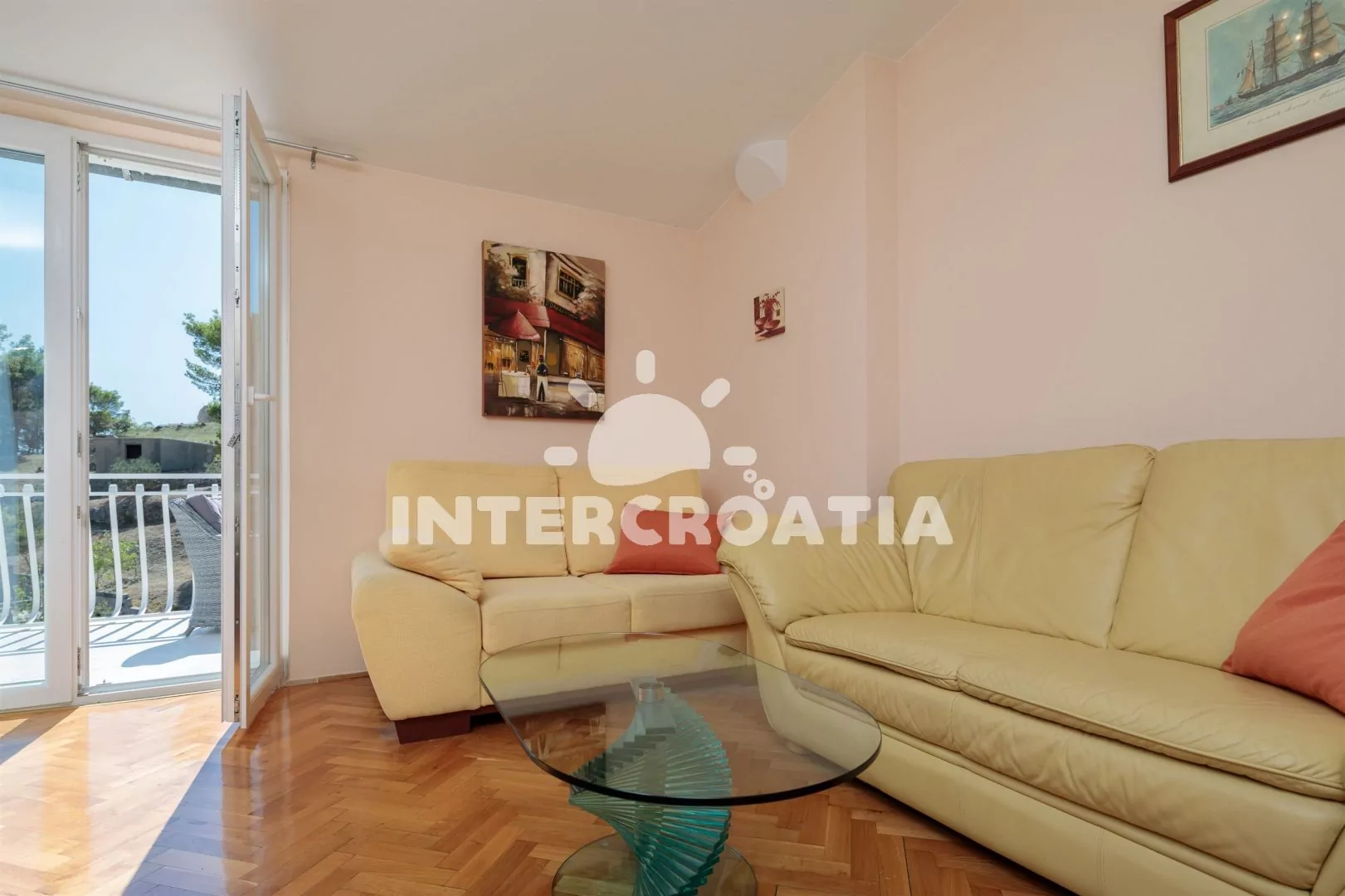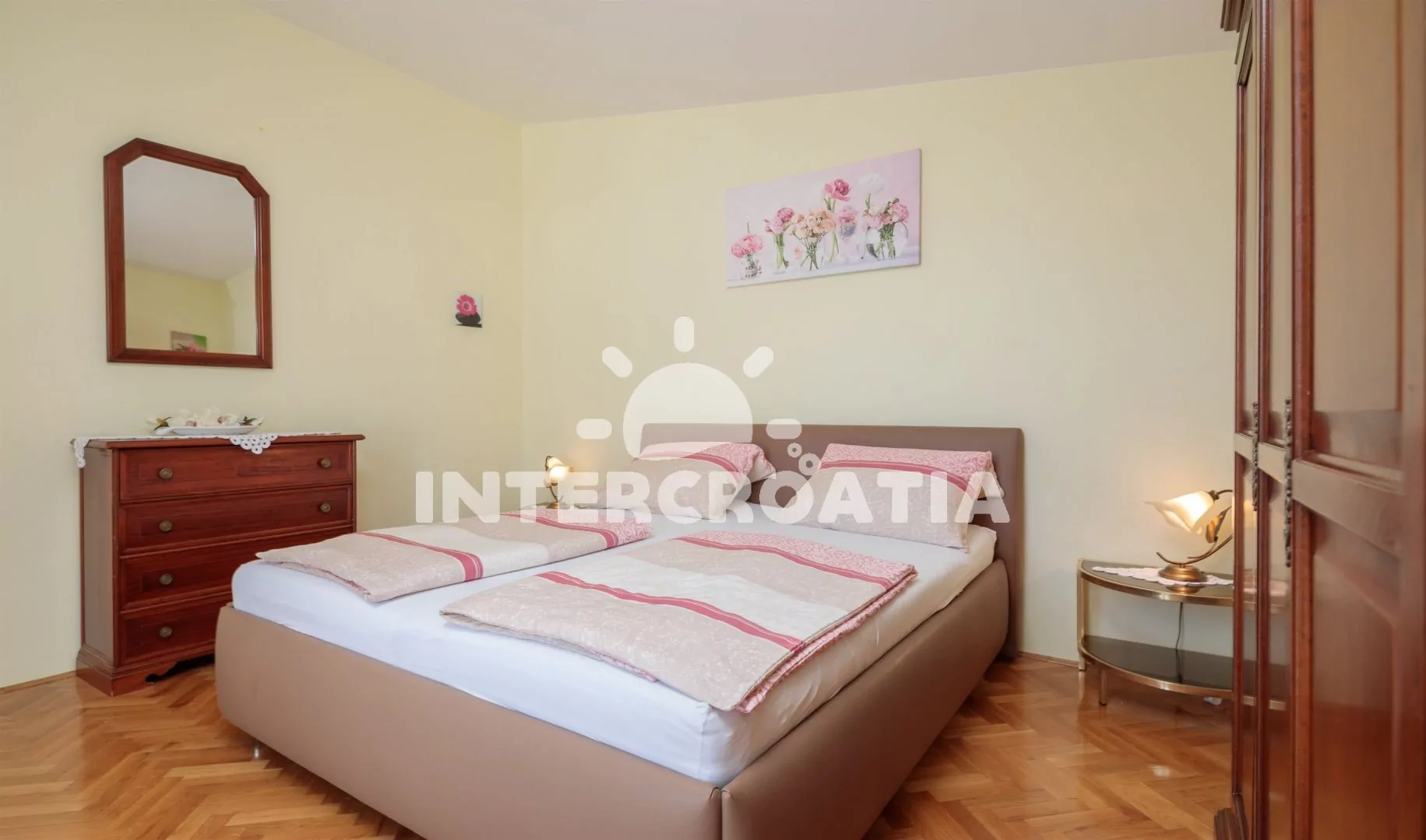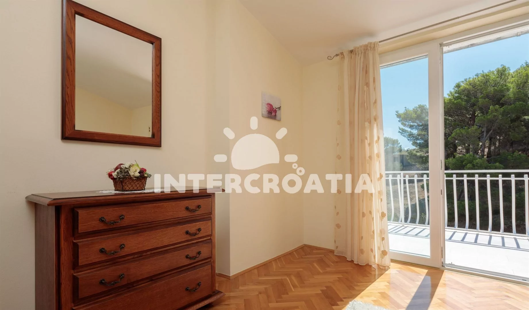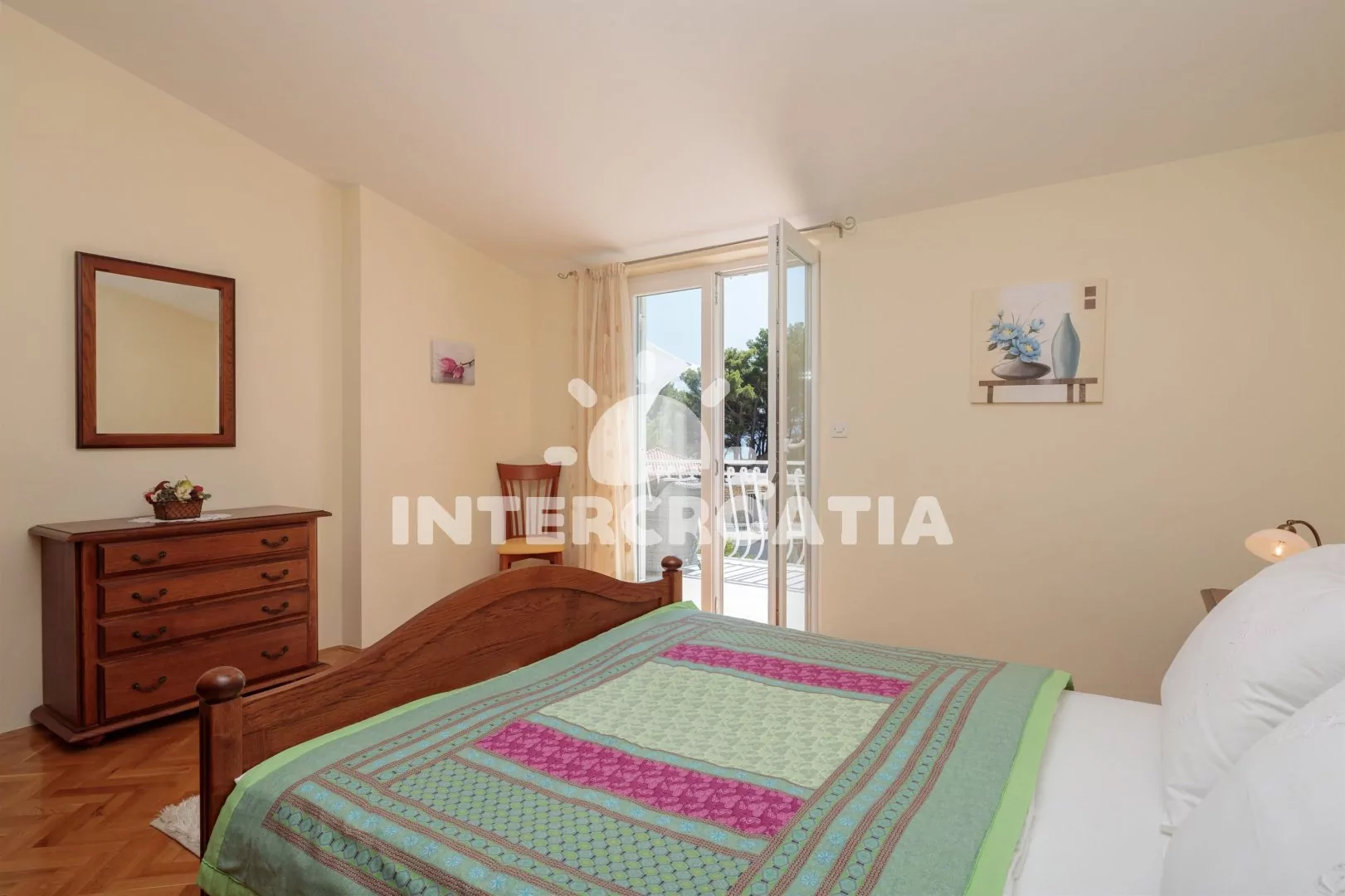 Nádherný apartmán s terasou, balkonem a výhledem na moře. Apartmán je vhodný pro 4 osoby a nachází se v třetím patře vily. Obývací pokoj je spojený s kuchyní. Kuchyňská linka je vybavena sklokeramickou varnou deskou, komínovou digestoří, vestavěnou troubou, myčkou na nádobí, rychlovarnou konvicí, nádobím a lednicí s mrazákem. Obývací pokoj s jídelním stolem pro 4 osoby, sedací soupravou, pohovkou, televizí se satelitním programem, klimatizací a vstupem na balkon. První ložnice s jedním dvoulůžkem a vstupem na balkon. Druhá ložnice s dvoulůžkem a vstupem na terasu. Koupelna se sprchovým koutem, umyvadlem, bidetem a wc. Hostům je k dispozici parkování u objektu zdarma.