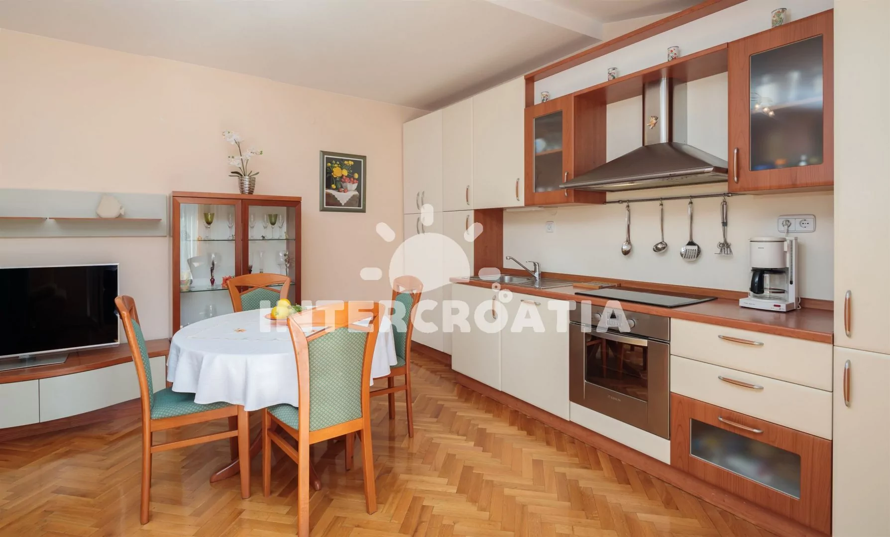 Nádherný apartmán s terasou, balkonem a výhledem na moře. Apartmán je vhodný pro 4 osoby a nachází se v třetím patře vily. Obývací pokoj je spojený s kuchyní. Kuchyňská linka je vybavena…