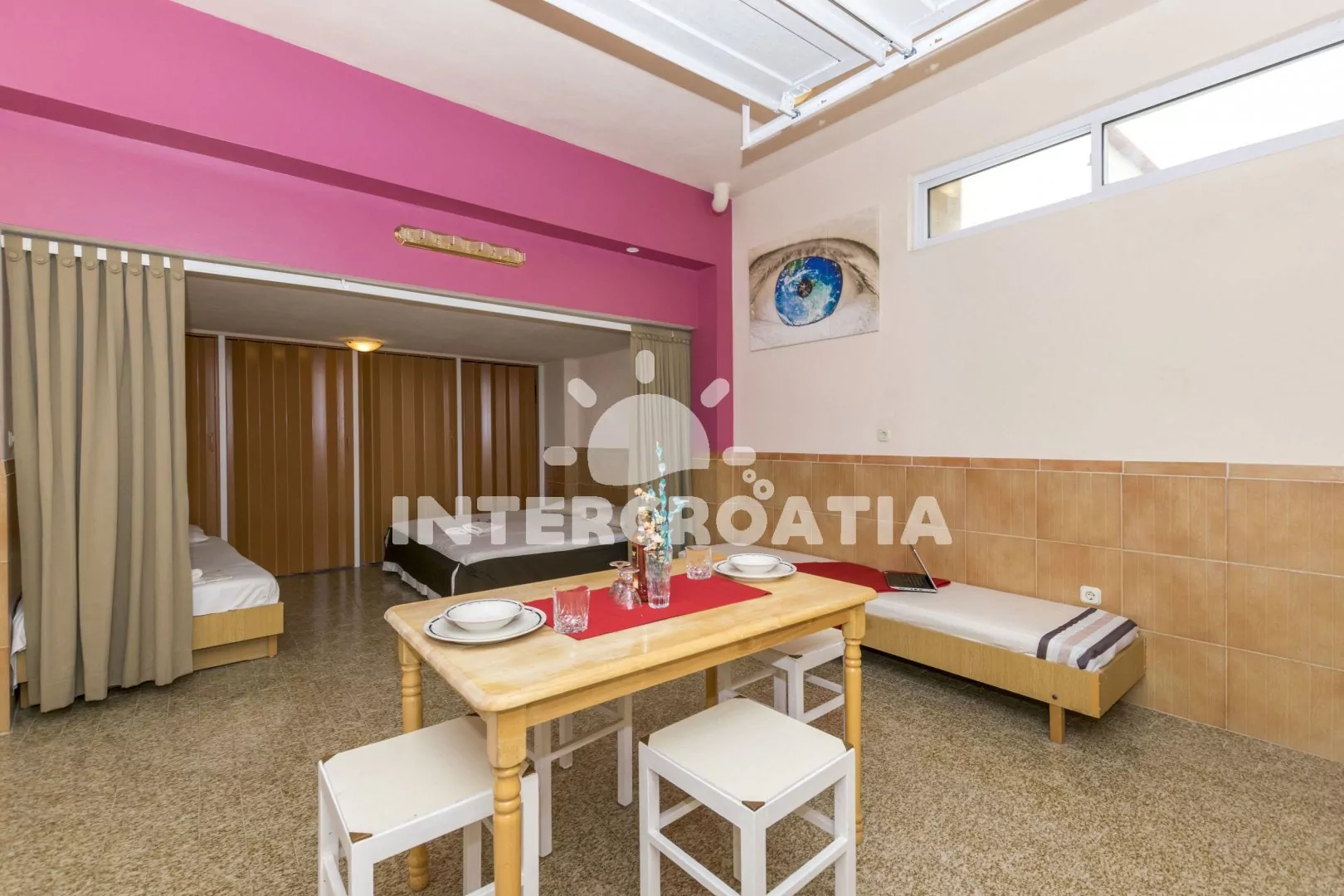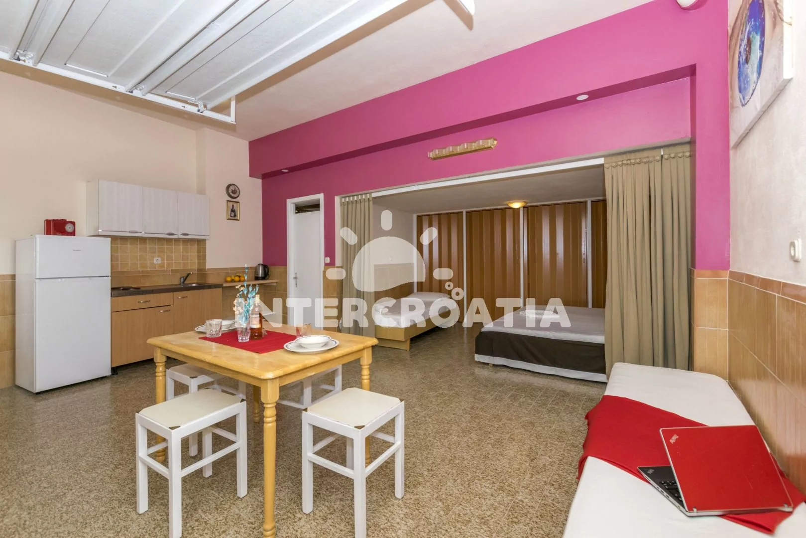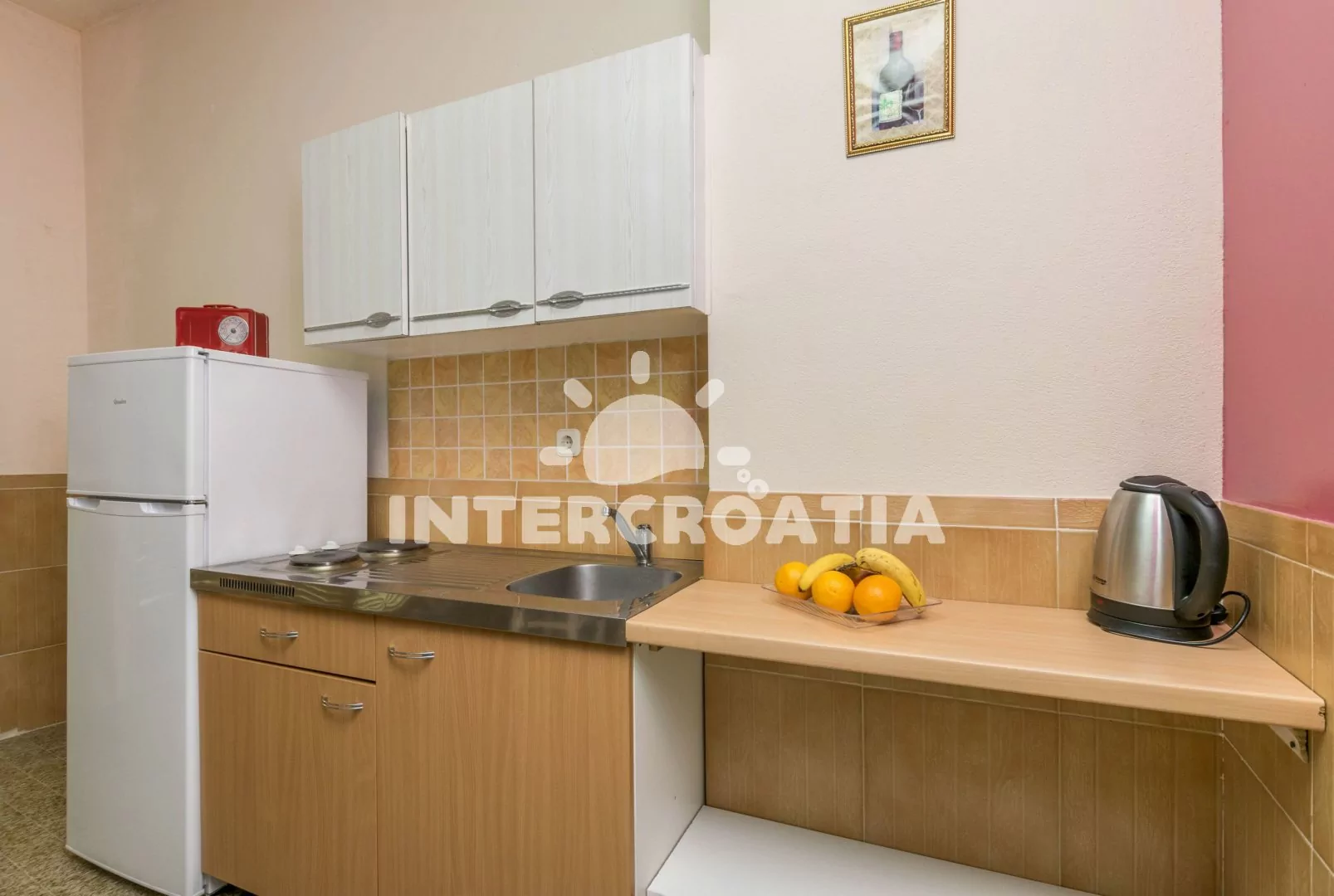 Apartmán typu studio s výhledem na moře a vlastní terasou s posezením, nachází se v přízemí domu. Obývací místnost je spojena s kuchyní. Kuchyňská linka je vybavena dvouplotýnkovým sporákem,…