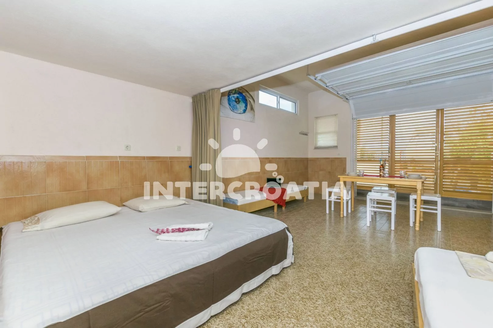 Apartmán typu studio s výhledem na moře a vlastní terasou s posezením, nachází se v přízemí domu. Obývací místnost je spojena s kuchyní. Kuchyňská linka je vybavena dvouplotýnkovým sporákem, rychlovarnou konvicí, nádobím a lednicí s mrazákem. Obývací pokoj s jídelním stolem pro 4 osoby, televizí, jedním dvoulůžkem a jednou přistýlkou (extra lůžko pro 1 osobu). Koupelna se sprchovým koutem, umyvadlem a wc. Hostům je k dispozici parkování u objektu zdarma.