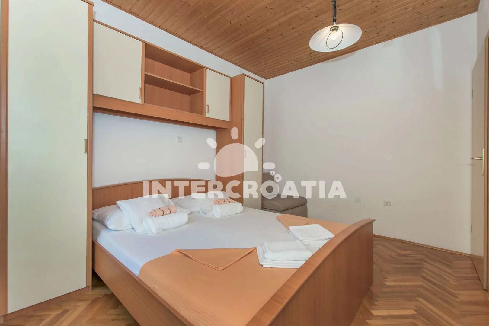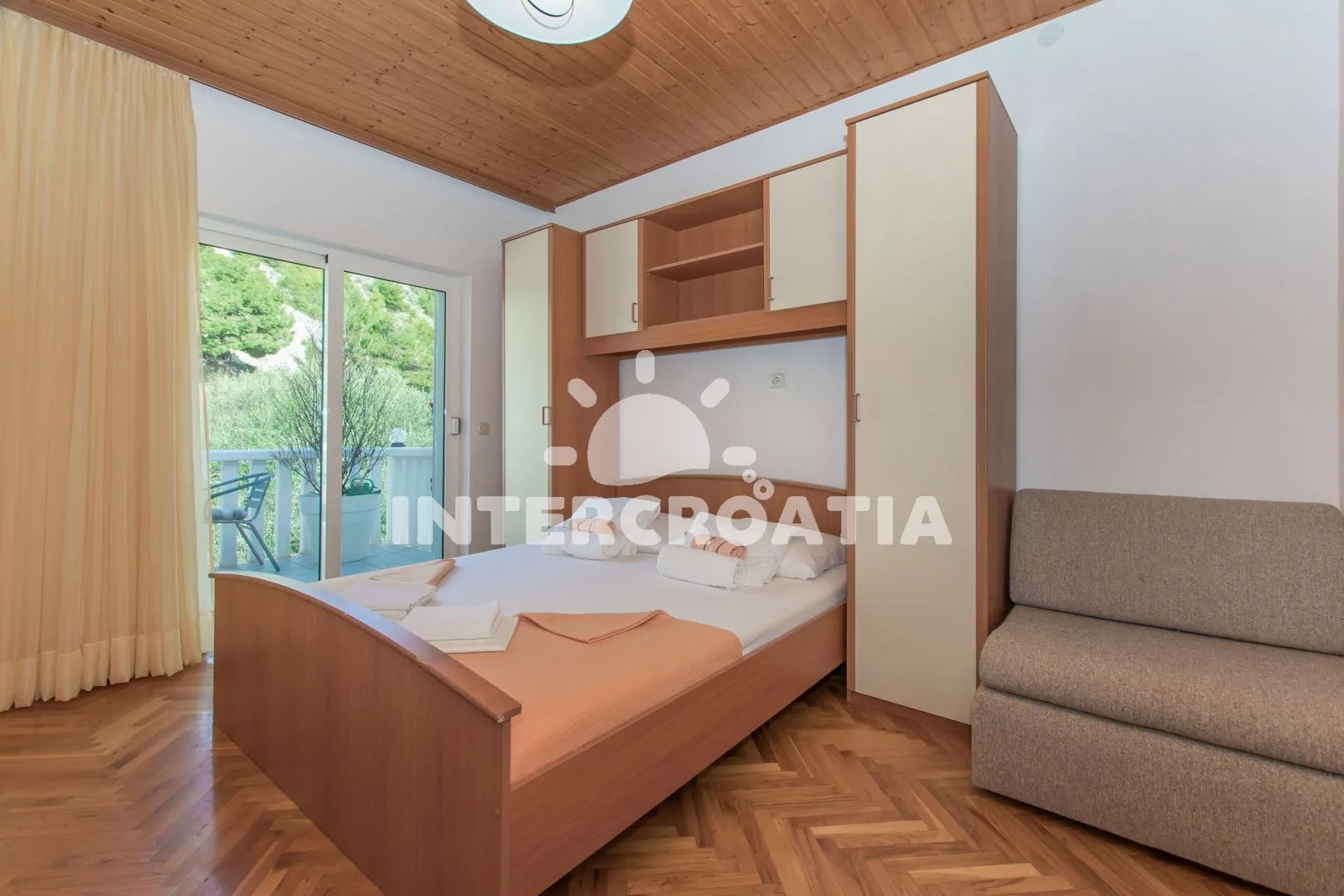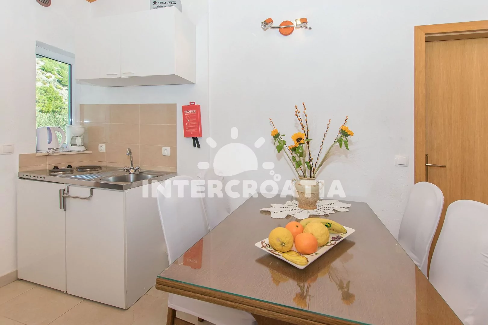 Apartmán (35 m2) s terasou, posezením a výhledem na moře se nachází ve 3. patře domu. Apartmán má 2 ložnice, 2 koupelny a je vhodný pro až 4 osoby. Obývací místnost je spojena s kuchyní. Kuchyňská linka je vybavena dvouplotýnkovým vařičem, rychlovarnou konvicí, kávovarem, nádobím a lednicí s mrazákem. Obývací místnost s jídelním stolem, televizí se satelitním programem a klimatizací. První i druhá ložnice je vybavena vždy s jedním dvoulůžkem a vstupem na terasu. Dvě koupelny se sprchovým koutem, umyvadlem a wc. Hostům je k dispozici parkování u objektu zdarma.