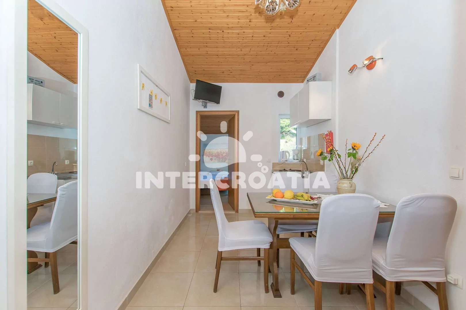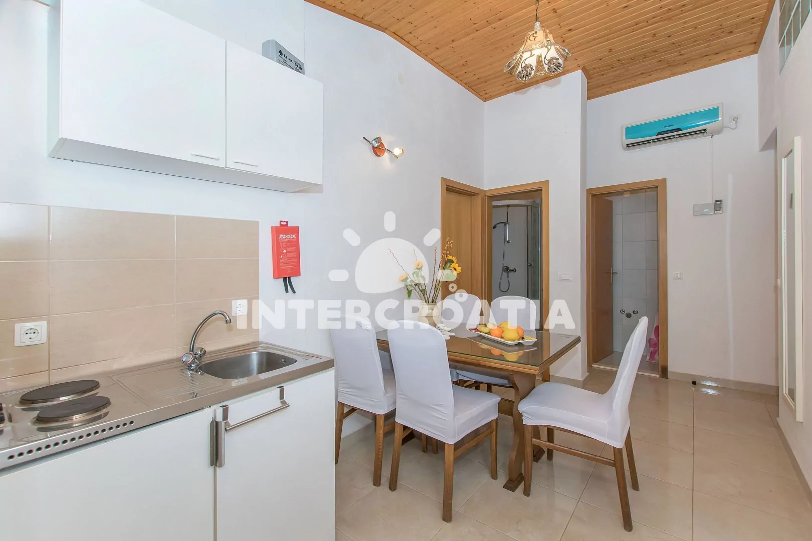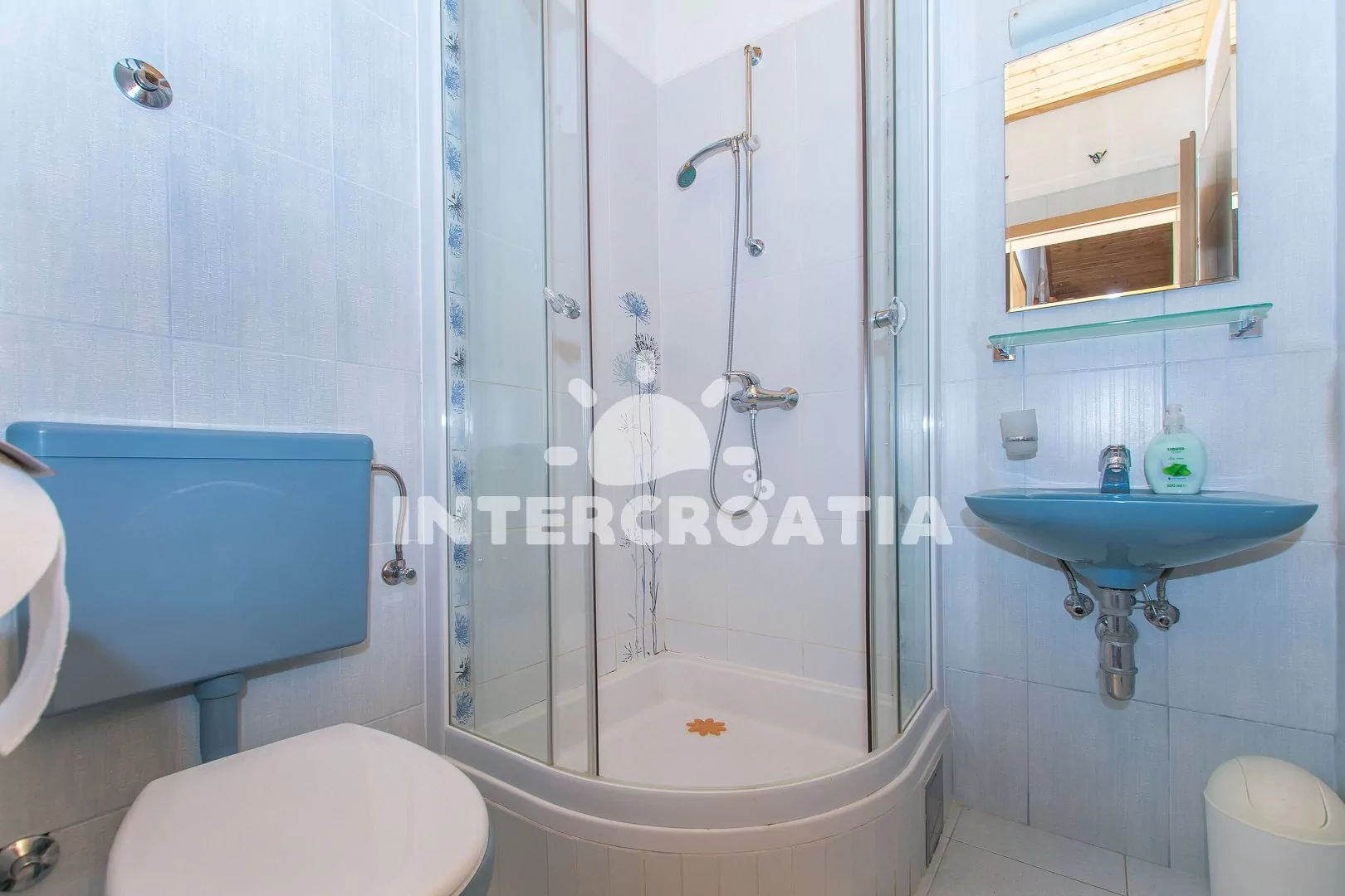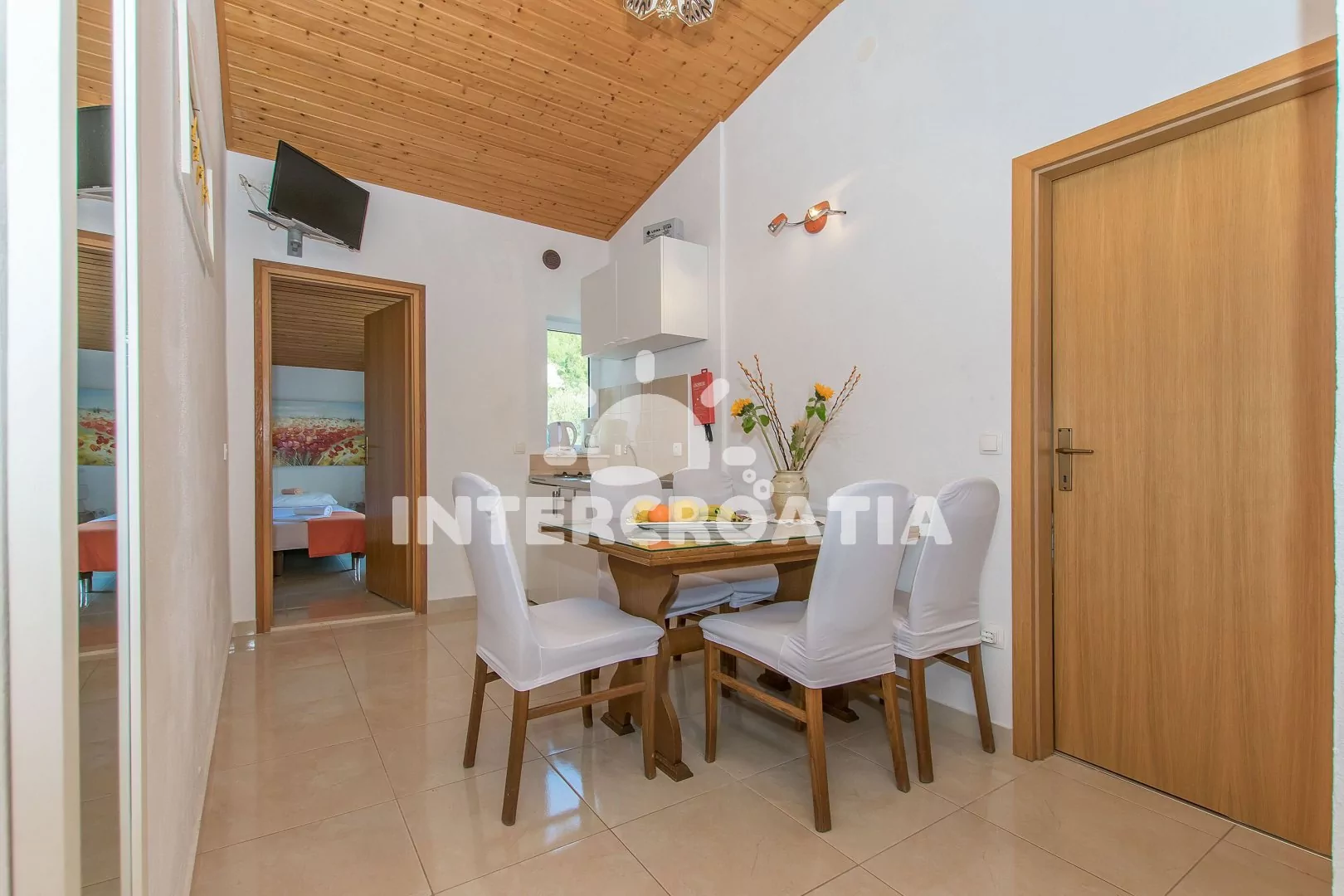 Apartmán (35 m2) s terasou, posezením a výhledem na moře se nachází ve 3. patře domu. Apartmán má 2 ložnice, 2 koupelny a je vhodný pro až 4 osoby. Obývací místnost je spojena s kuchyní. Kuchyňská linka je vybavena dvouplotýnkovým vařičem, rychlovarnou konvicí, kávovarem, nádobím a lednicí s mrazákem. Obývací místnost s jídelním stolem, televizí se satelitním programem a klimatizací. První i druhá ložnice je vybavena vždy s jedním dvoulůžkem a vstupem na terasu. Dvě koupelny se sprchovým koutem, umyvadlem a wc. Hostům je k dispozici parkování u objektu zdarma.