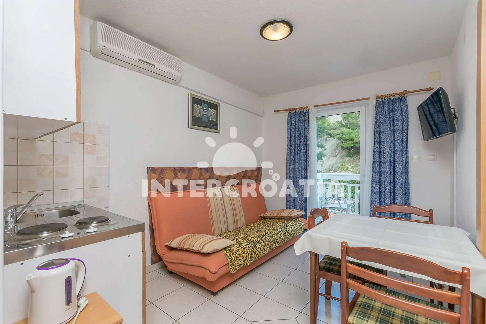 Apartmán (22 m2) s balkonem, posezením a výhledem do krajiny se nachází ve 3. patře domu. Apartmán má 1 ložnici a je vhodný pro 2 až 3 osoby. Obývací pokoj je spojený s kuchyní. Kuchyňská linka je vybavena dvouplotýnkovým vařičem, rychlovarnou konvicí, kávovarem, nádobím a lednicí s mrazákem. Obývací pokoj s jídelním stolem pro 3 osoby, pohovkou (rozložitelná na extra lůžko pro 1 osobu), televizí se satelitním programem, klimatizací a vstupem na balkon. Ložnice s jedním dvoulůžkem. Koupelna se sprchovým koutem, umyvadlem, fénem a wc. Hostům je k dispozici parkování u objektu zdarma.