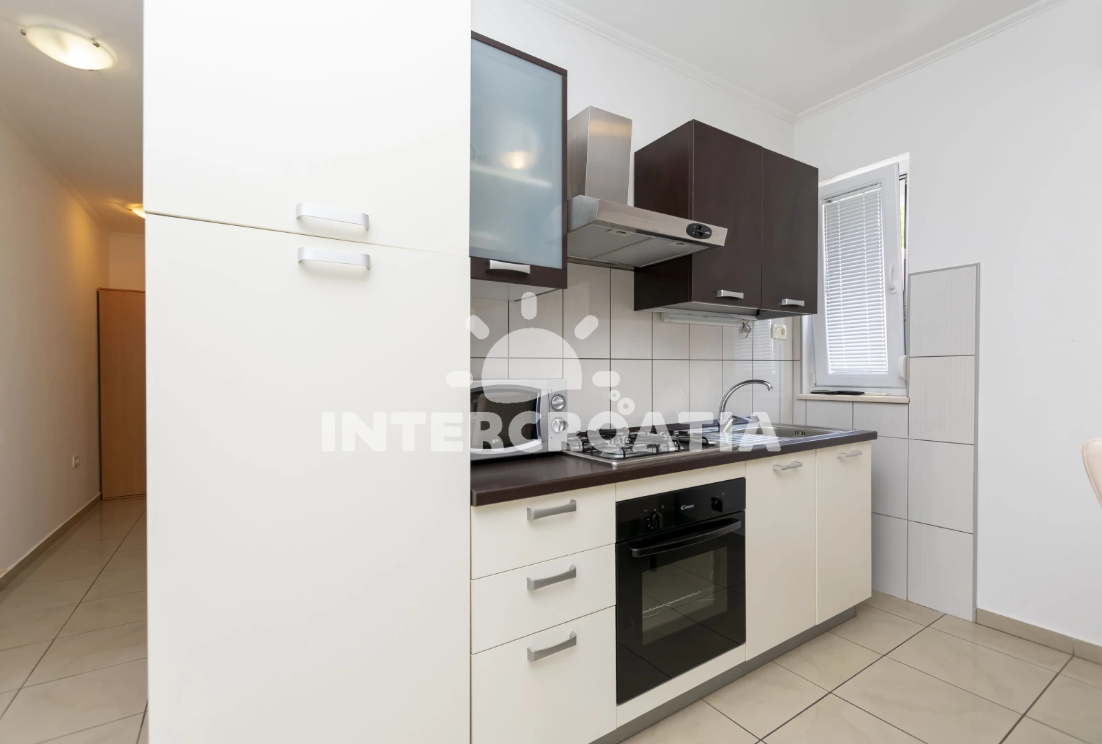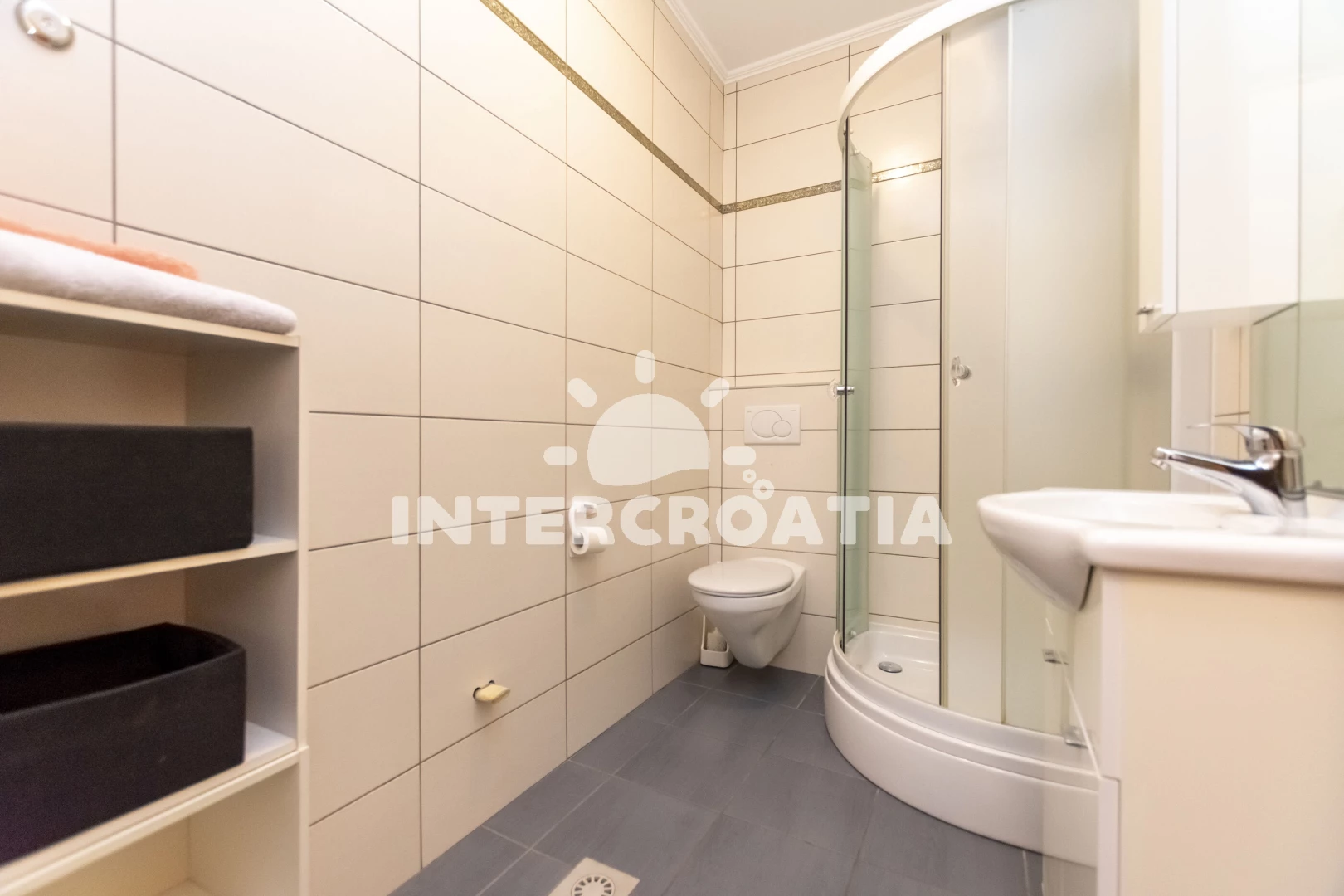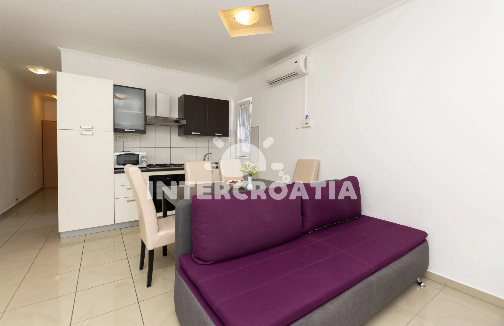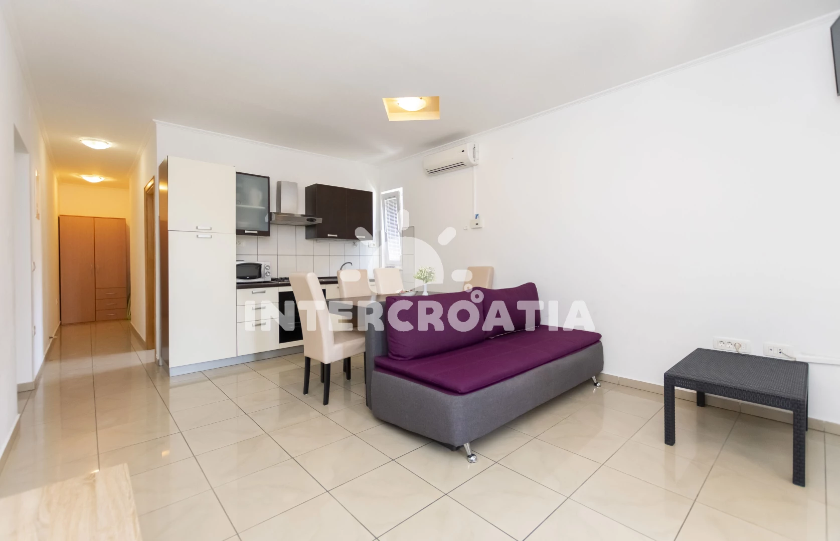 Apartmán (65 m2) s terasou, posezením a výhledem do klidné ulice se nachází v přízemí domu. Apartmán má 1 ložnici a je vhodný pro až 4 osoby. Obývací pokoj je spojený s kuchyní. Kuchyňská linka je vybavena varnou deskou, digestoří, vestavěnou troubou, rychlovarnou konvicí, mikrovlnnou troubou, kávovarem, nádobím a lednicí s mrazákem. Obývací pokoj s jídelním stolem, pohovkou (rozložitelná na extra lůžko pro 2 osoby), televizí, klimatizací a vstupem na terasu. Ložnice s jedním dvoulůžkem. Koupelna se sprchovým koutem, umyvadlem, fénem a wc.