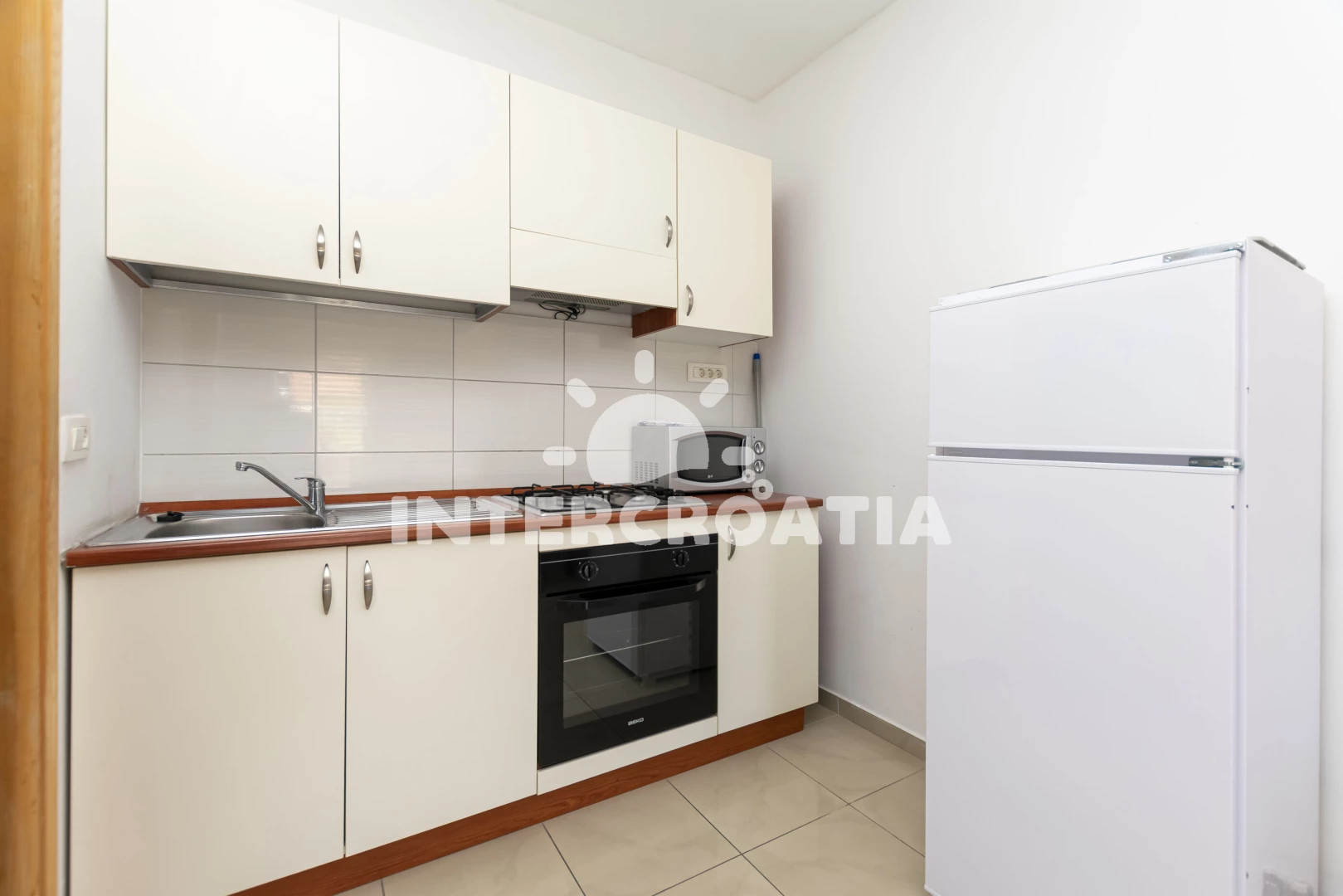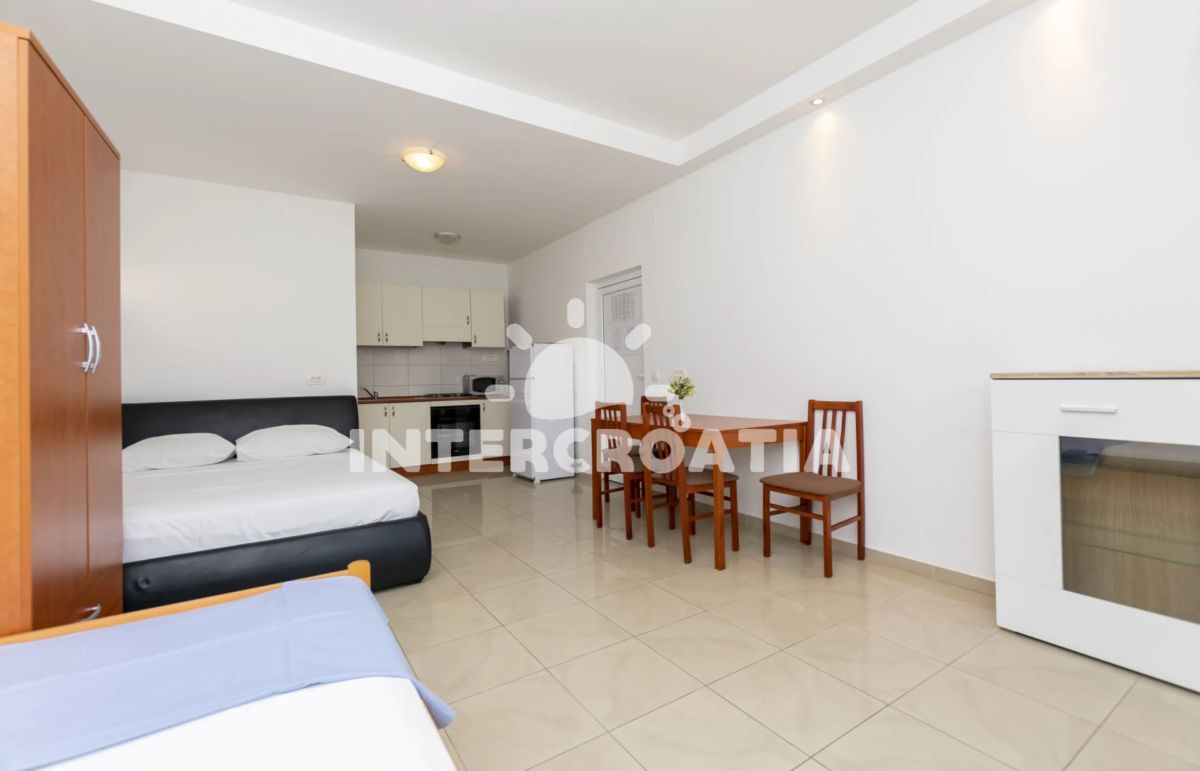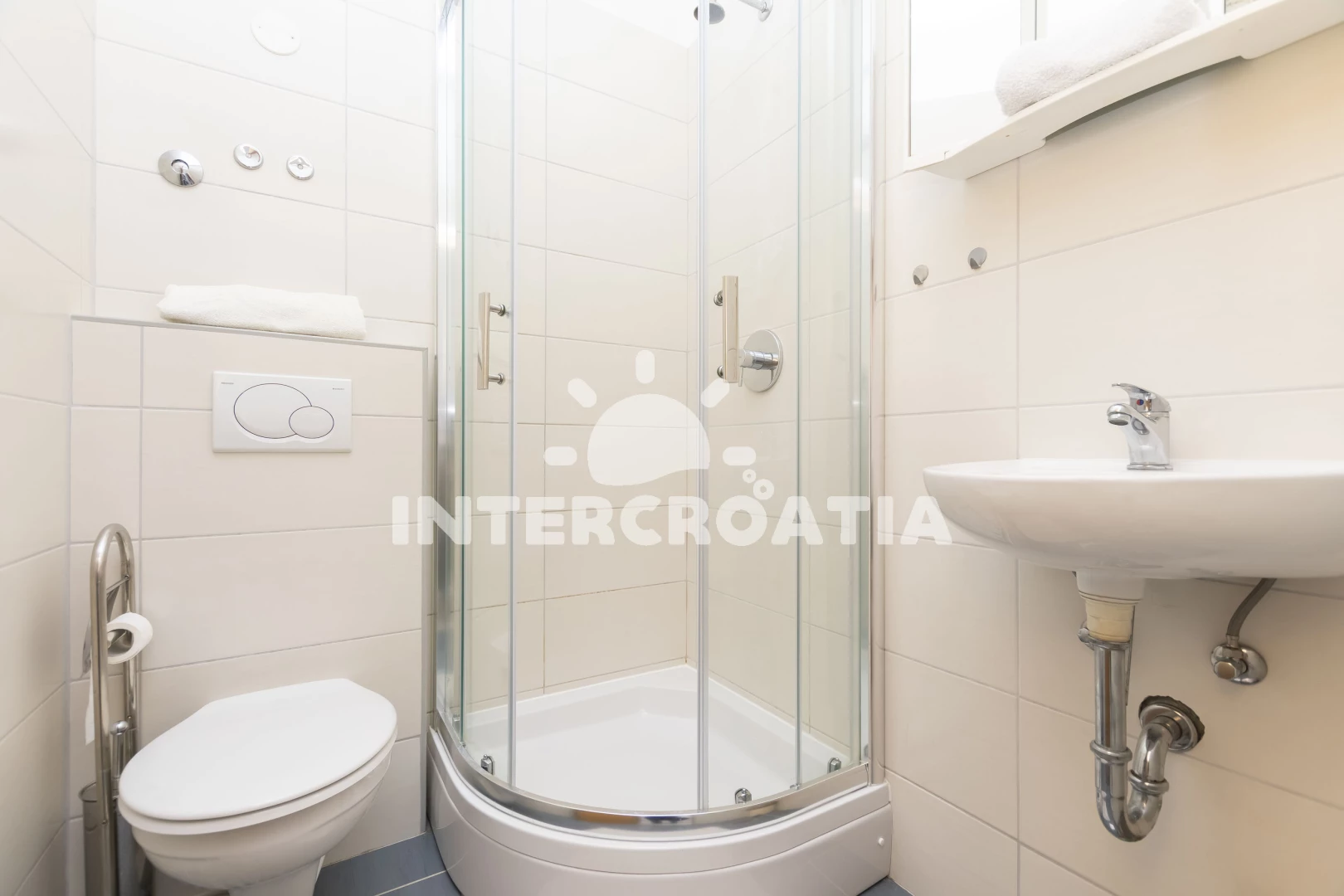 Apartmán (32 m2) typu studio s terasou, posezením a výhledem do klidné ulice se nachází v přízemí domu. Obývací místnost je spojena s kuchyní. Kuchyňská linka je vybavena varnou deskou, digestoří, vestavěnou troubou, rychlovarnou konvicí, mikrovlnnou troubou, kávovarem, nádobím a lednicí s mrazákem. Obývací místnost s jídelním stolem, dvoulůžkem, televizí, klimatizací a vstupem na terasu. Koupelna se sprchovým koutem, umyvadlem, fénem a wc.
