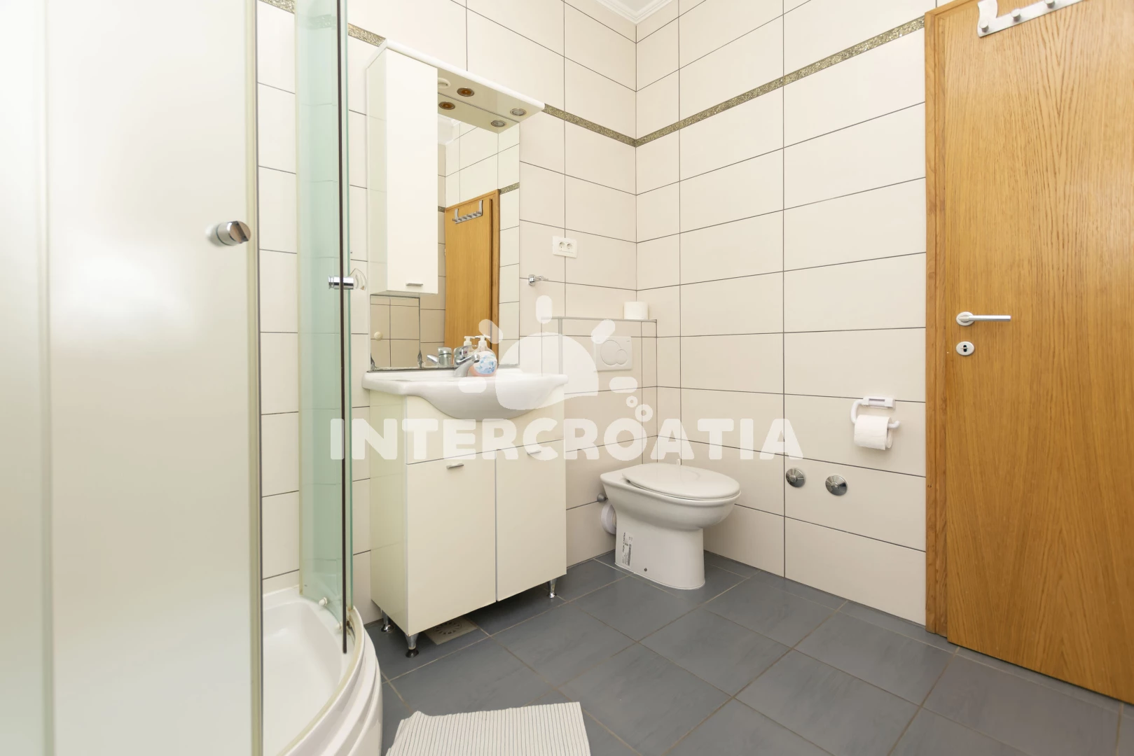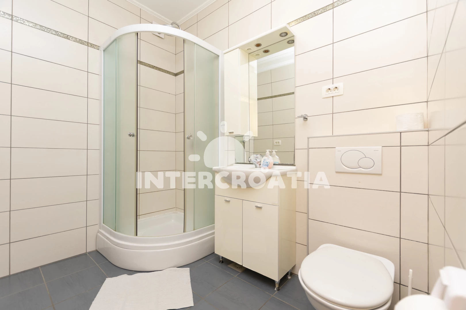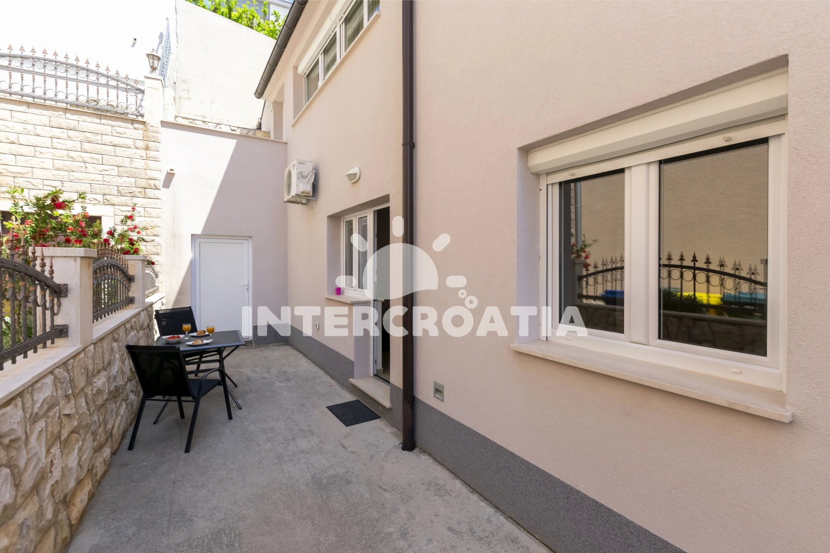 Apartmán (35 m2) s terasou, posezením a výhledem do klidné ulice se nachází v přízemí domu. Apartmán má 1 ložnici a je vhodný pro až 4 osoby. Obývací pokoj je spojený s kuchyní. Kuchyňská linka je vybavena varnou deskou, digestoří, vestavěnou troubou, rychlovarnou konvicí, mikrovlnnou troubou, kávovarem, nádobím a lednicí s mrazákem. Obývací pokoj s jídelním stolem, pohovkou (rozložitelná na extra lůžko pro 2 osoby), televizí, klimatizací a vstupem na terasu. Ložnice s jedním dvoulůžkem. Koupelna se sprchovým koutem, umyvadlem, fénem a wc.