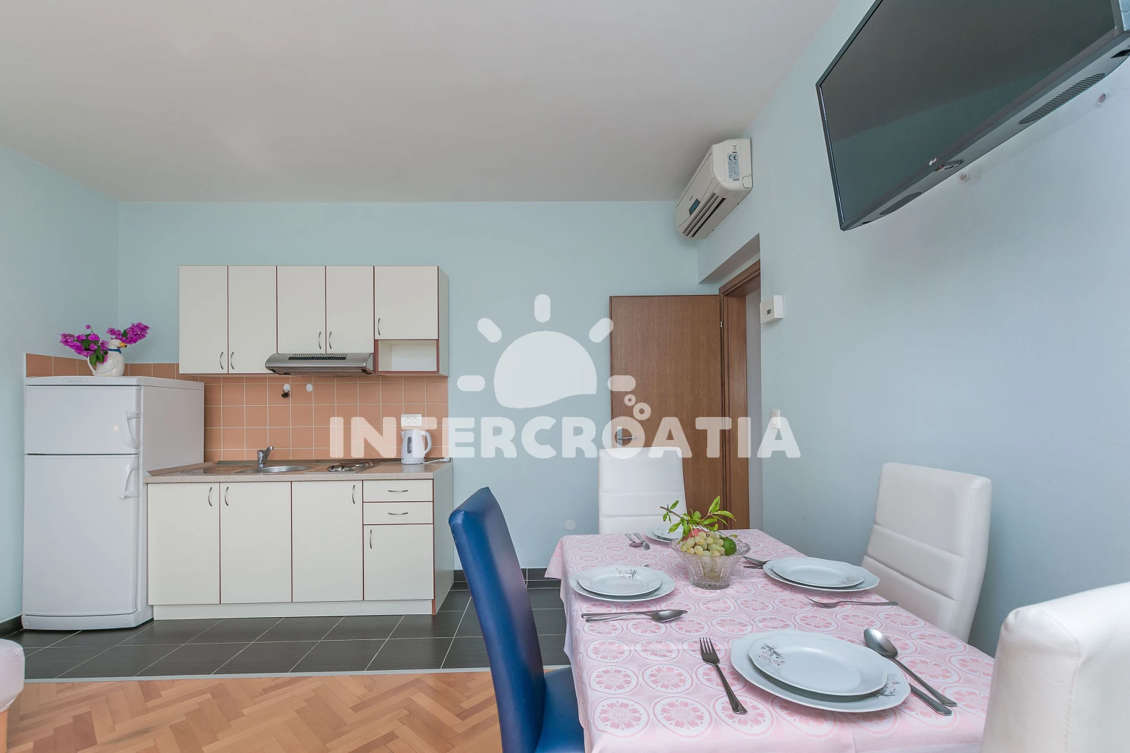 Apartmán (40 m2) s balkonem, a výhledem na moře. Nachází se v 1. patře objektu. Apartmán má 1 ložnici a je vhodný pro až 4 osoby. Kuchyňská linka je vybavena varnou deskou, kávovarem, mikrovlnnou… Více informací