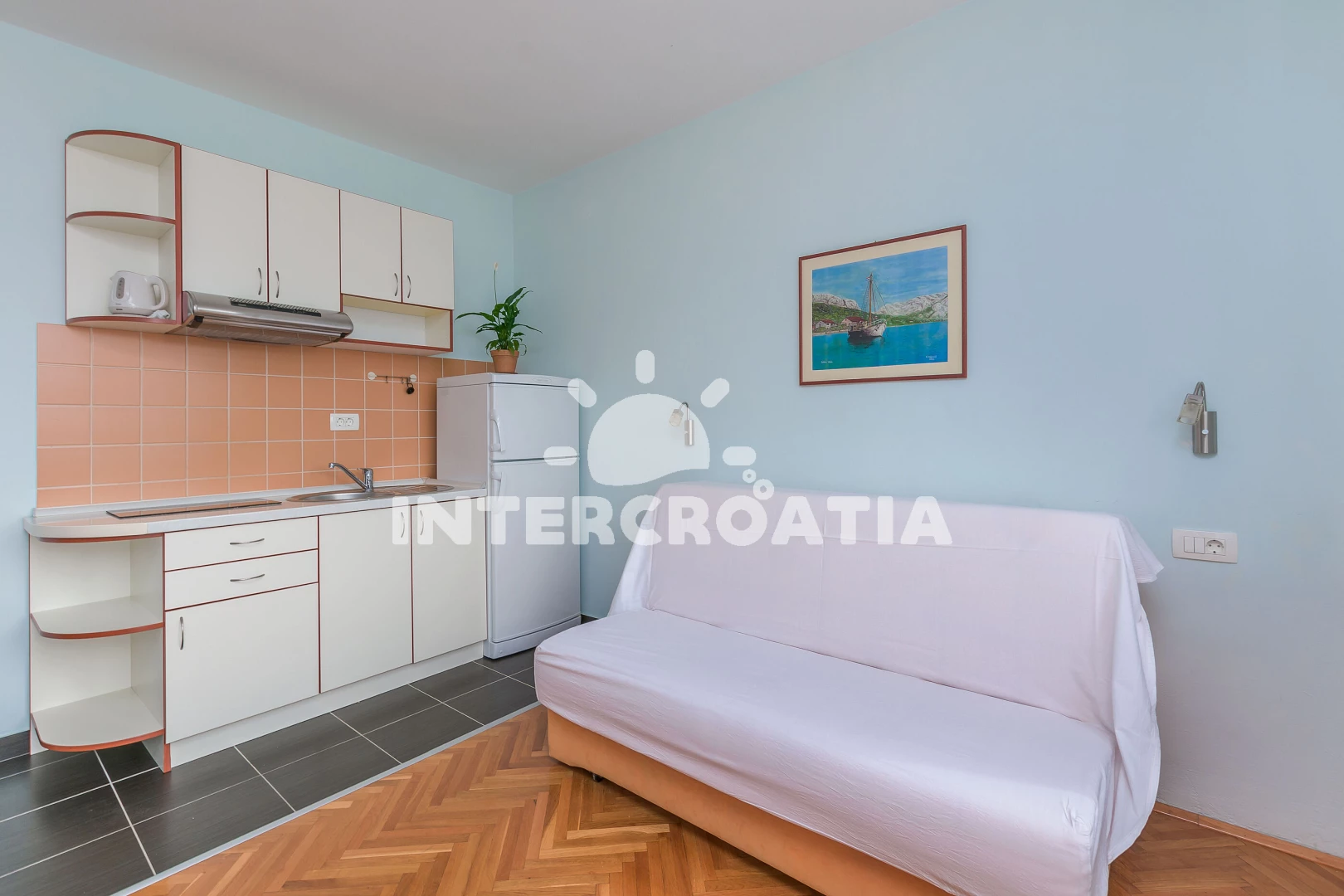 Vzdálenosti: Moře 40 m, pláž 40 m (písek), veřejná doprava 20 m, kotviště pro čluny 40 m, půjčovna motorových člunů 70 m, bar 250 m, restaurace 400 m, centrum 450 m, supermarket 450 m, směnárna 450 m, půjčovna kol 450 m, potápění 500 m, čerpací stanice 800 m, pošta 1 km, ambulance 1 km, lékárna 1 km, diskotéka 2 km, banka 3 km, muzeum 3 km, tenisové kurty 3 km, marina 3 km, trajekt (Split) 25,0 km, letiště (Split) 45 km, park Plitvice 80 km,