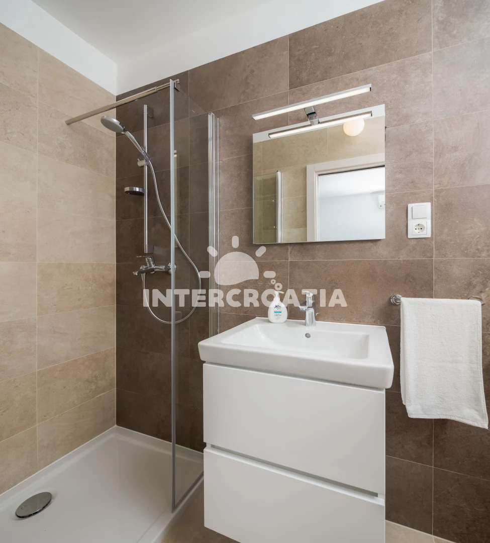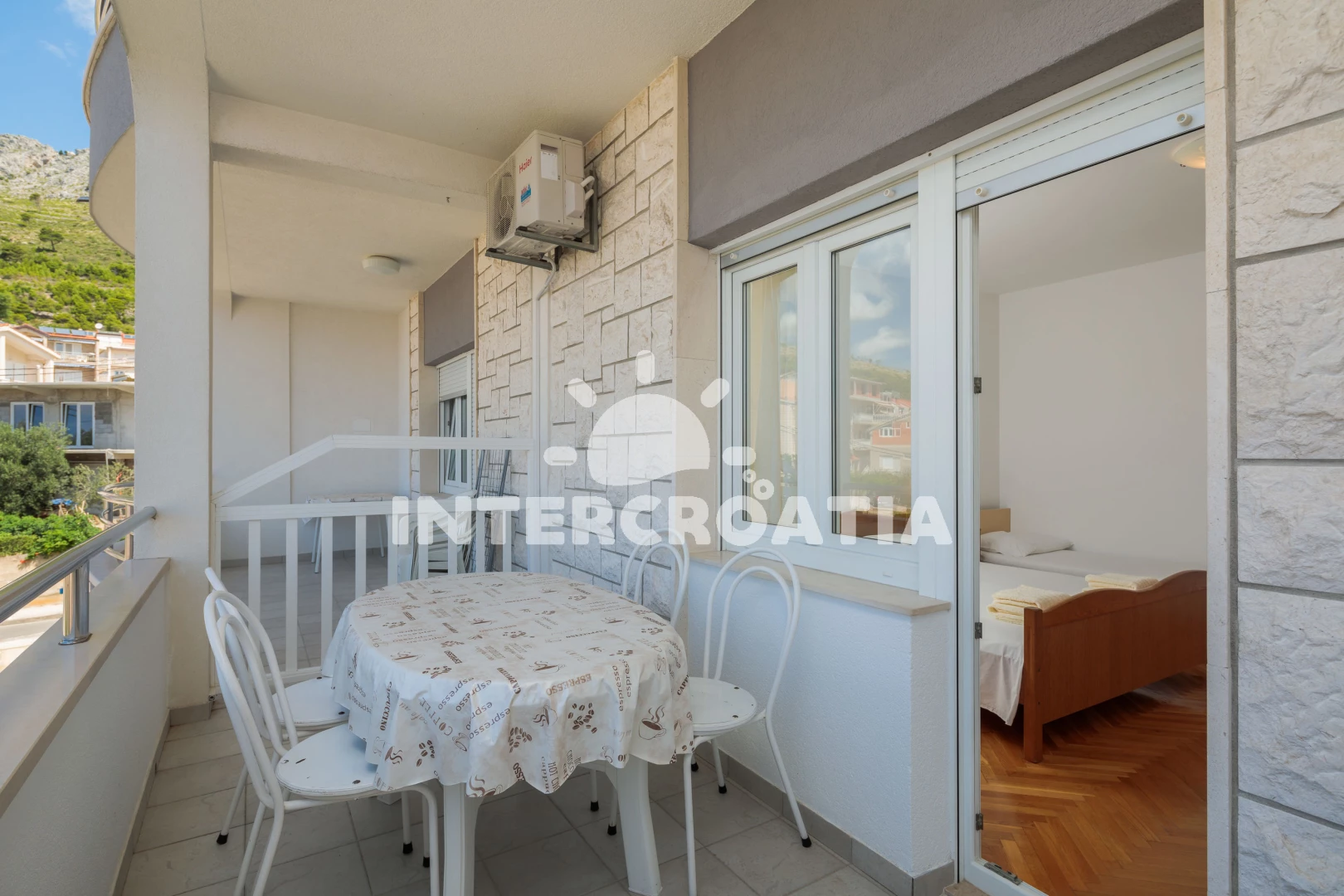 Vzdálenosti: Moře 80 m, pláž 90 m (písek), restaurace 30 m, veřejná doprava 50 m, bar 70 m, půjčovna motorových člunů 100 m, tenisové kurty 300 m, čerpací stanice 500 m, supermarket 500 m, lékárna 600 m, půjčovna kol 700 m, směnárna 700 m, banka 750 m, centrum 1,2 km, pošta 1,4 km, ambulance 2,0 km, muzeum 2 km, marina 2,5 km, trajekt (Split) 25 km, diskotéka 27 km, letiště (Split) 45 km,