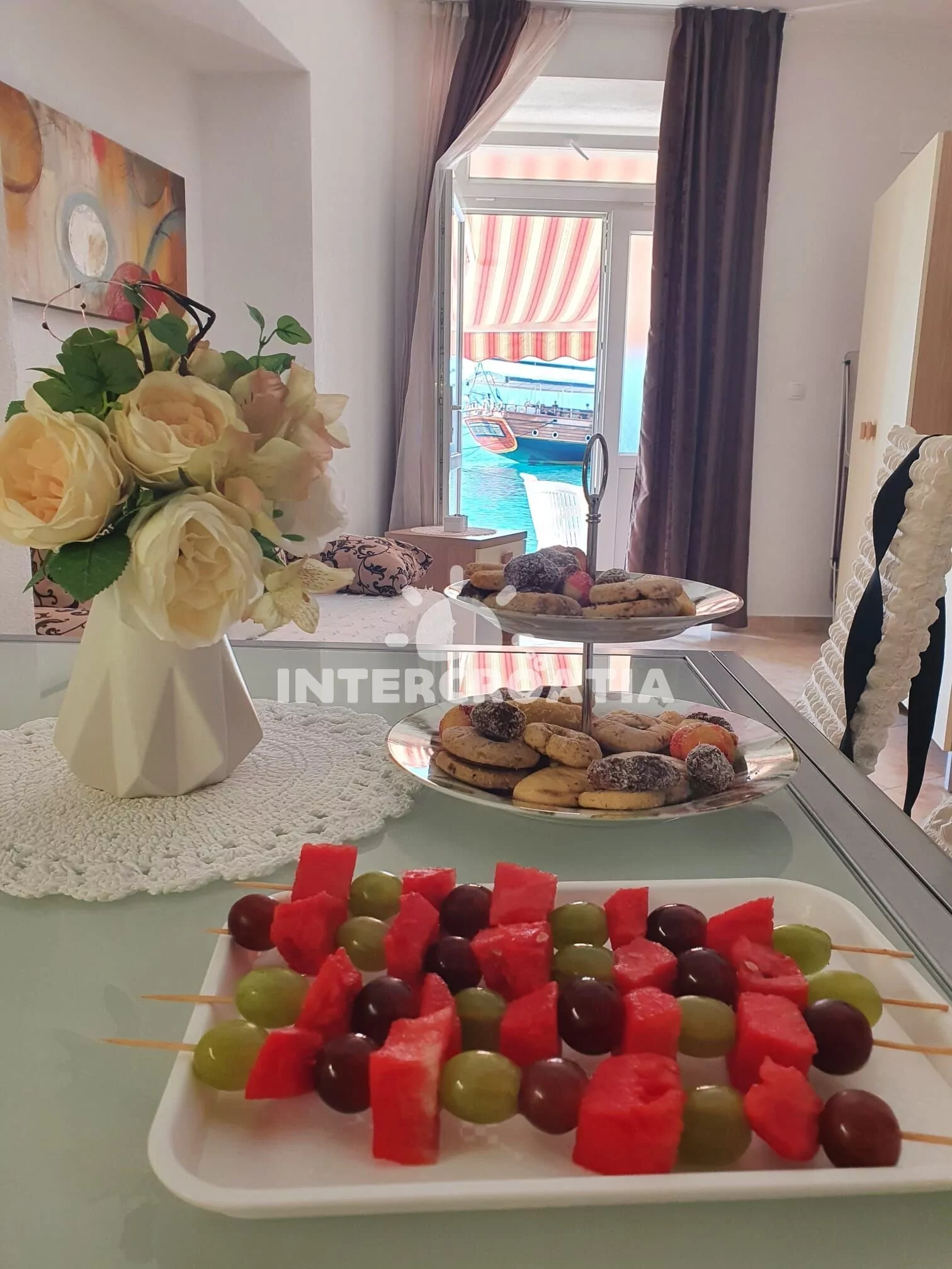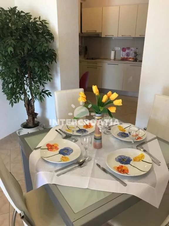 Apartmán (54 m2) s terasou, posezením a výhledem na moře se nachází v přízemí domu. Apartmán má 1 ložnici a je vhodný pro 2 až 4 osoby. Obývací pokoj je spojený s kuchyní. Kuchyňská linka je vybavena dvouplotýnkovou varnou deskou, digestoří, mikrovlnnou troubou, rychlovarnou konvicí, kávovarem, nádobím a lednicí s mrazákem. Obývací pokoj s jídelním stolem pro 4 osoby, pohovkou (rozložitelná na extra lůžko pro 2 osoby), televizí se satelitním programem, radiem, klimatizací a vstupem na terasu. Ložnice s jedním dvoulůžkem. Koupelna se sprchovým koutem, umyvadlem, fénem a wc. Hostům je k dispozici parkování u objektu zdarma.