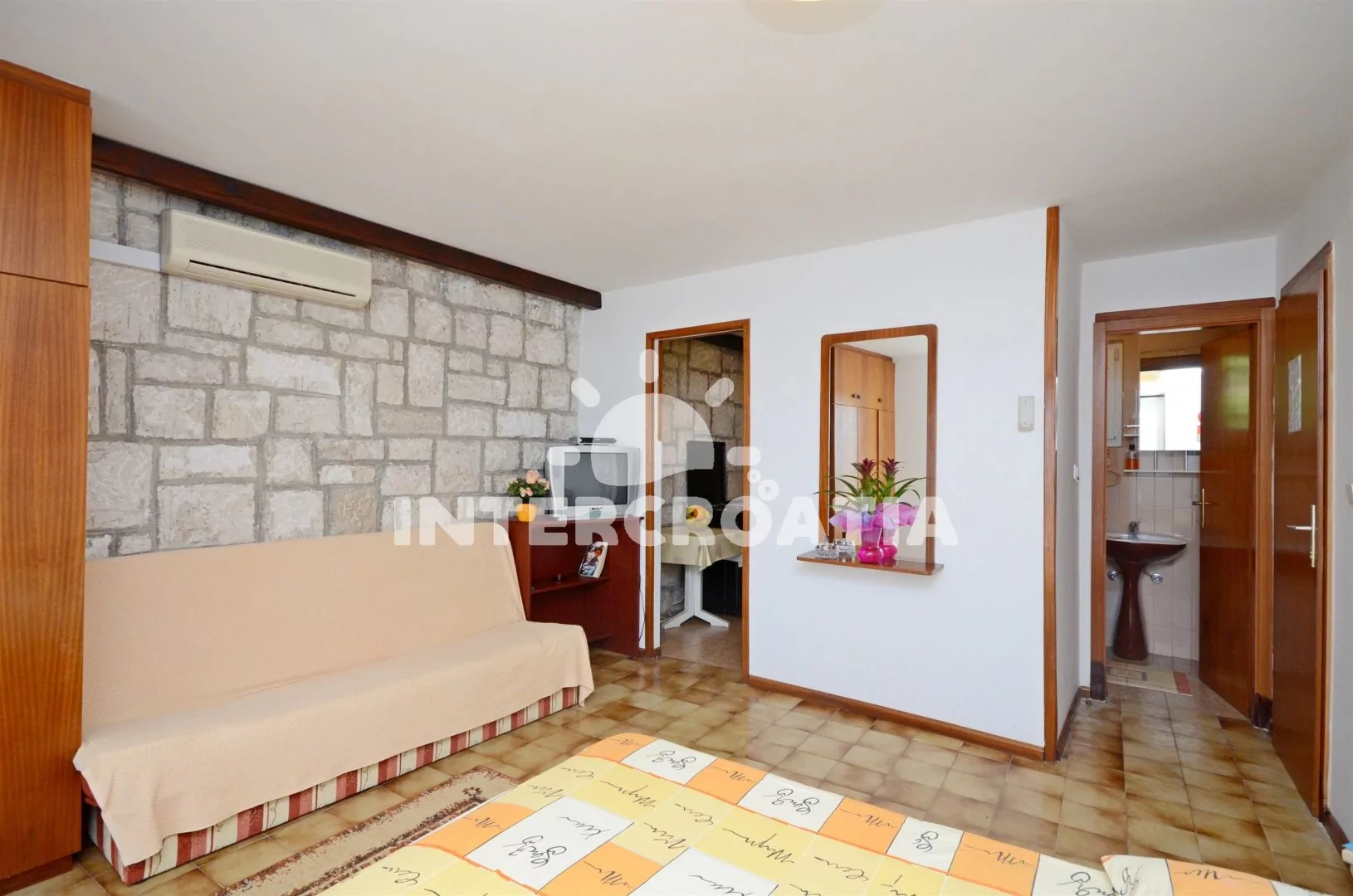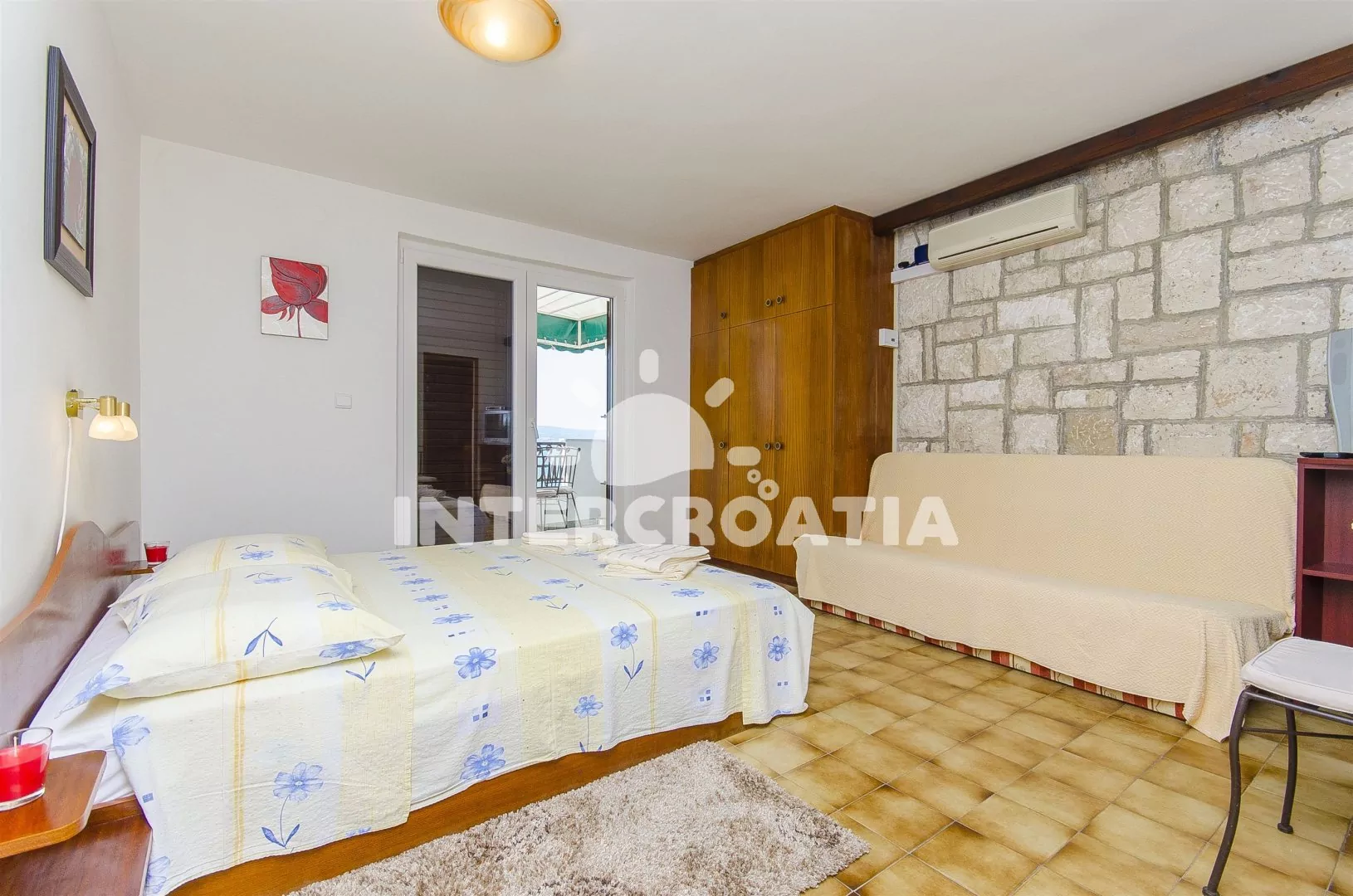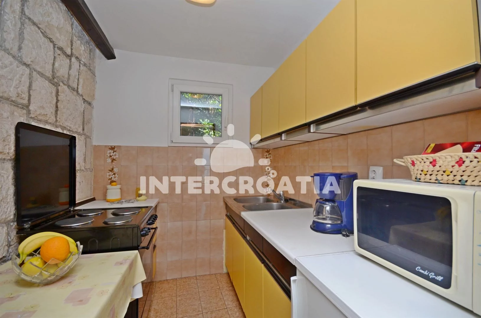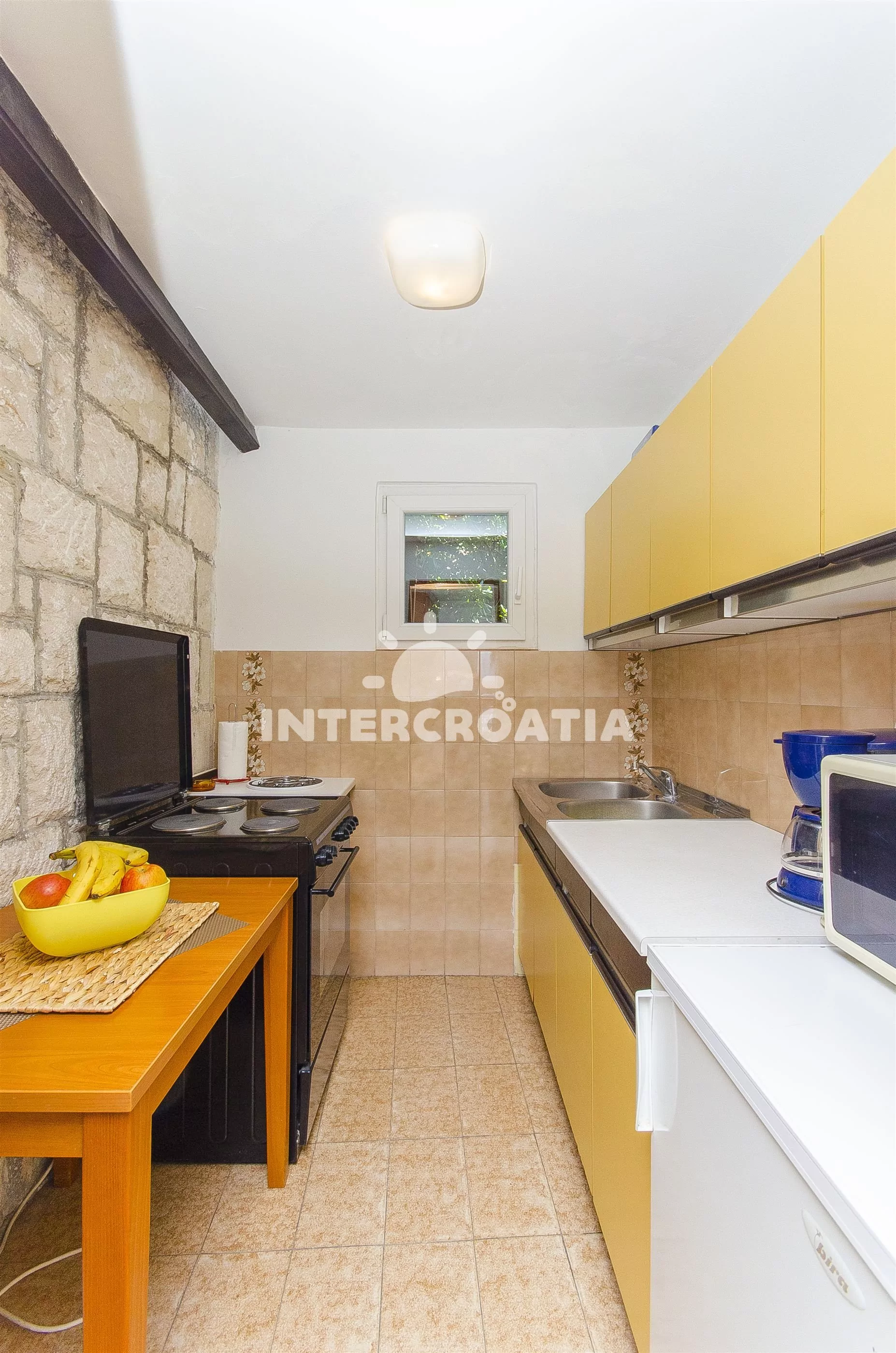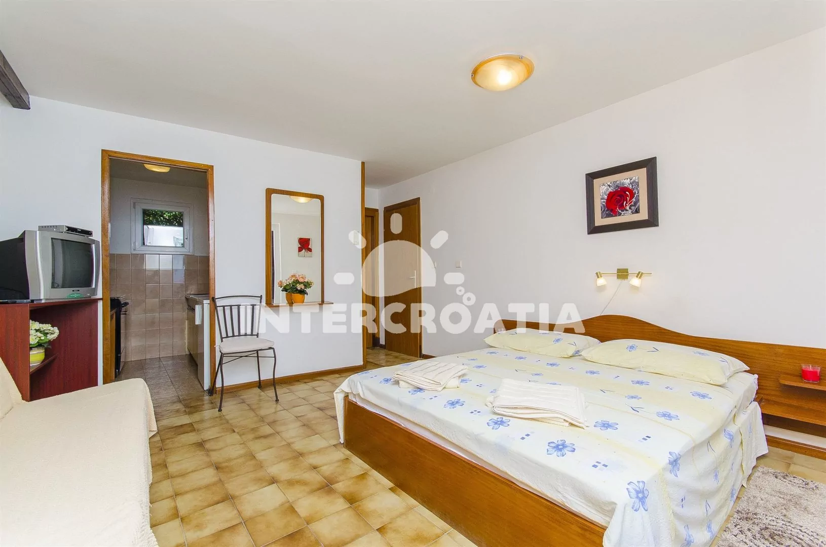 Apartmán (30 m2) typu studio s terasou, posezením a výhledem na moře se nachází v 1. patře domu. Apartmán je vhodný pro 2 až 3 osoby. Obývací pokoj je spojený s kuchyní. Kuchyňská linka je vybavena sporákem, mikrovlnnou troubou, kávovarem, nádobím a lednicí s mrazákem. Obývací pokoj s jídelním stolem, pohovkou (rozložitelná na extra lůžko pro 1 osobu), televizí, klimatizací, dvoulůžkem a vstupem na terasu. Koupelna se sprchovým koutem, umyvadlem a wc. Hostům je k dispozici parkování u objektu zdarma.