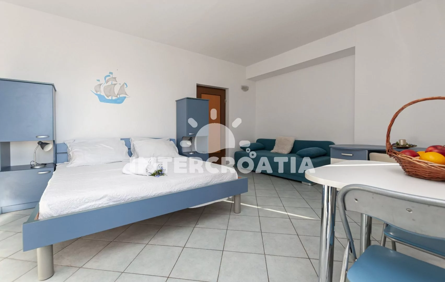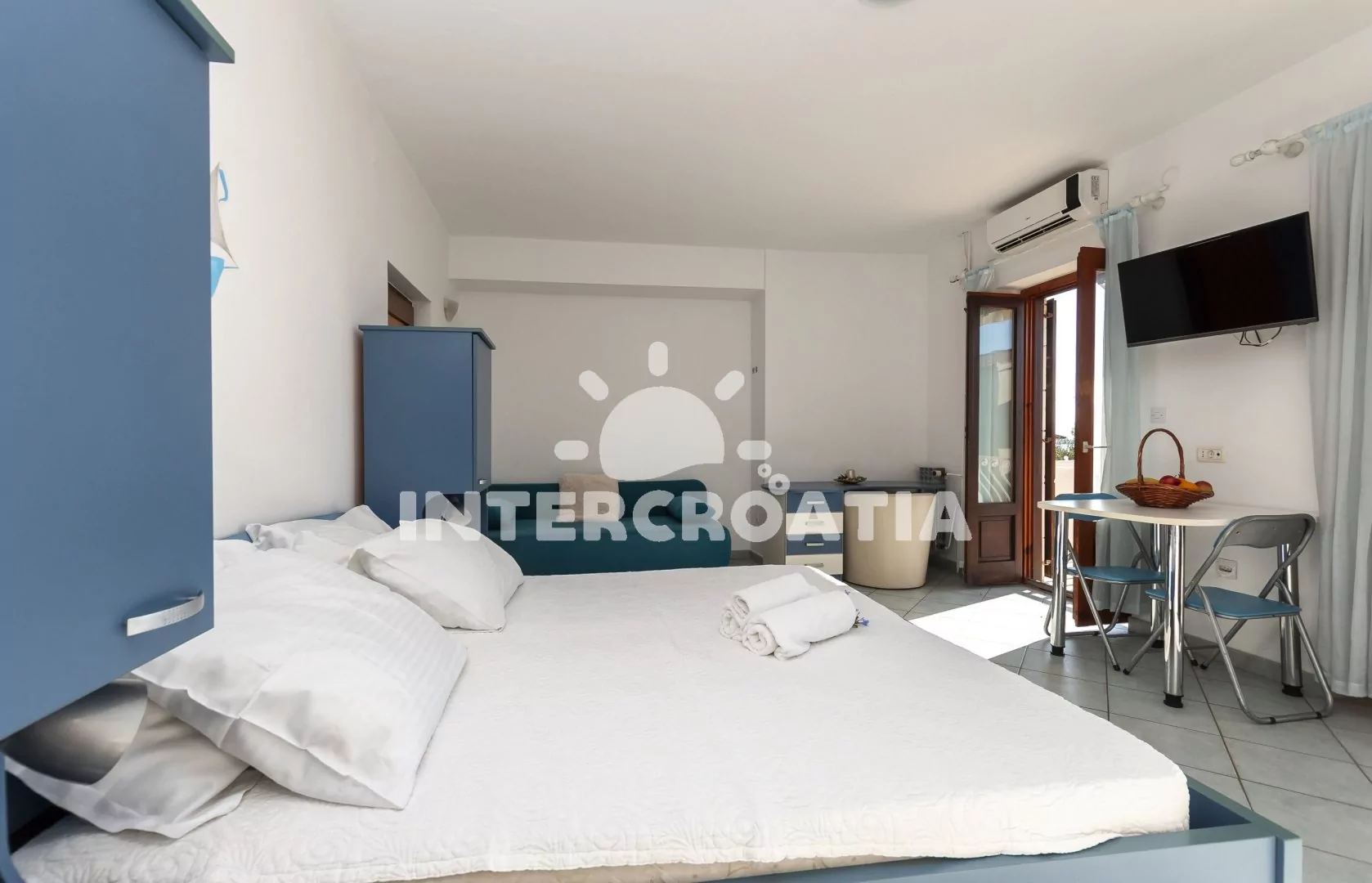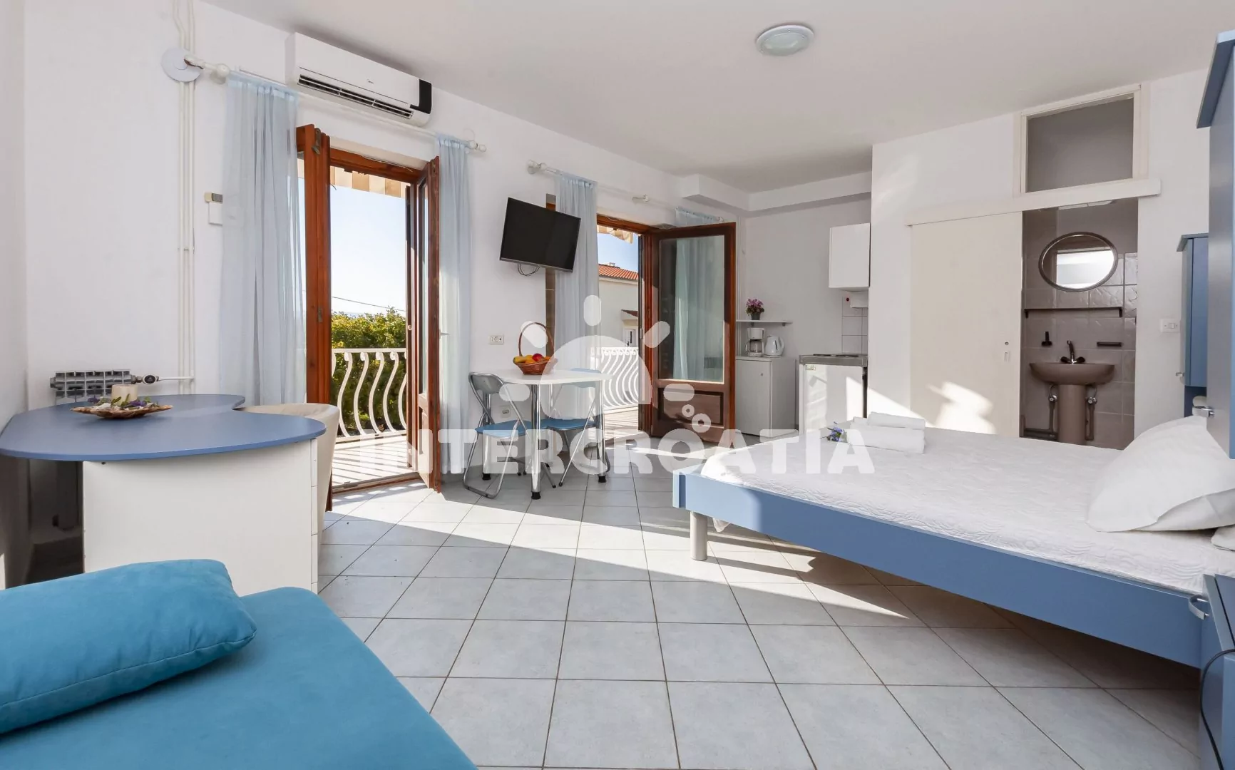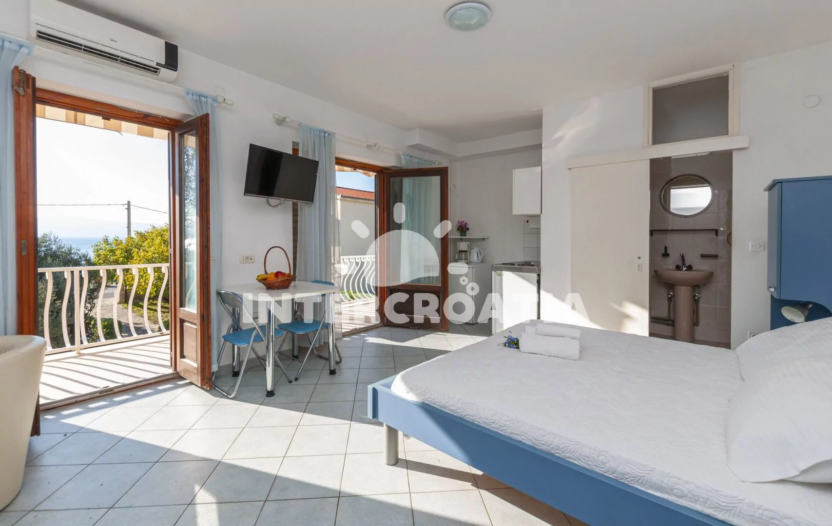Apartmán (26 m2) typu studio s balkonem, venkovním posezením a výhledem na moře se nachází v 1. patře domu. Obývací místnost je spojena s kuchyní. Kuchyňská linka je vybavena dvouplotýnkovým vařičem, mikrovlnnou troubou, rychlovarnou konvicí, kávovarem, nádobím a lednicí s mrazákem. Obývací místnost s jídelním stolem, pohovkou, televizí, klimatizací, dvoulůžkem a vstupem na balkon. Koupelna se sprchovým koutem, umyvadlem a wc. Hostům je k dispozici parkování u objektu zdarma.