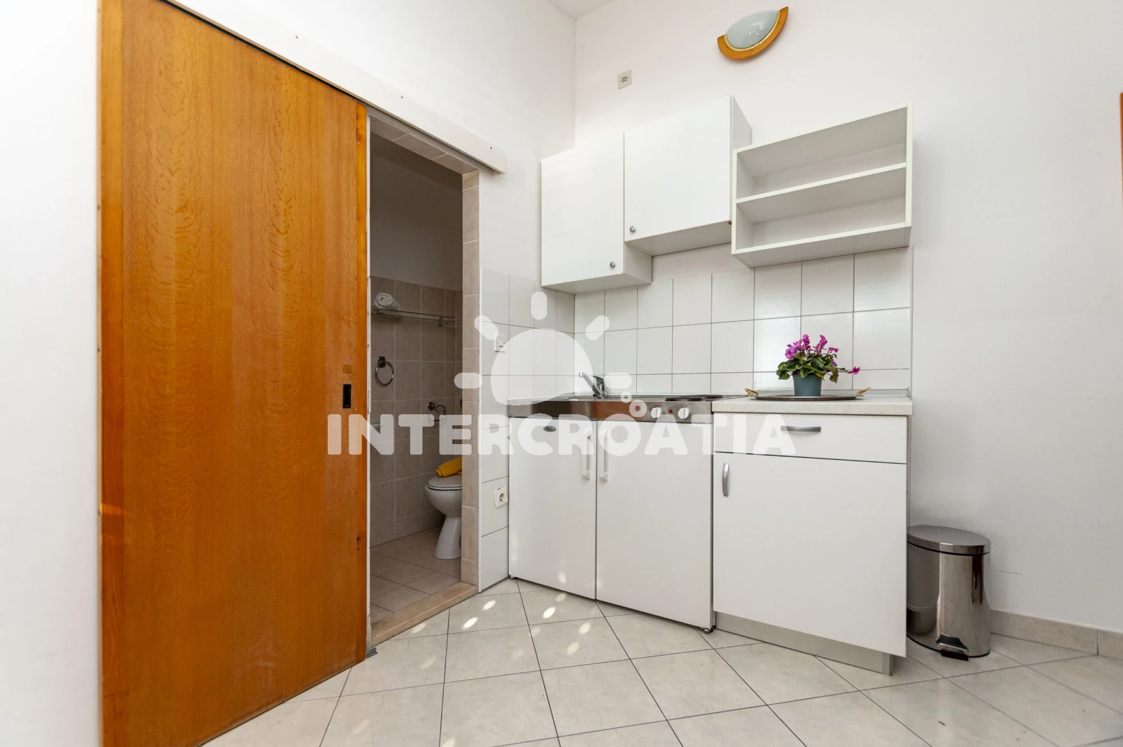 Apartmán typu studio (26 m2) s balkonem, a výhledem na moře. Nachází se ve 2. patře objektu. Kuchyňská linka je vybavena varnou deskou, kávovarem, rychlovarnou konvicí, nádobím, lednicí. K dispozici dvě jednolůžka, televize, žehlička. Koupelna se sprchovým koutem, umyvadlem, fénem a WC.