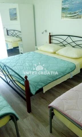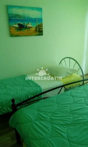 Apartmán (80 m2) s terasou/balkonem, posezením a výhledem na moře se nachází v 1. patře vily. Apartmán má 2 ložnice, 2 koupelny a je vhodný pro až 4 osoby. Obývací místnost je spojena s kuchyní. Kuchyňská linka je vybavena varnou deskou, digestoří, vestavěnou troubou, rychlovarnou konvicí, mikrovlnnou troubou, nádobím a lednicí s mrazákem. Obývací místnost s jídelním stolem, televizí, klimatizací a vstupem na terasu. První ložnice s dvoulůžkem. Druhá ložnice s dvoulůžkem a vstupem na balkon. Dvě koupelny se sprchovým koutem, umyvadlem a wc. Hostům je k dispozici parkování u objektu zdarma.