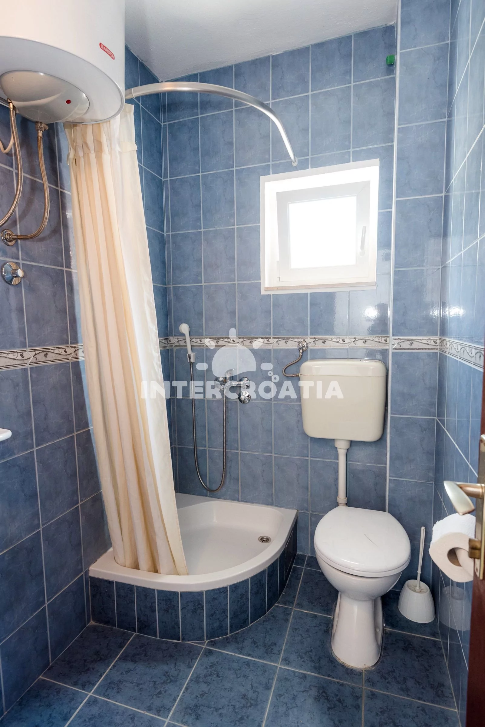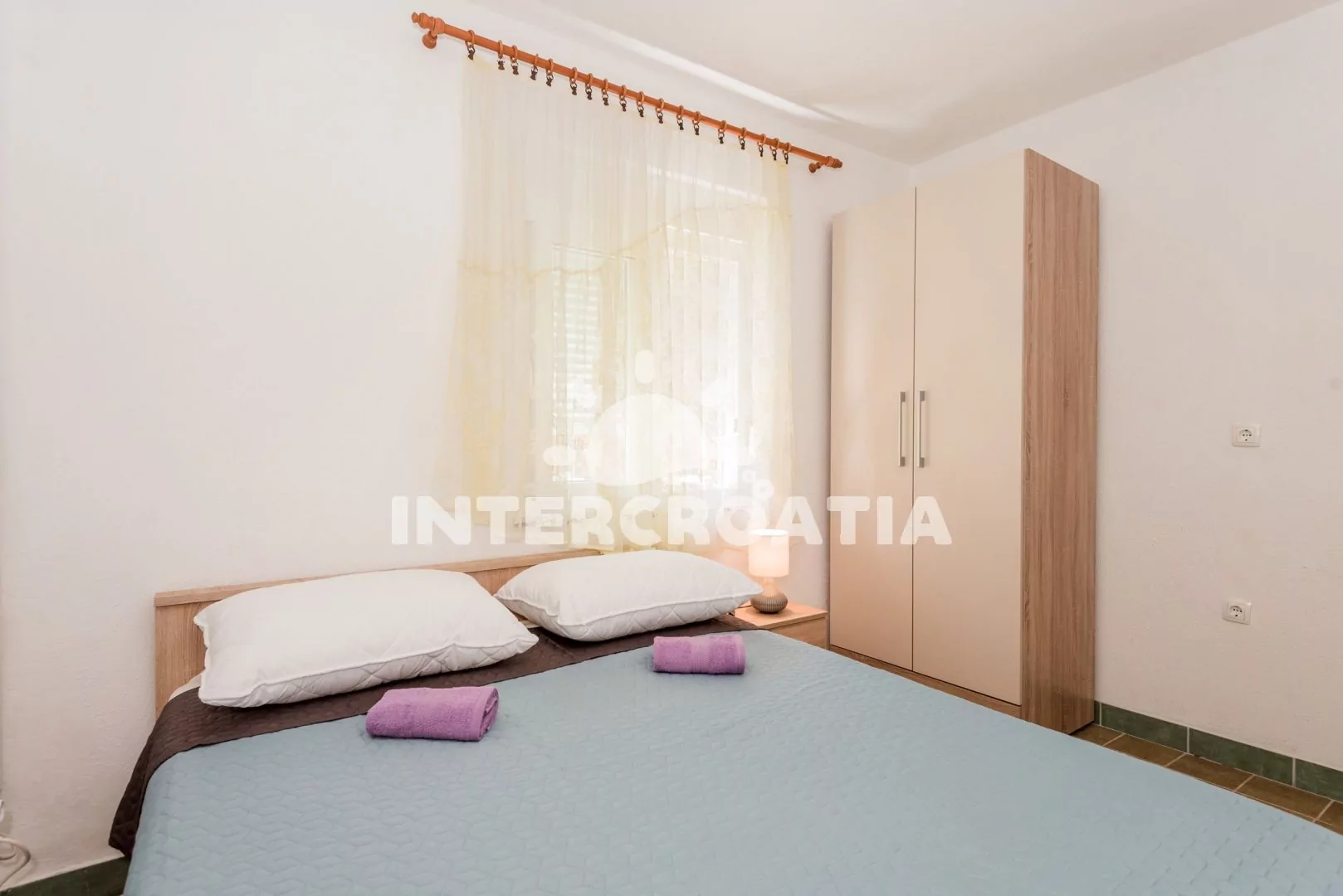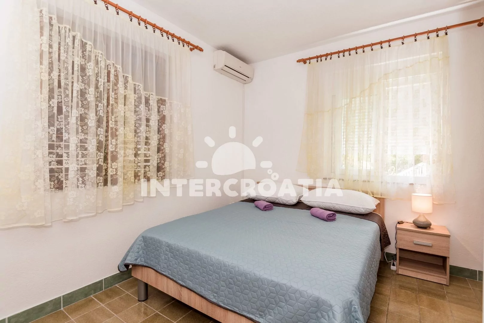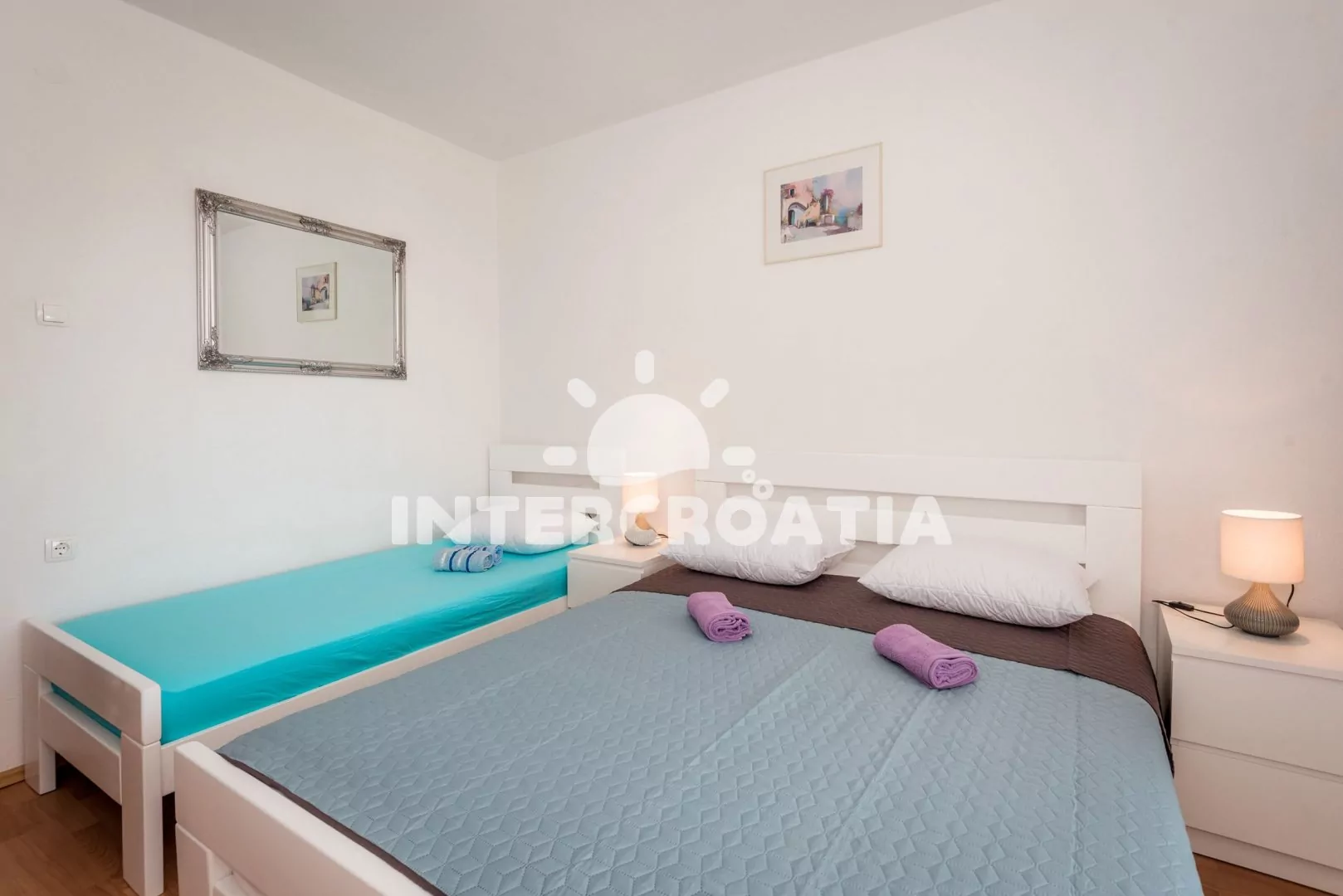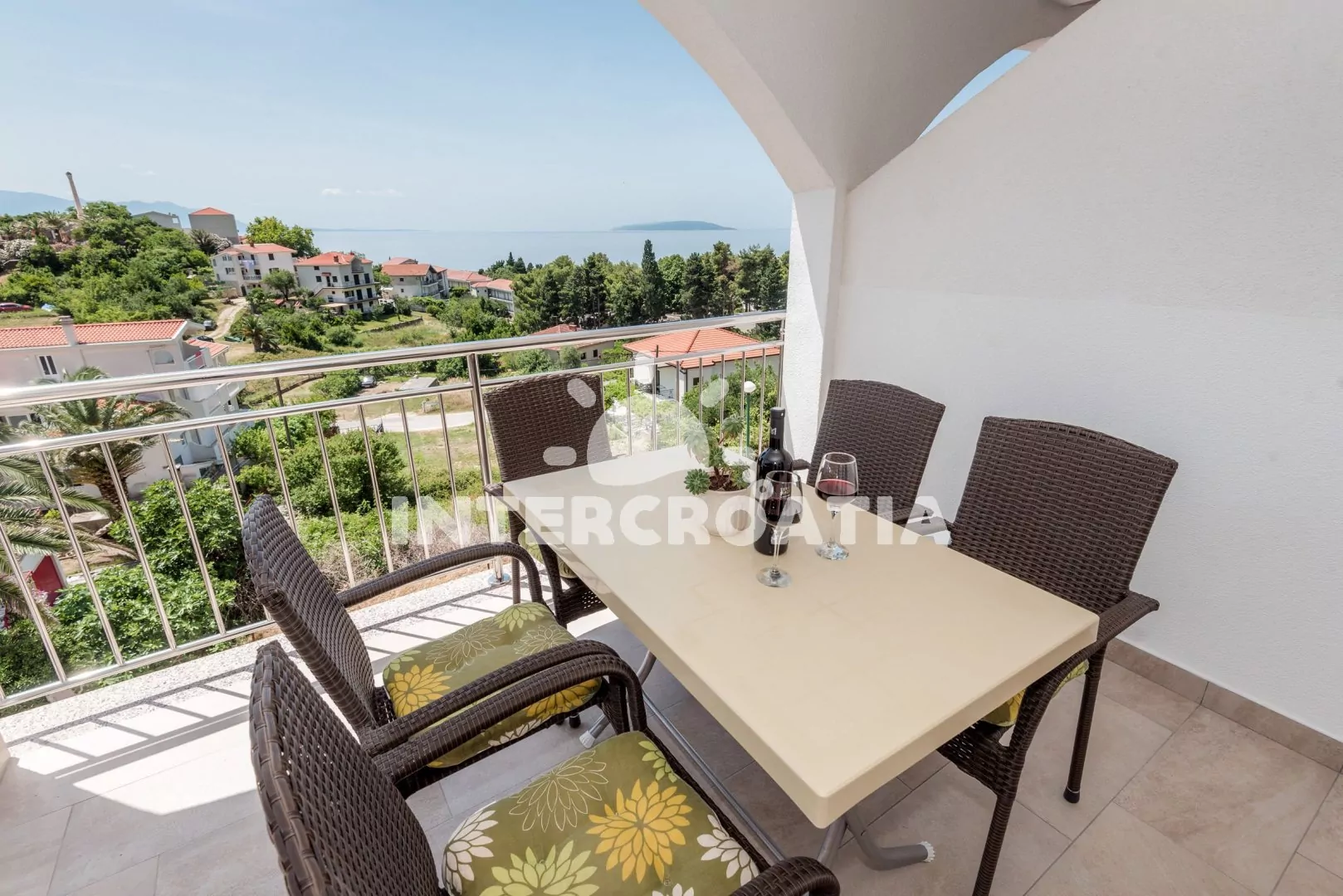 Hezky zařízený třípokojový apartmán s výhledem na moře se nachází v druhém patře a je vhodný pro až 5 osob. Obývací pokoj je spojený s kuchyní. Kuchyňská linka je vybavena dvouplotýnkovým sporákem, mikrovlnnou troubou, rychlovarnou konvicí, nádobím a lednicí s mrazákem. Dále televize se satelitním programem. První ložnice s jedním dvoulůžkem a klimatizací. Druhá ložnice s dvoulůžkem, jedním jednolůžkem a vstupem na terasu. Koupelna se sprchovým koutem, umyvadlem a wc. Hostům je k dispozici parkování u objektu zdarma.