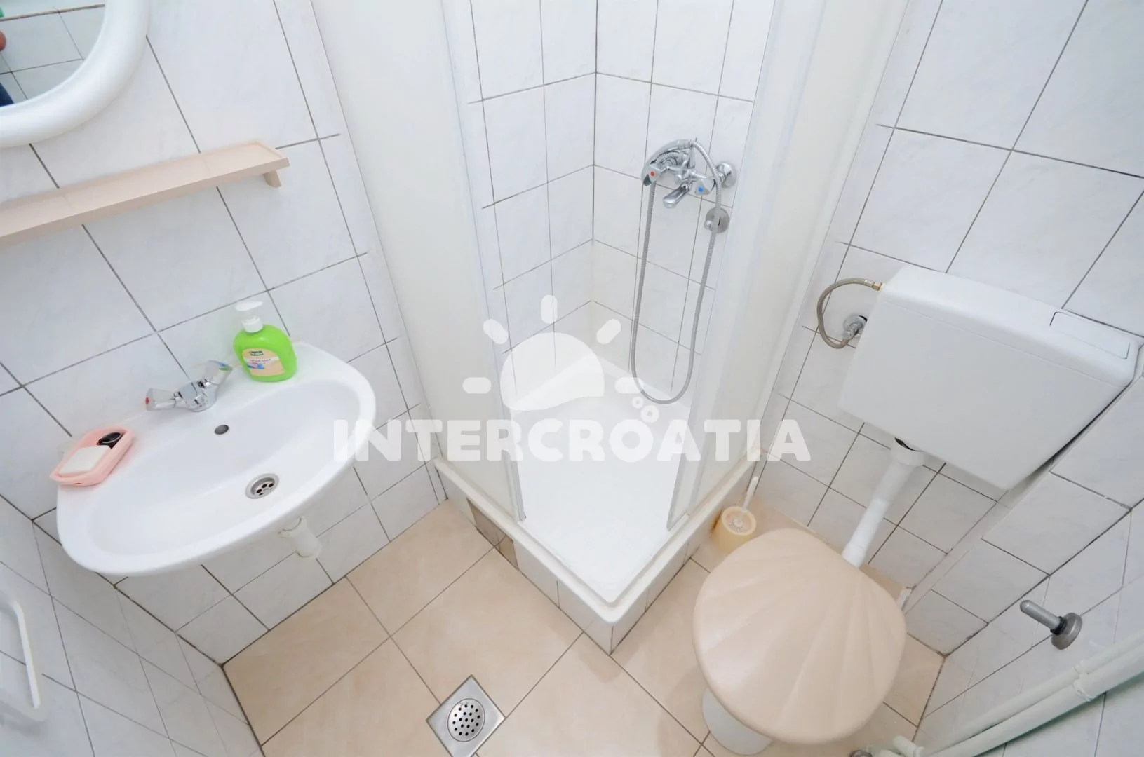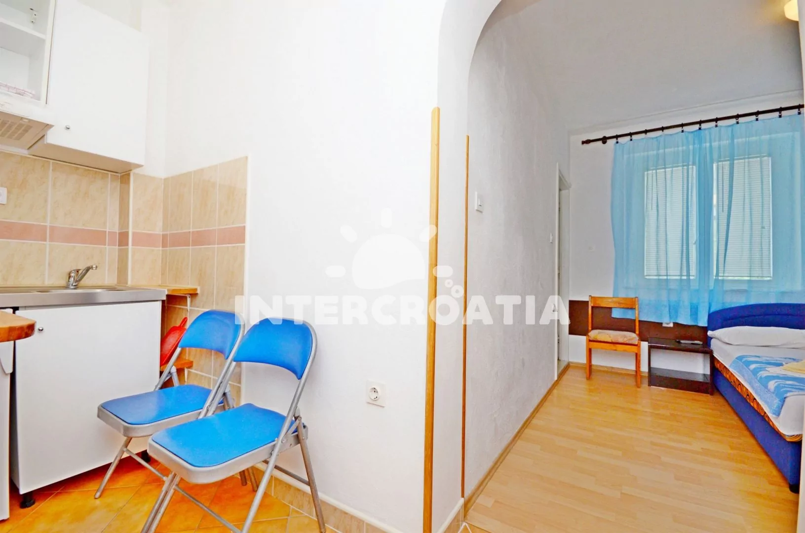 Apartmán (18 m2) typu studio s výhledem na moře a posezením na společné terase se nachází ve 2. patře domu. Obývací místnost je spojena s kuchyní. Kuchyňská linka je vybavena dvouplotýnkovým vařičem,…