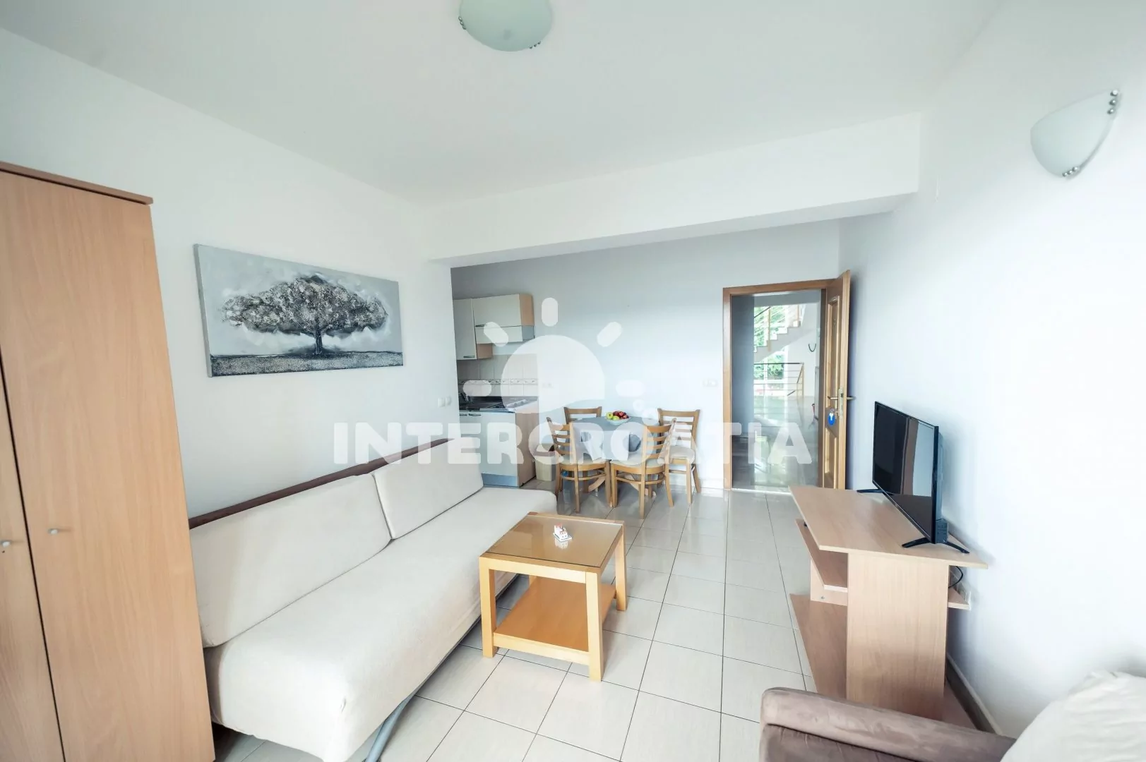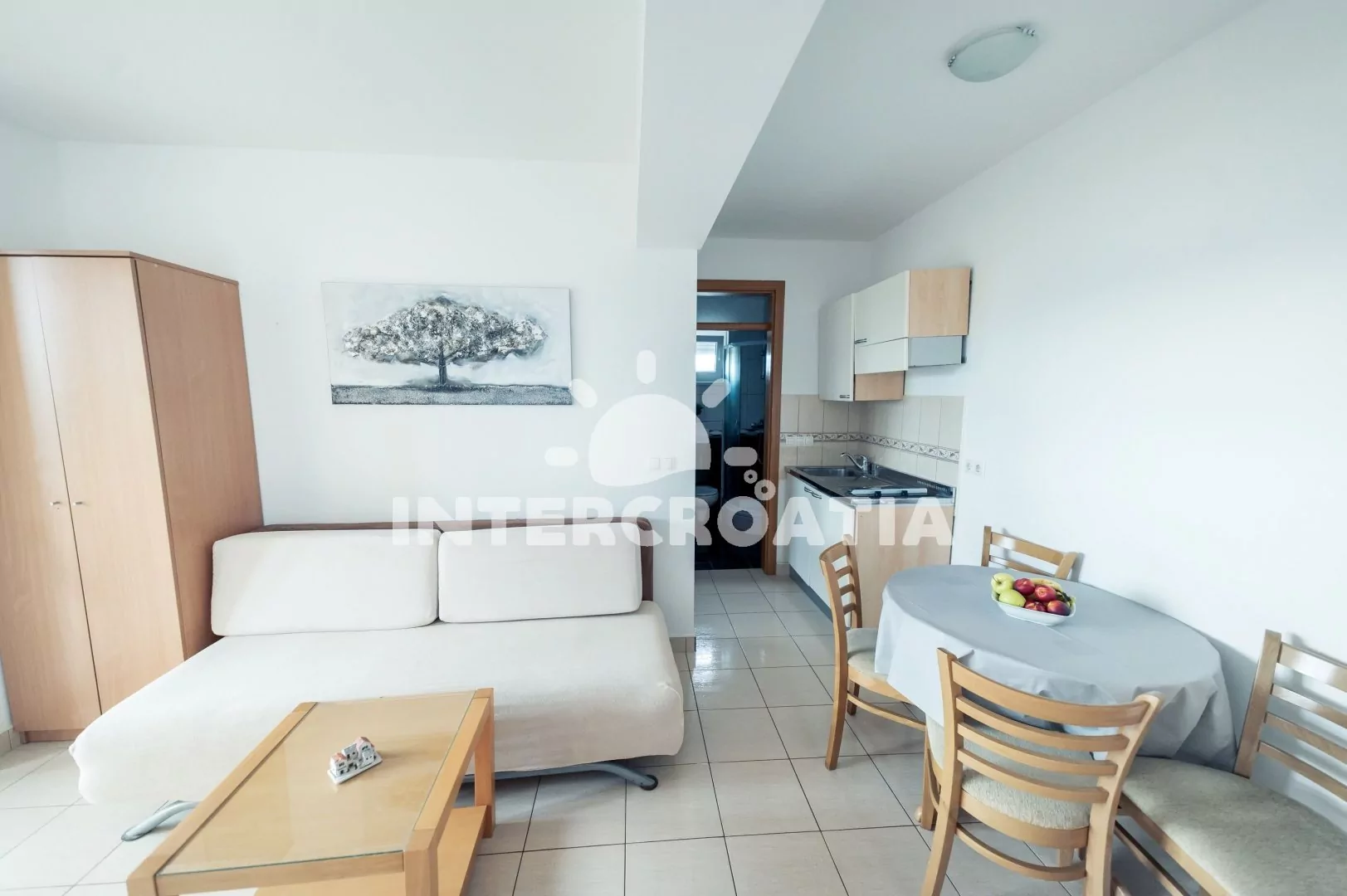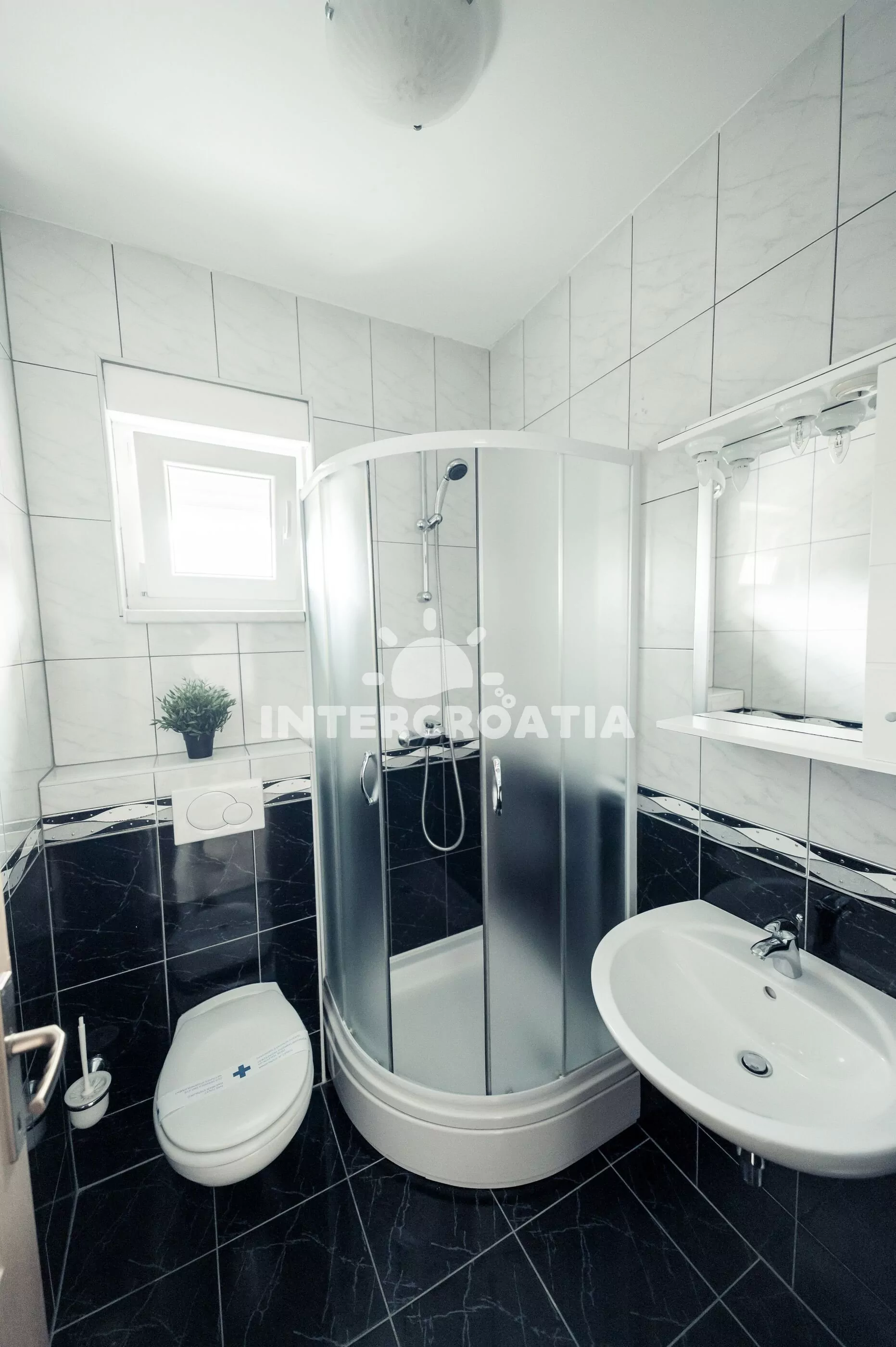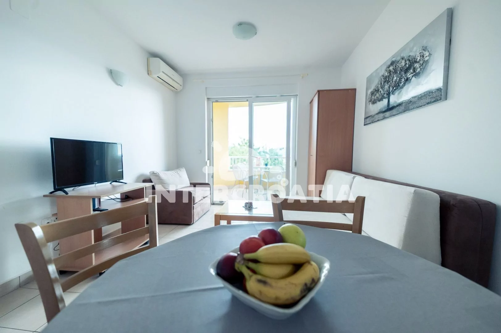 Apartmán (35 m2) s balkonem a výhledem na moře se nachází v 1. patře domu. Apartmán má 1 ložnici a je vhodný pro 2 až 4 osoby. Obývací pokoj je spojený s kuchyní. Kuchyňská linka je vybavena dvouplotýnkovým vařičem, digestoří, rychlovarnou konvicí, nádobím a lednicí s mrazákem. Obývací pokoj s jídelním stolem, pohovkou (rozložitelná na extra lůžko pro 2 osoby), televizí, klimatizací a vstupem na balkon. Ložnice s jedním dvoulůžkem. Koupelna se sprchovým koutem, umyvadlem a wc. Hostům je k dispozici parkování 150-300 m od domu zdarma.