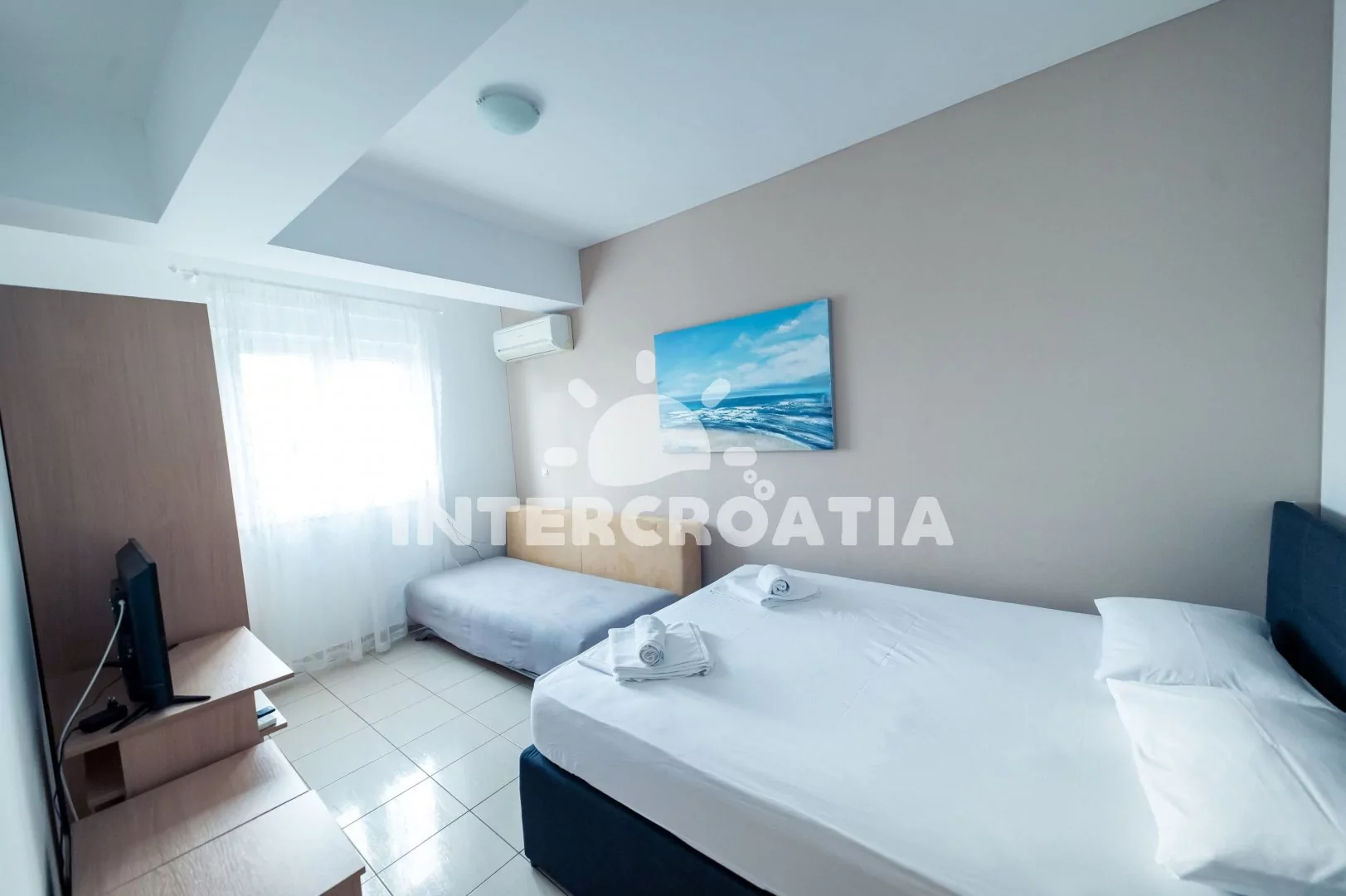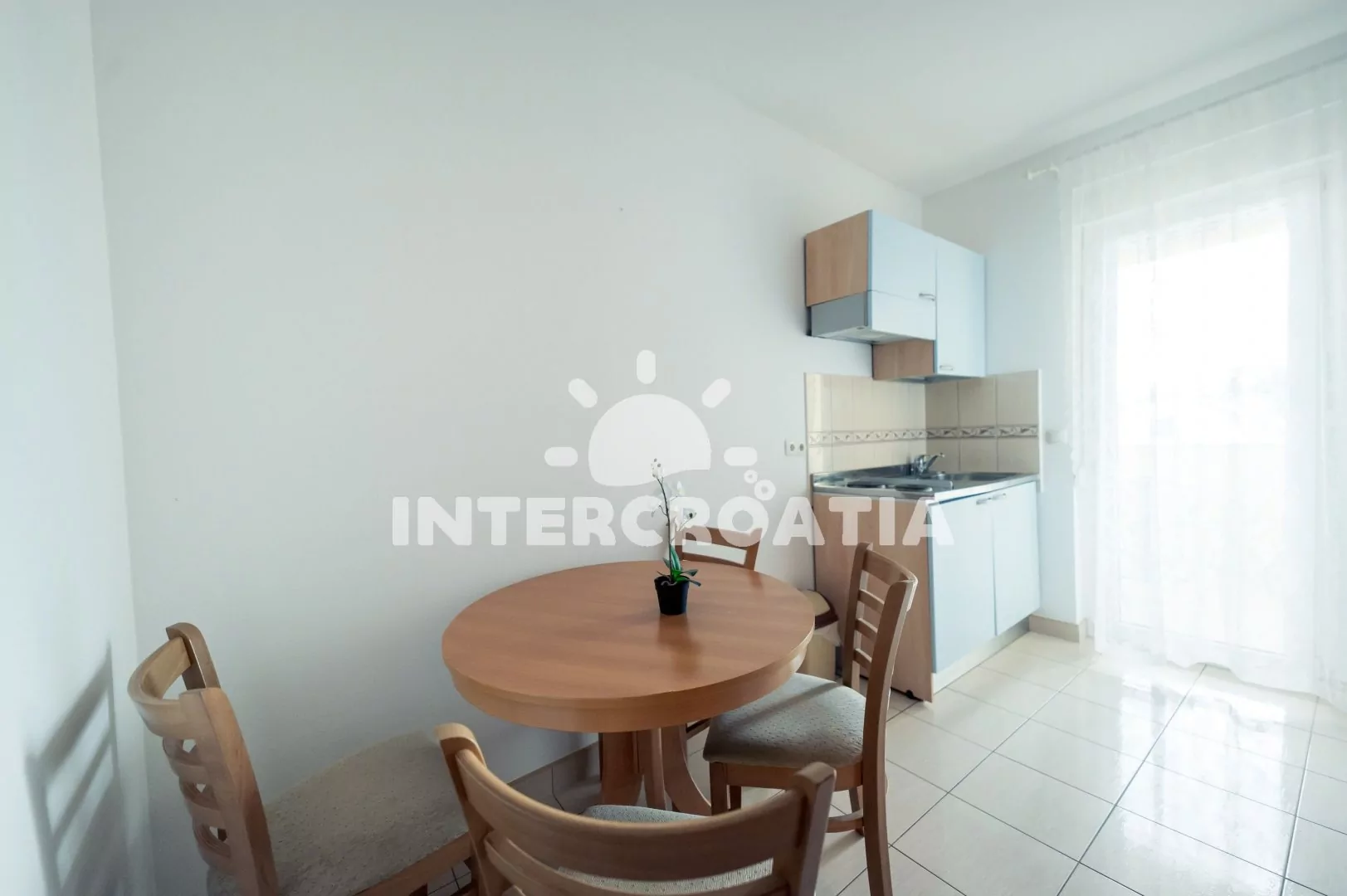 Apartmán (27 m2) s balkonem a výhledem na moře se nachází v 1. patře domu. Apartmán má 1 ložnici a je vhodný pro 2 až 3 osoby. Kuchyň s jídelním stolem, kuchyňskou linkou a vstupem na balkon. Kuchyňská linka je vybavena dvouplotýnkovým vařičem, digestoří, rychlovarnou konvicí, nádobím a lednicí s mrazákem. Ložnice s dvoulůžkem, pohovkou (rozložitelná na extra lůžko pro 1 osobu), televizí a klimatizací. Koupelna se sprchovým koutem, umyvadlem a wc. Hostům je k dispozici parkování 150-300 m od domu zdarma.