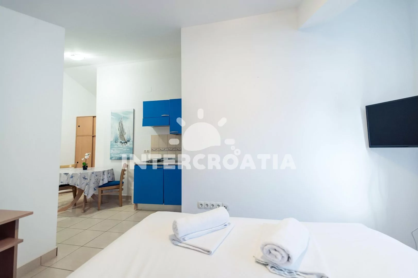 Podkrovní apartmán (20 m2) typu studio s možností využívat společné terasy s výhledem na moře. Obývací místnost je spojena s kuchyní. Kuchyňská linka je vybavena dvouplotýnkovým vařičem, digestoří,…