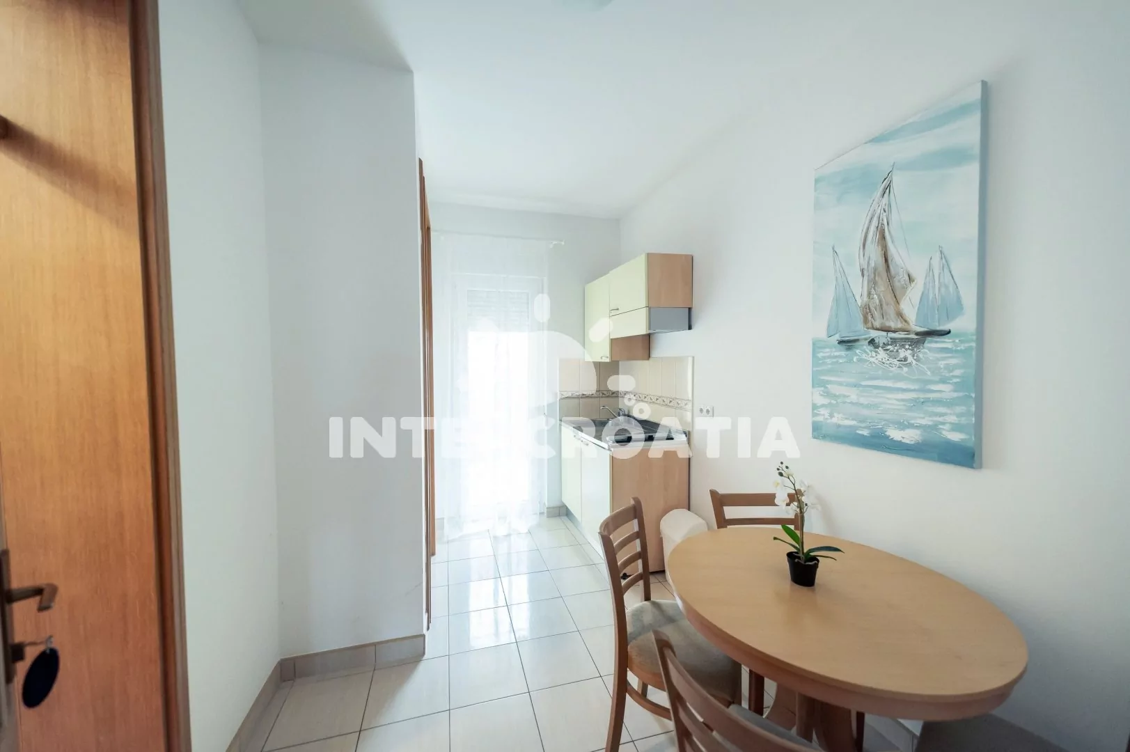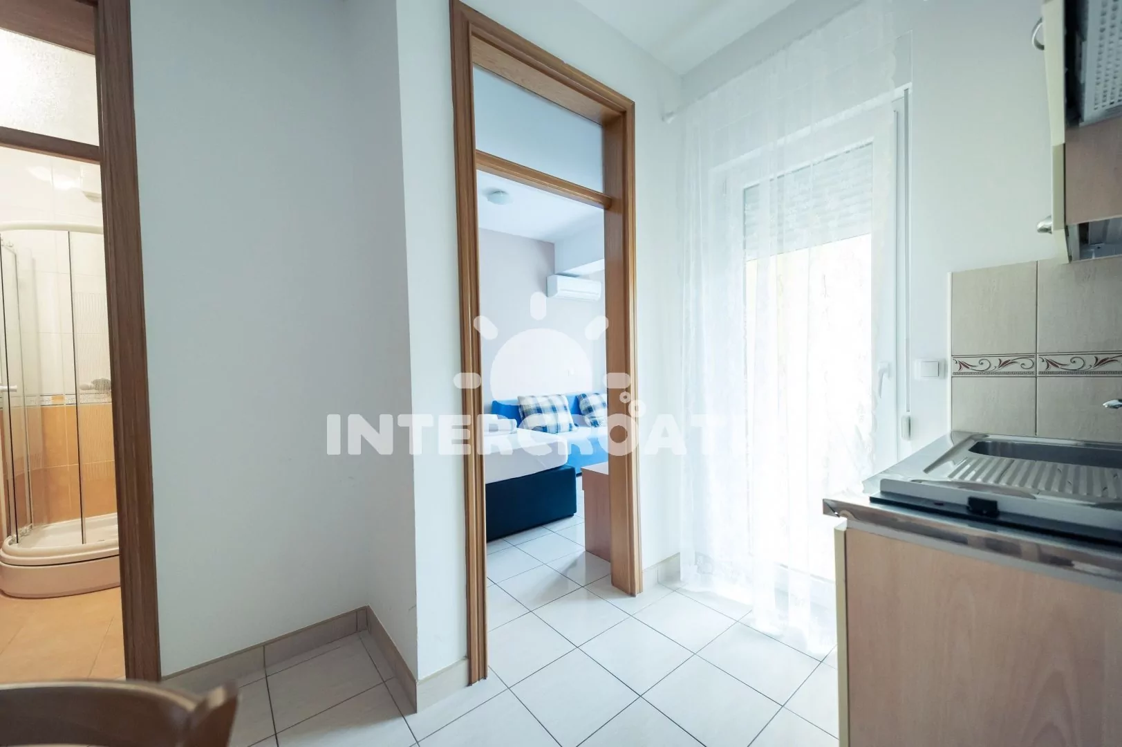 Apartmán (27 m2) s balkonem a výhledem do dvora se nachází v přízemí domu. Apartmán má 1 ložnici a je vhodný pro 2 až 3 osoby. Kuchyň s jídelním stolem, kuchyňskou linkou a vstupem na balkon. Kuchyňská linka je vybavena dvouplotýnkovým vařičem, digestoří, rychlovarnou konvicí, nádobím a lednicí s mrazákem. Ložnice s dvoulůžkem, pohovkou (rozložitelná na extra lůžko pro 1 osobu), televizí a klimatizací. Koupelna se sprchovým koutem, umyvadlem a wc. Hostům je k dispozici parkování 150-300 m od domu zdarma.