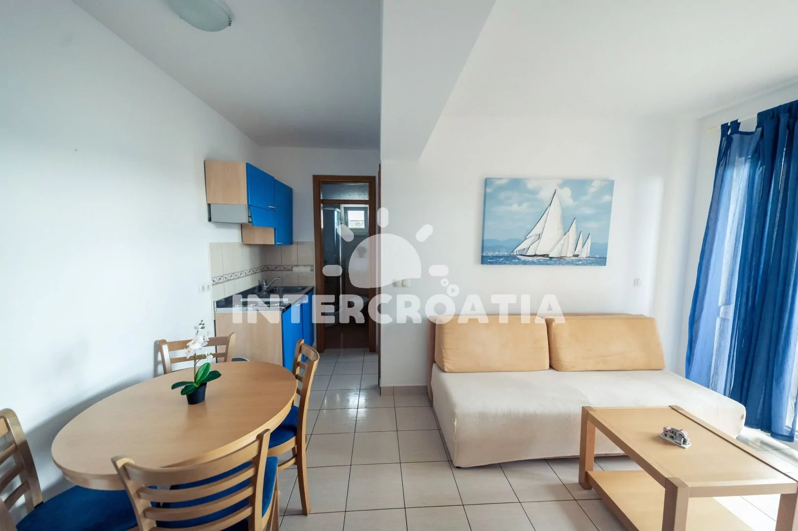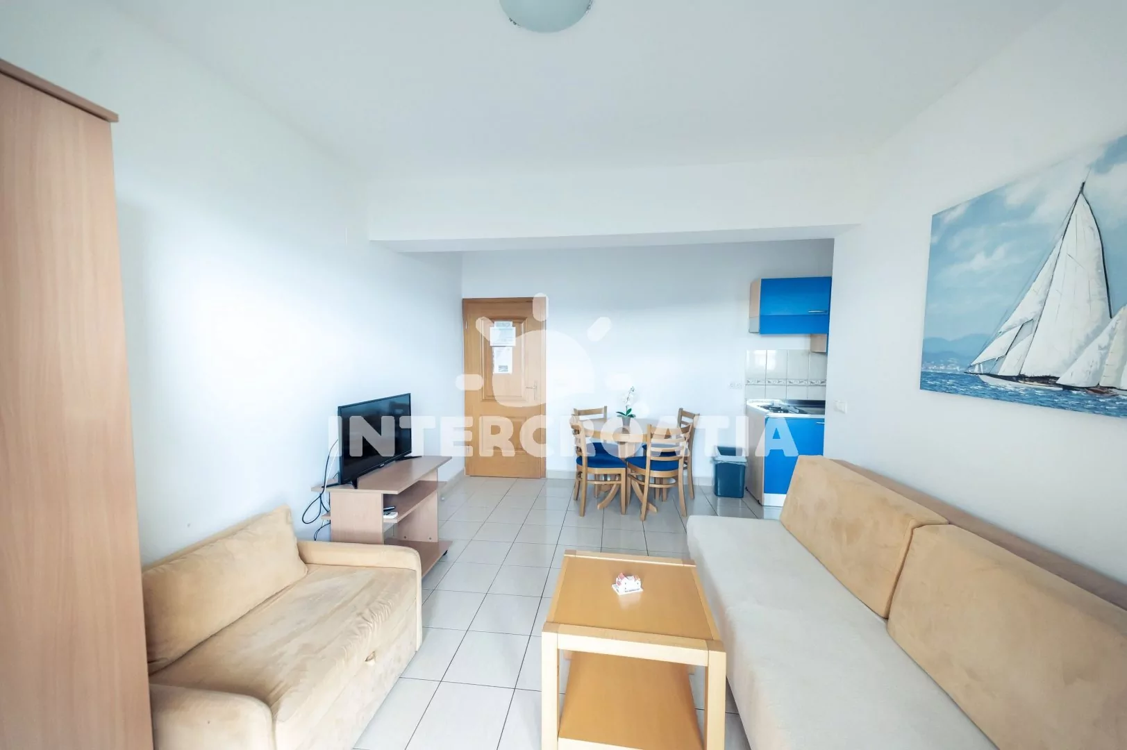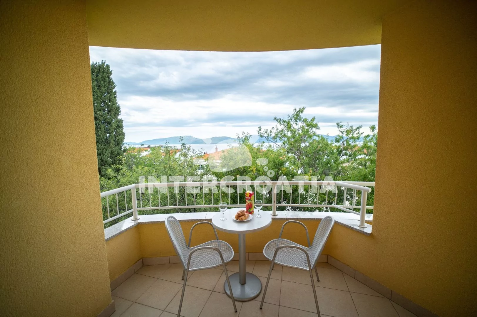 Apartmán (35 m2) s balkonem a výhledem na moře se nachází v 1. patře domu. Apartmán má 1 ložnici a je vhodný pro 2 až 4 osoby. Obývací pokoj je spojený s kuchyní. Kuchyňská linka je vybavena dvouplotýnkovým vařičem, digestoří, rychlovarnou konvicí, nádobím a lednicí s mrazákem. Obývací pokoj s jídelním stolem, pohovkou (rozložitelná na extra lůžko pro 2 osoby), televizí, klimatizací a vstupem na balkon. Ložnice s jedním dvoulůžkem. Koupelna se sprchovým koutem, umyvadlem a wc. Hostům je k dispozici parkování 150-300 m od domu zdarma.