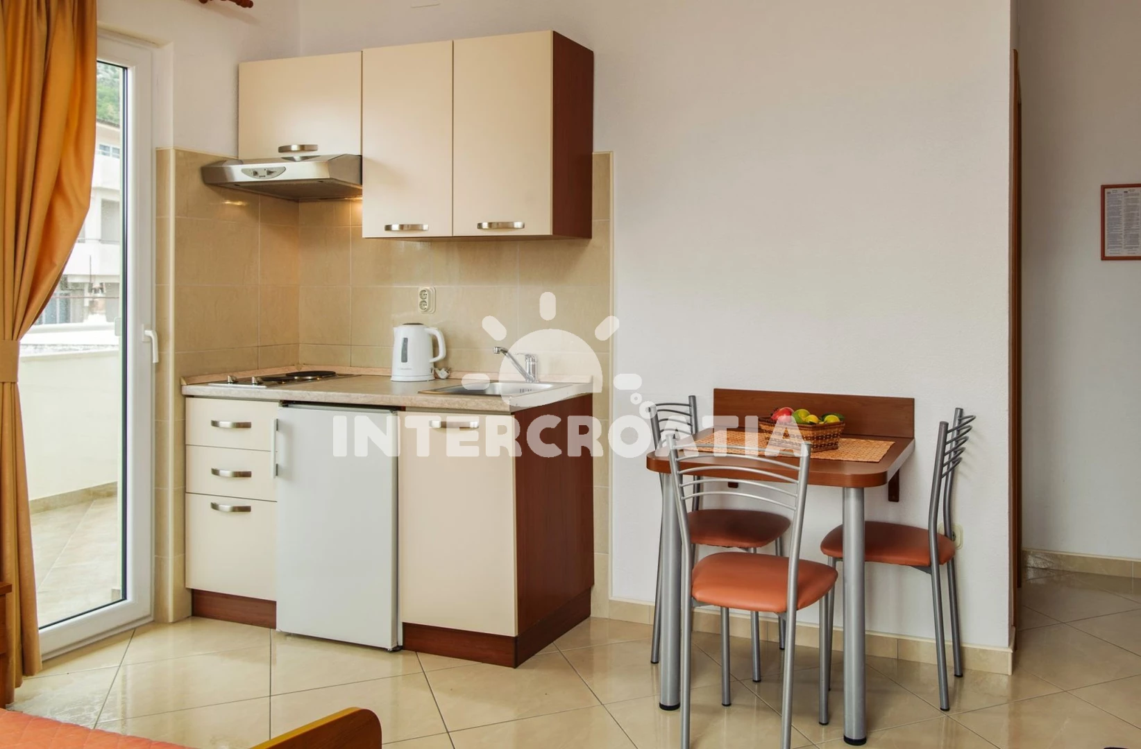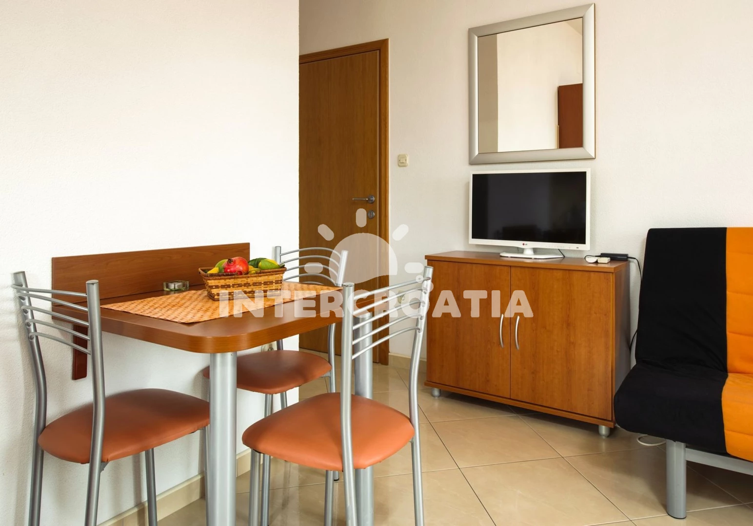Apartmán (23 m2) s výhledem na moře. Kuchyňská linka je vybavena varnou deskou, rychlovarnou konvicí, nádobím, lednicí, mrazákem. K dispozici dvoulůžko, televize se satelitním programem. Koupelna se…