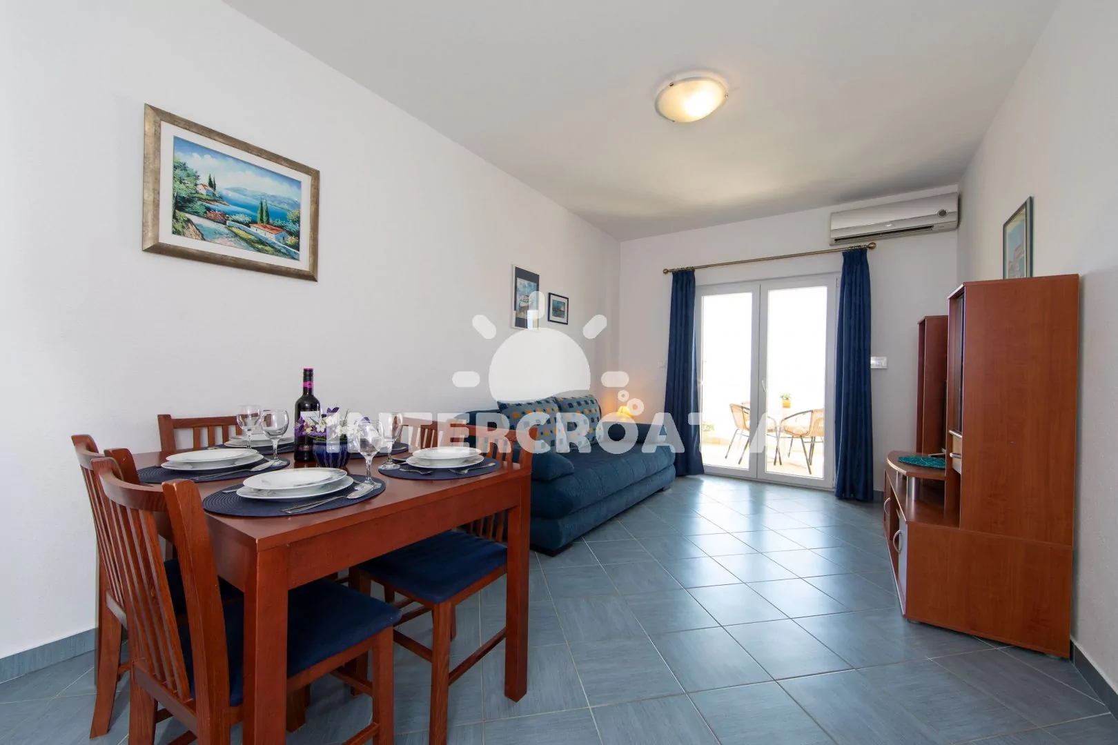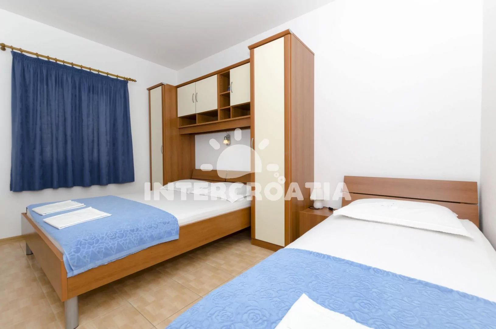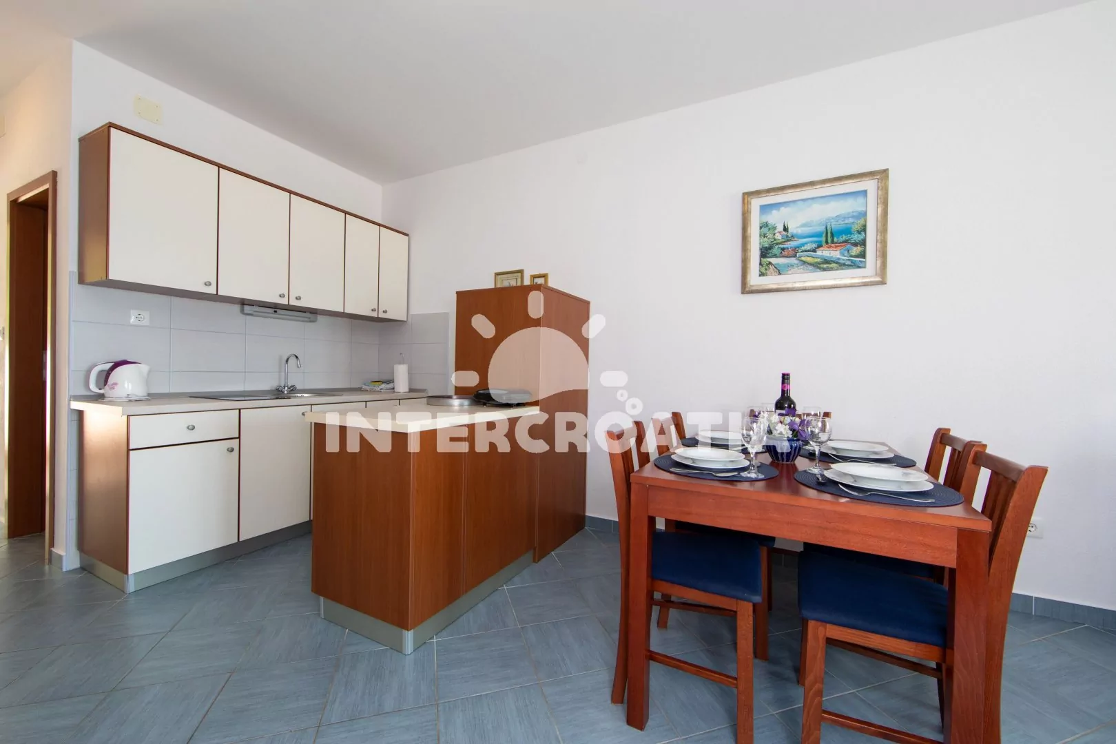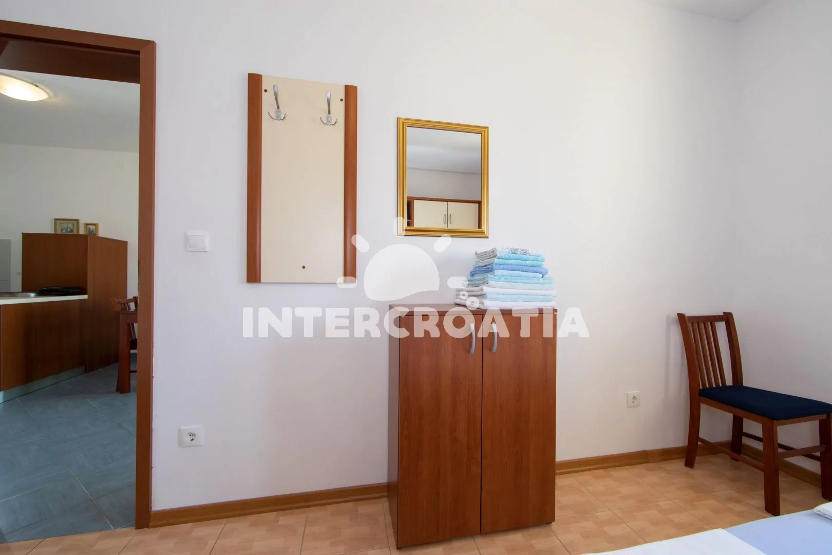 Světlý a příjemně zařízený apartmán se dvěma pokoji, krytou terasou s posezením a výhledem na moře, nacházející se v 2. patře domu. Vstup, obývací místnost spojená s kuchyní. Kuchyňská linka s dvouplotýnkovou varnou deskou (elektřina), mikrovlnnou troubou, lednicí s mrazákem, kávovarem, rychlovarnou konvicí a nádobím. V obývací místnosti jídelní stůl pro 5 osob, pohovka (rozložitelná na extra lůžko pro 2 osoby) a LCD televize se satelitem. Ložnice s dvoulůžkem a jedním jednolůžkem. Koupelna se sprchovým koutem, umyvadlem, wc a vysoušečem vlasů. Hosté mají k dispozici balkon s posezením. Parkování 150-300 m od objektu.