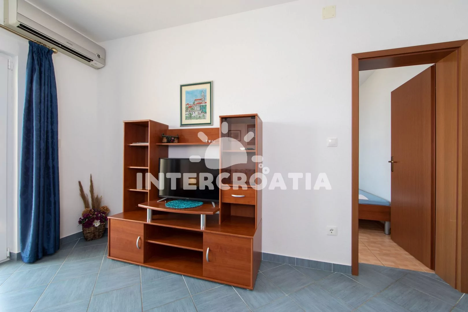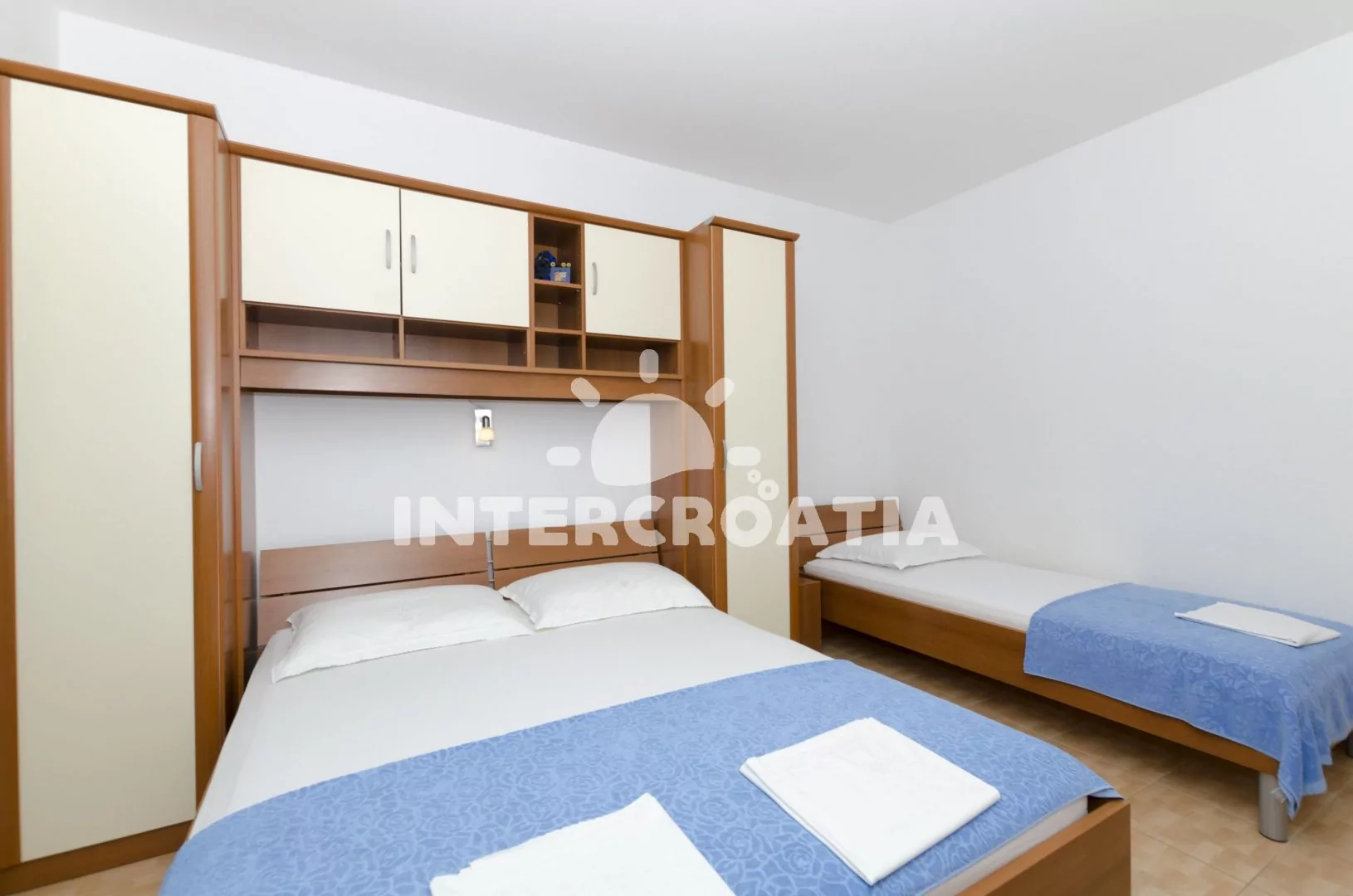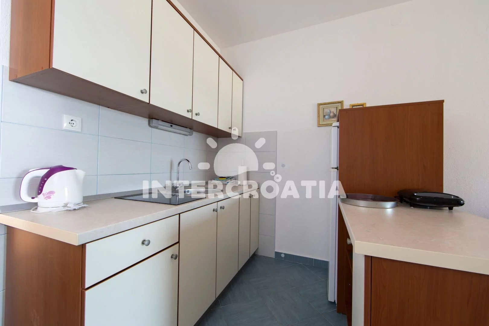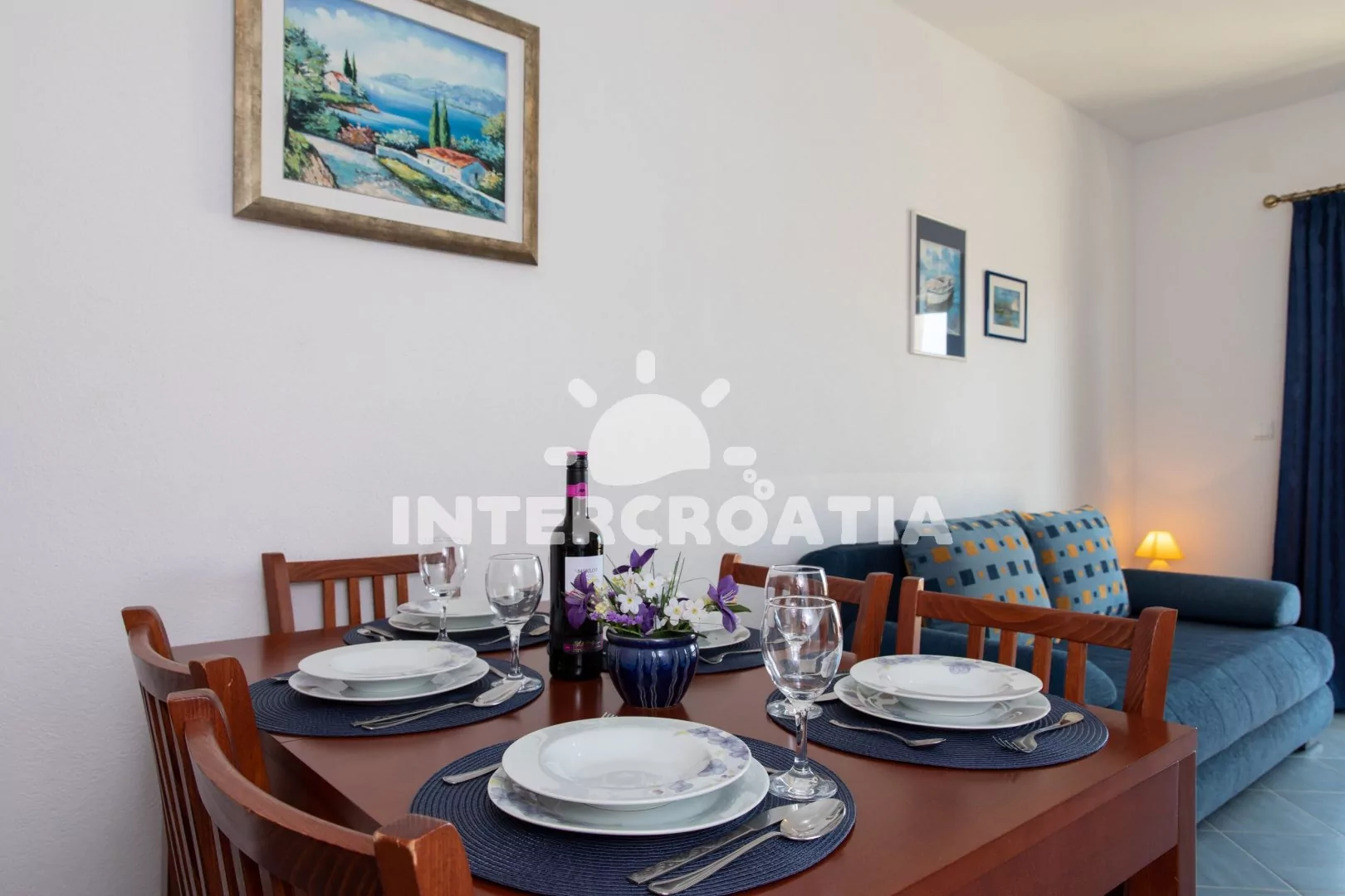 Světlý a příjemně zařízený apartmán se dvěma pokoji, krytou terasou s posezením a výhledem na moře, nacházející se v 2. patře domu. Vstup, obývací místnost spojená s kuchyní. Kuchyňská linka s dvouplotýnkovou varnou deskou (elektřina), mikrovlnnou troubou, lednicí s mrazákem, kávovarem, rychlovarnou konvicí a nádobím. V obývací místnosti jídelní stůl pro 5 osob, pohovka (rozložitelná na extra lůžko pro 2 osoby) a LCD televize se satelitem. Ložnice s dvoulůžkem a jedním jednolůžkem. Koupelna se sprchovým koutem, umyvadlem, wc a vysoušečem vlasů. Hosté mají k dispozici balkon s posezením. Parkování 150-300 m od objektu.