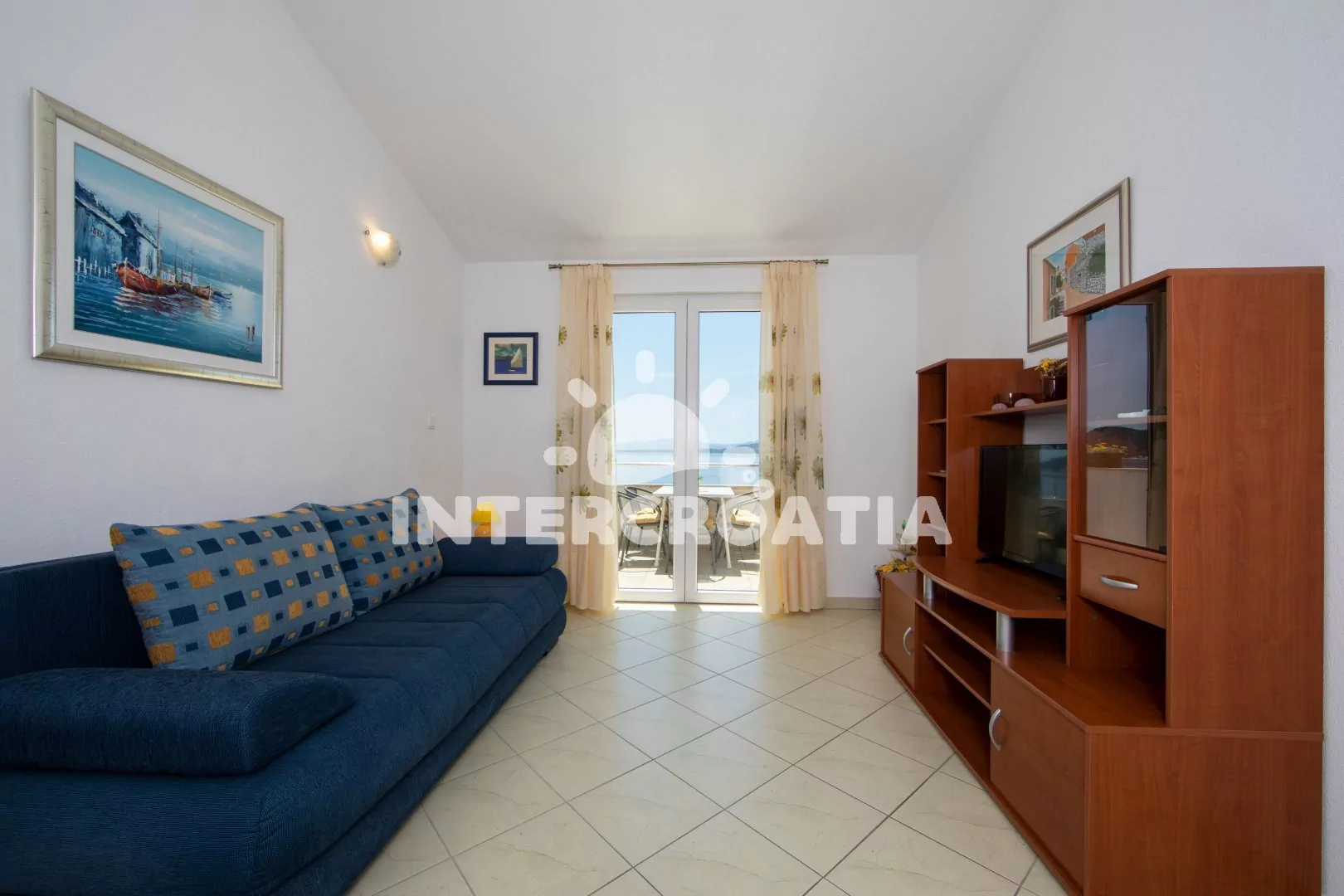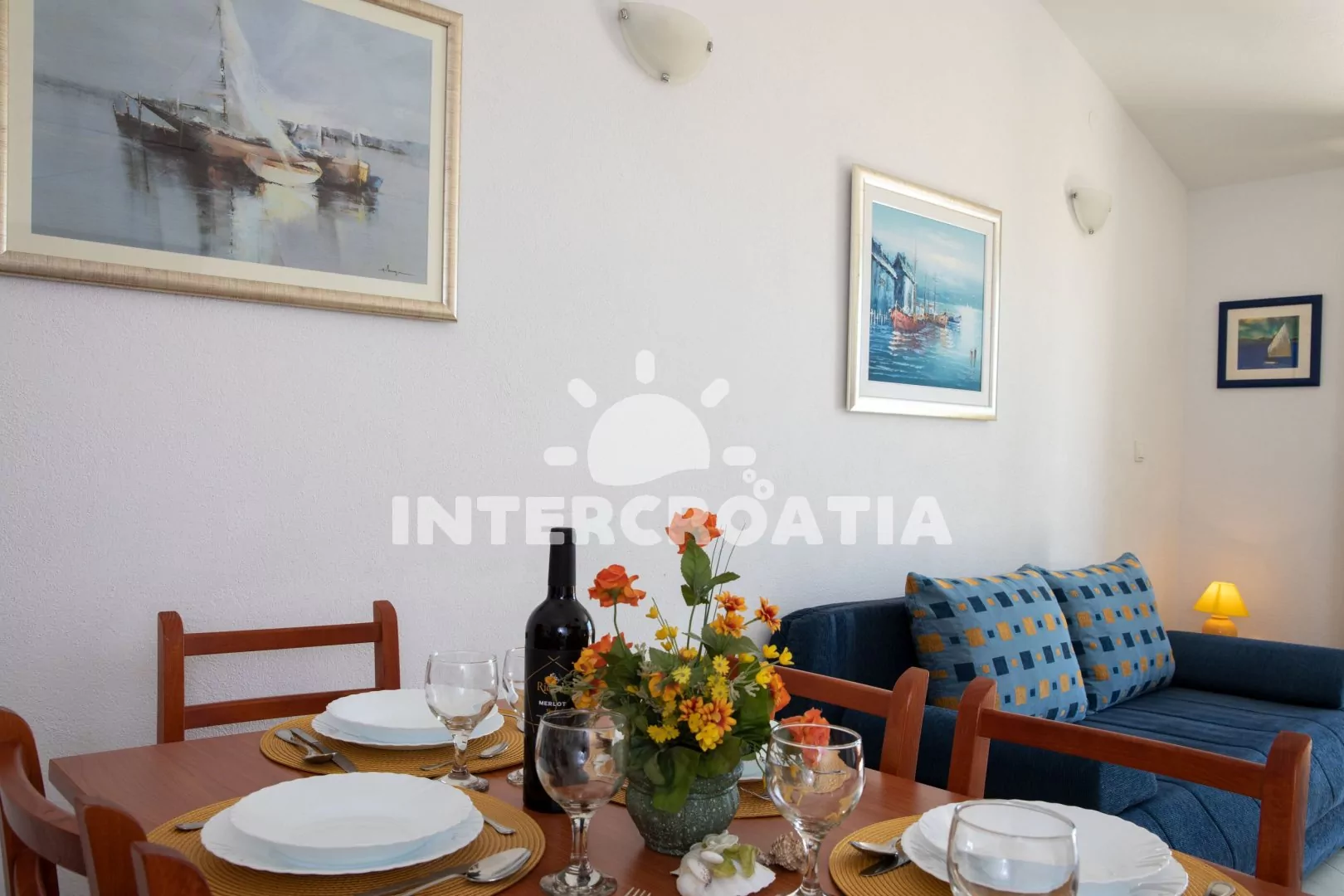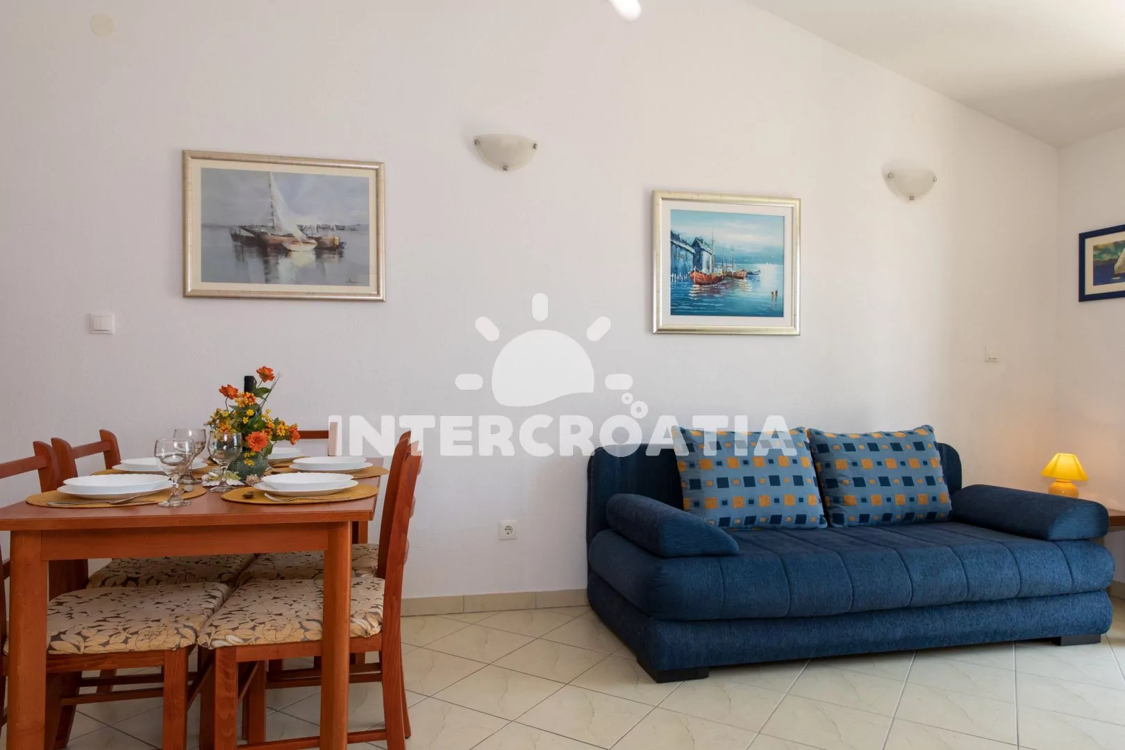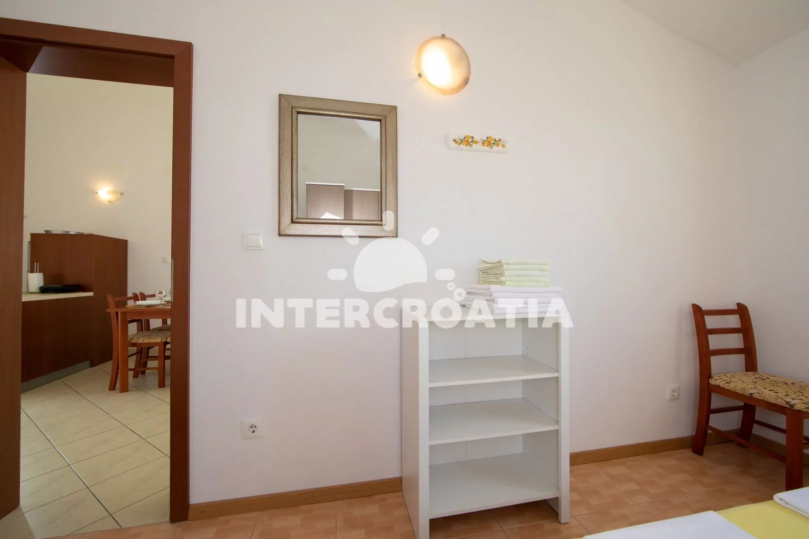 Komfortní dvoupokojový apartmán s krytým balkonem a výhledem na moře, nacházející se v 2. patře domu. Vstup, obývací místnost spojená s kuchyní. Kuchyňská linka s dvouplotýnkovou varnou deskou (elektřina), mikrovlnnou troubou, lednicí s mrazákem, kávovarem, rychlovarnou konvicí a nádobím. V obývací místnosti jídelní stůl pro 5 osob, pohovka (rozložitelná na extra lůžko pro 2 osoby) a LCD televize se satelitem. Ložnice s dvoulůžkem a jedním jednolůžkem. Koupelna se sprchovým koutem, umyvadlem, wc a vysoušečem vlasů. Hosté mají k dispozici balkon s posezením. Parkování 150-300 m od objektu.