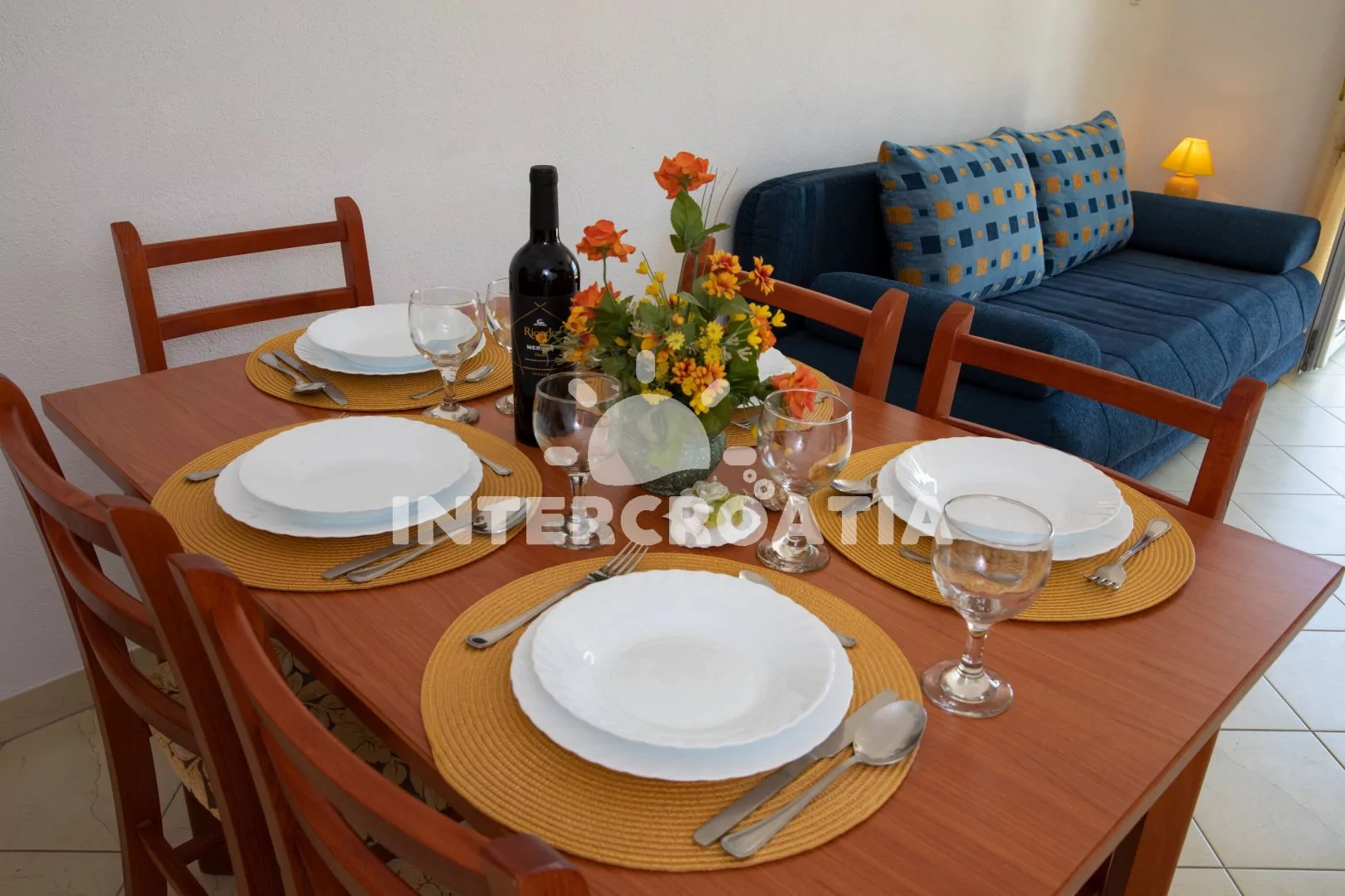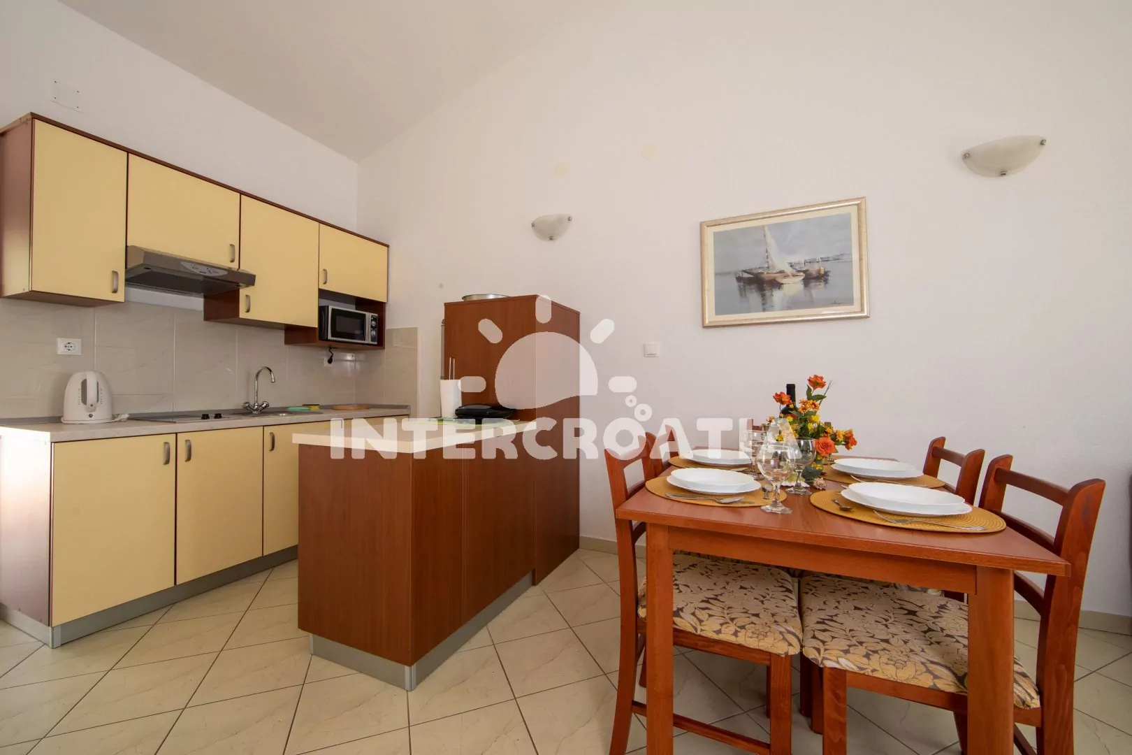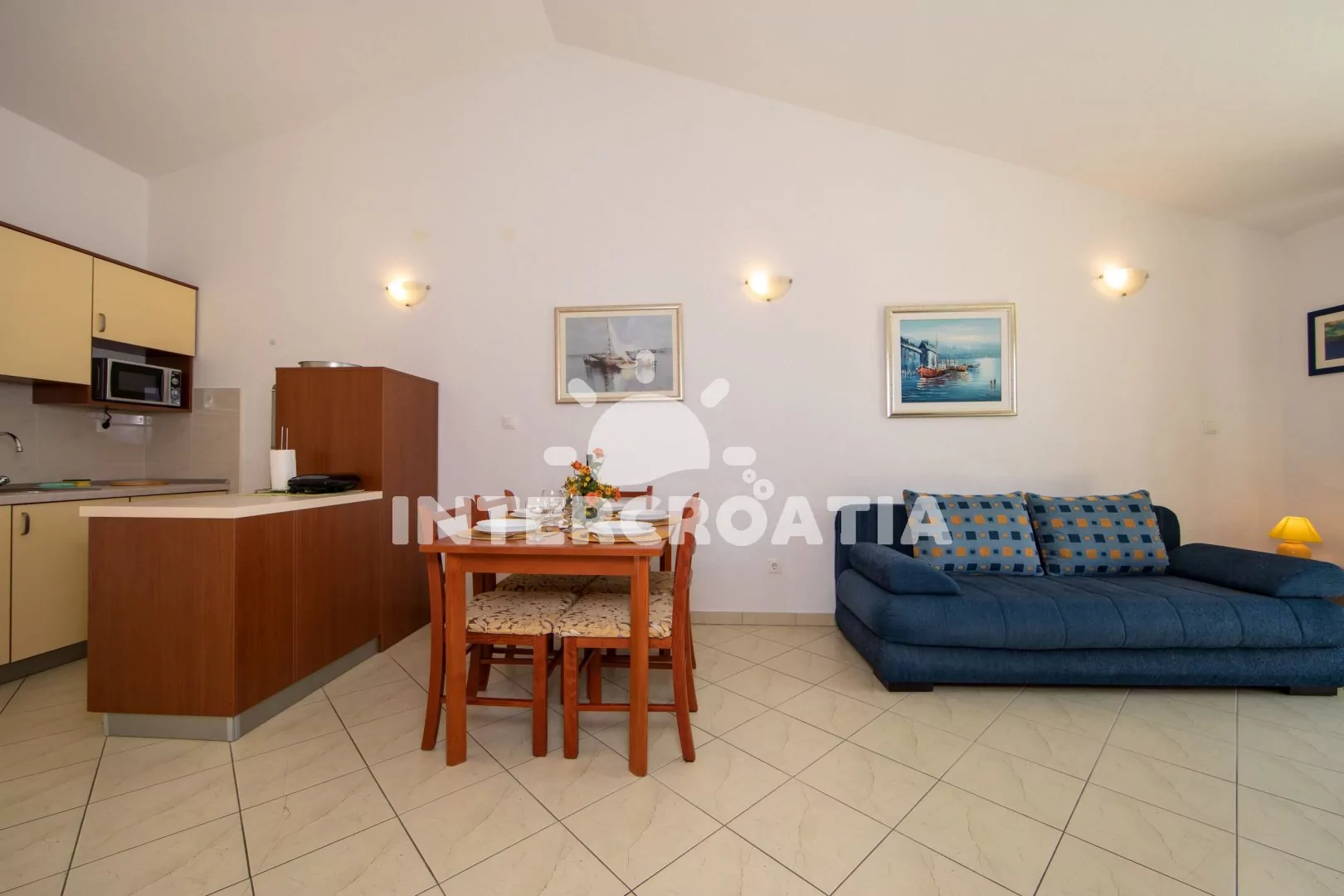Komfortní dvoupokojový apartmán s krytým balkonem a výhledem na moře, nacházející se v 2. patře domu. Vstup, obývací místnost spojená s kuchyní. Kuchyňská linka s dvouplotýnkovou varnou deskou …