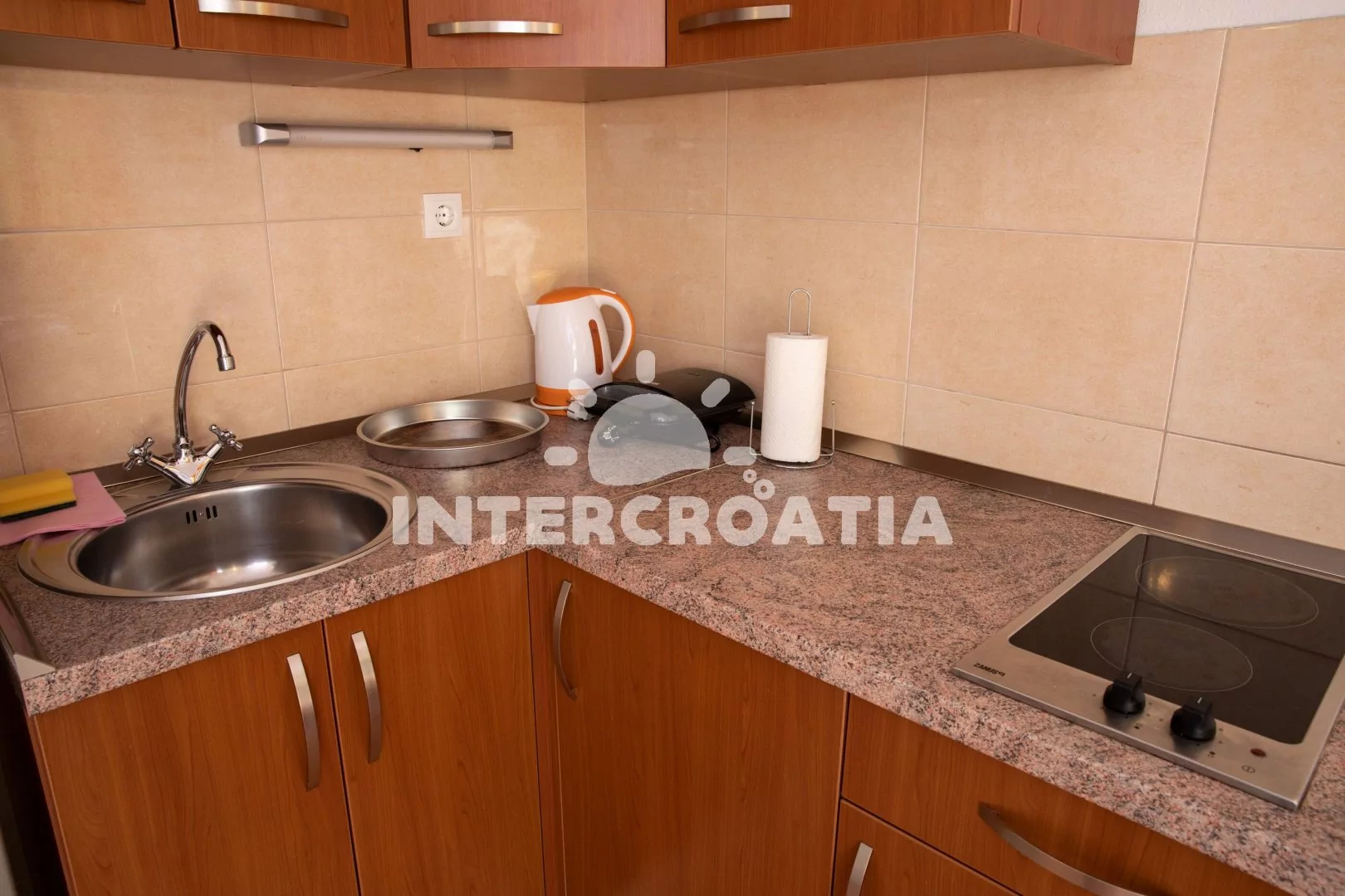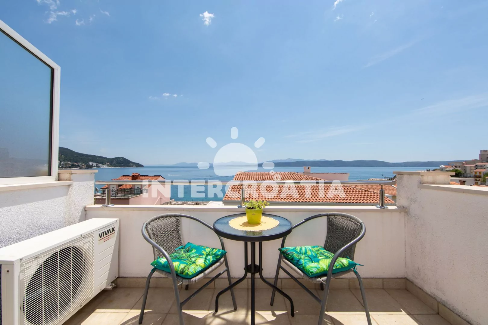 Komfortní apartmán se dvěma koupelnami a krytým balkonem s výhledem na moře, nacházející se v 2. patře domu. Vstup, obývací místnost spojená s kuchyní. Kuchyňská linka s dvouplotýnkovou varnou deskou…
