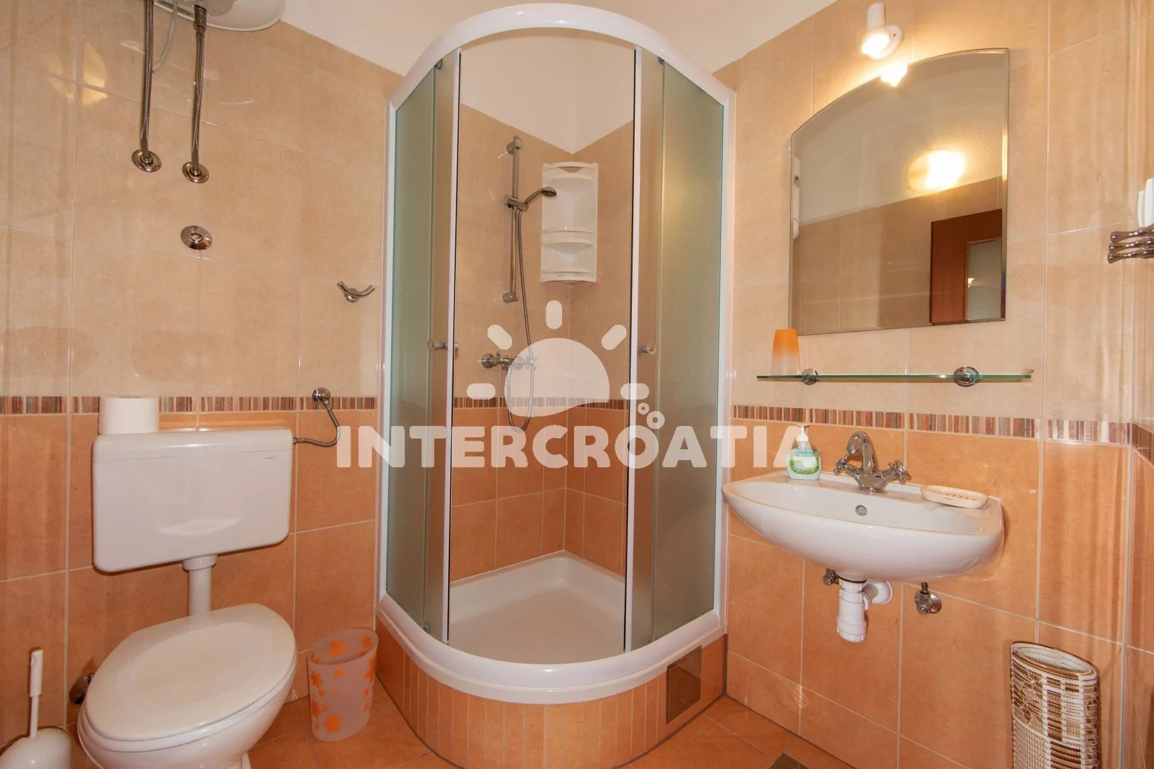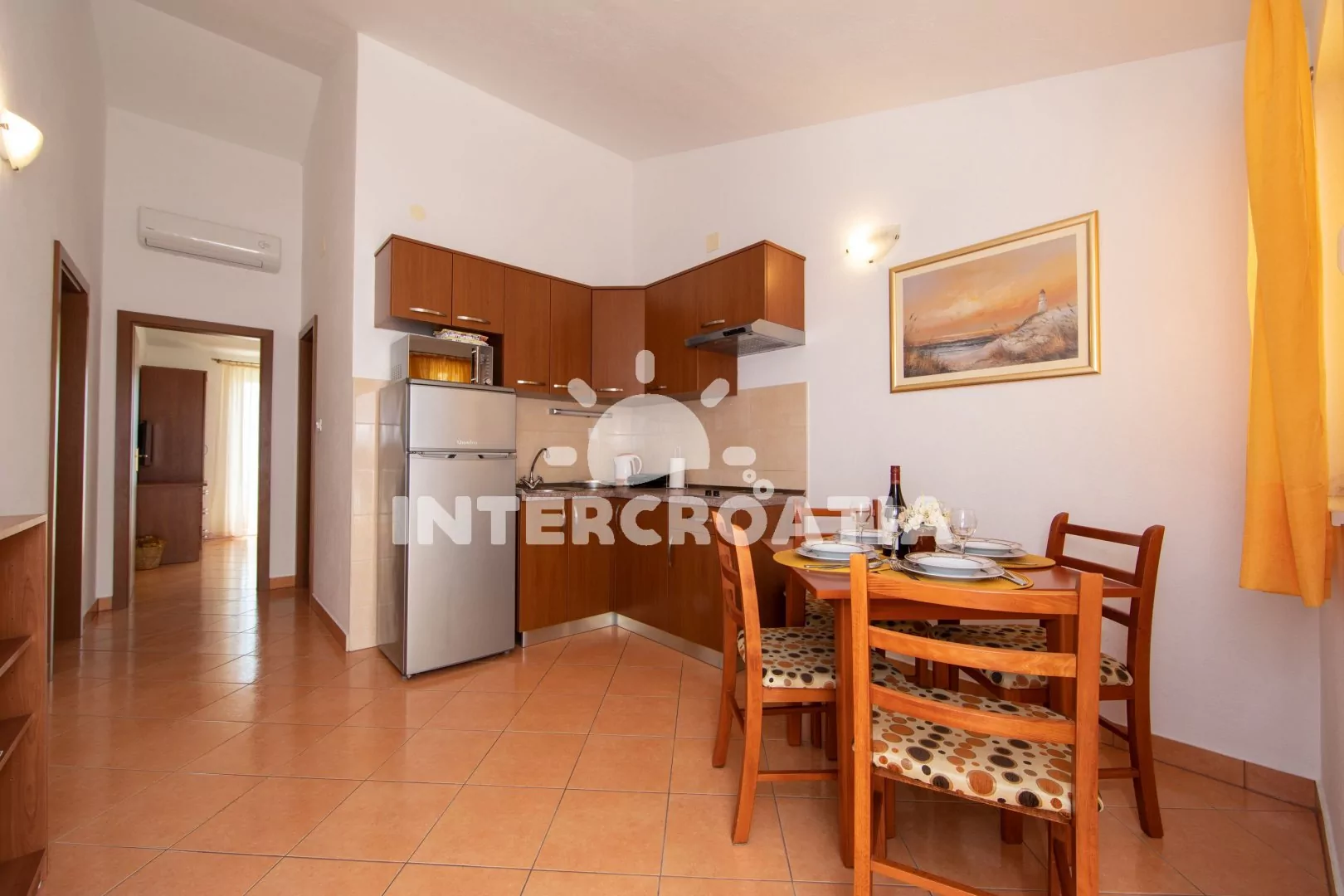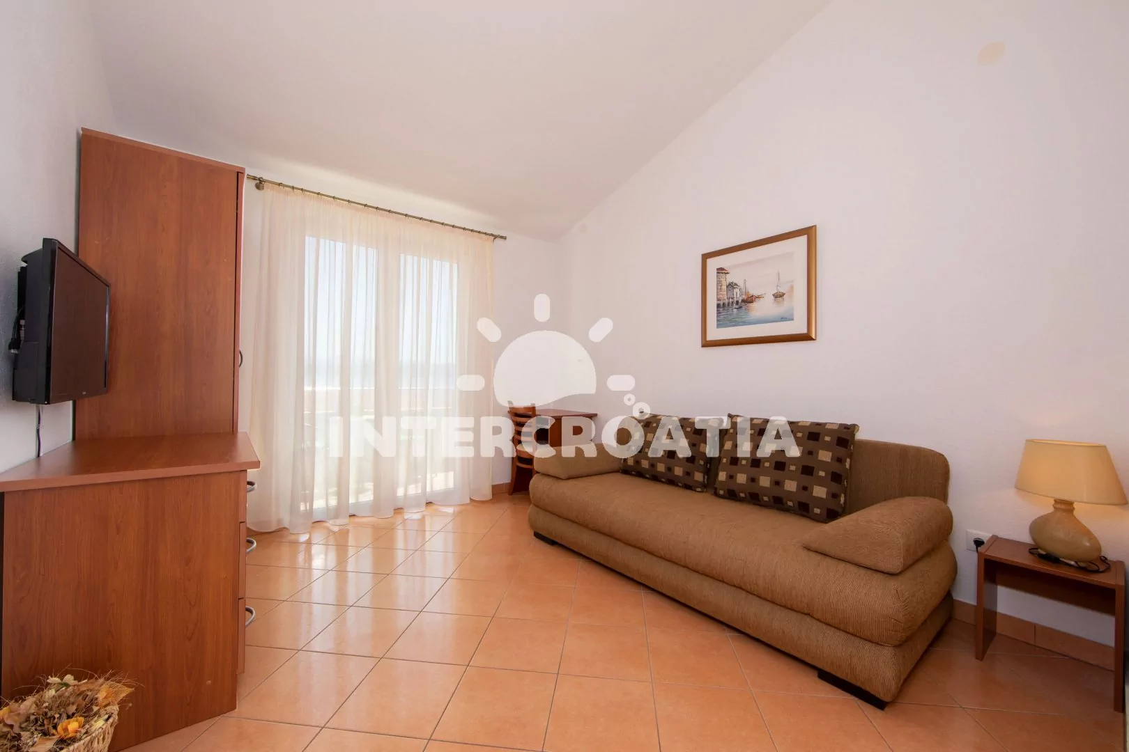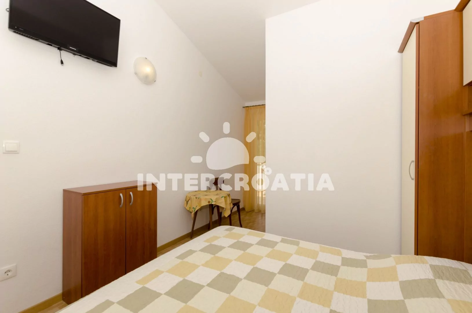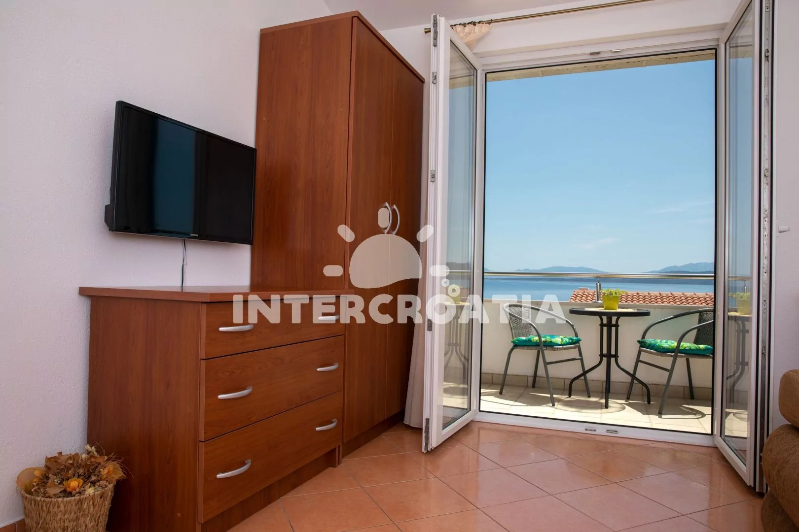 Komfortní apartmán se dvěma koupelnami a krytým balkonem s výhledem na moře, nacházející se v 2. patře domu. Vstup, obývací místnost spojená s kuchyní. Kuchyňská linka s dvouplotýnkovou varnou deskou (elektřina), mikrovlnnou troubou, lednicí s mrazákem, kávovarem, rychlovarnou konvicí a nádobím. V obývací místnosti jídelní stůl pro 4 osoby, pohovka (rozložitelná na extra lůžko pro 2 osoby) a LCD televize se satelitem. Ložnice s dvoulůžkem. Dvě koupelny, každá se sprchovým koutem, umyvadlem, wc a vysoušečem vlasů. Hosté mají k dispozici balkon s posezením. Parkování 150-300 m od objektu.
