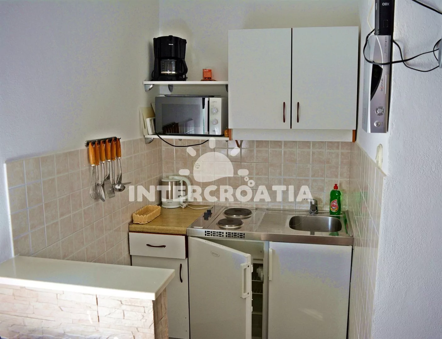 Apartmán s balkonem, výhledem na moře se nachází v 1. patře vily a je vhodný pro 2 až 3 osoby. Obývací pokoj je spojený s kuchyní. Kuchyňská linka je vybavena dvouplotýnkovým vařičem, mikrovlnnou troubou, rychlovarnou konvicí, kávovarem, nádobím a lednicí s mrazákem. Obývací pokoj s jídelním stolem pro 4 osoby, pohovkou (rozložitelná na extra lůžko pro 1 osobu) a televizí se satelitním programem. Ložnice s dvoulůžkem a vstupem na balkon. Koupelna se sprchovým koutem, umyvadlem, fénem a wc. Hostům je k dispozici parkování u objektu zdarma.