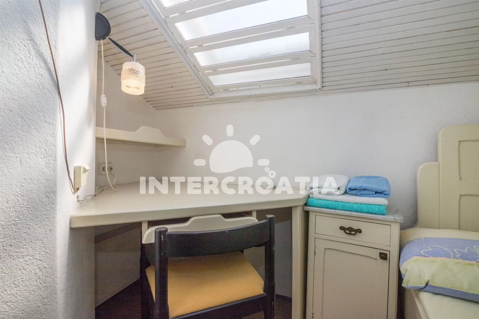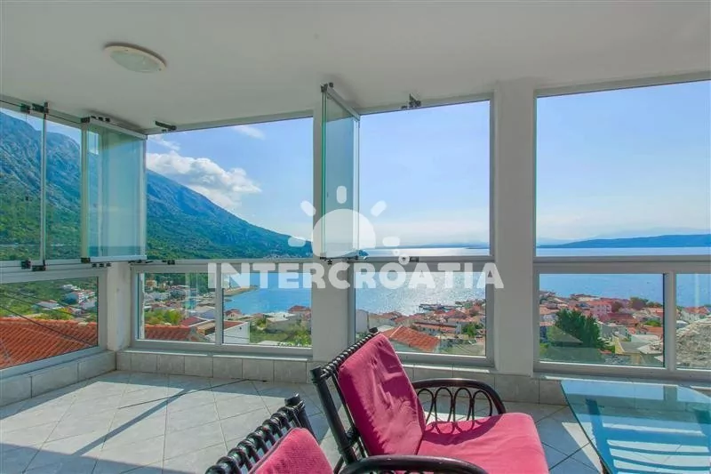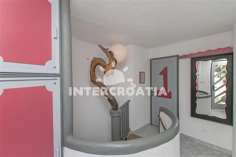 Patrový apartmán (55 m2) s terasou, posezením a výhledem na moře se nachází ve 2. patře domu. Apartmán má 2 ložnice a je vhodný pro až 4 osoby. Obývací pokoj je spojený s kuchyní. Kuchyňská linka je vybavena varnou deskou, digestoří, vestavěnou troubou, mikrovlnnou troubou, rychlovarnou konvicí, kávovarem, nádobím a lednicí s mrazákem. Obývací pokoj s jídelním stolem, pohovkou, televizí, rádiem, klimatizací a vstupem na terasu. První i druhá ložnice je vybavena vždy s jedním dvoulůžkem a klimatizací. Koupelna se sprchovým koutem, umyvadlem a wc. Hostům je k dispozici parkování v blízkosti objektu zdarma (50-150 m).