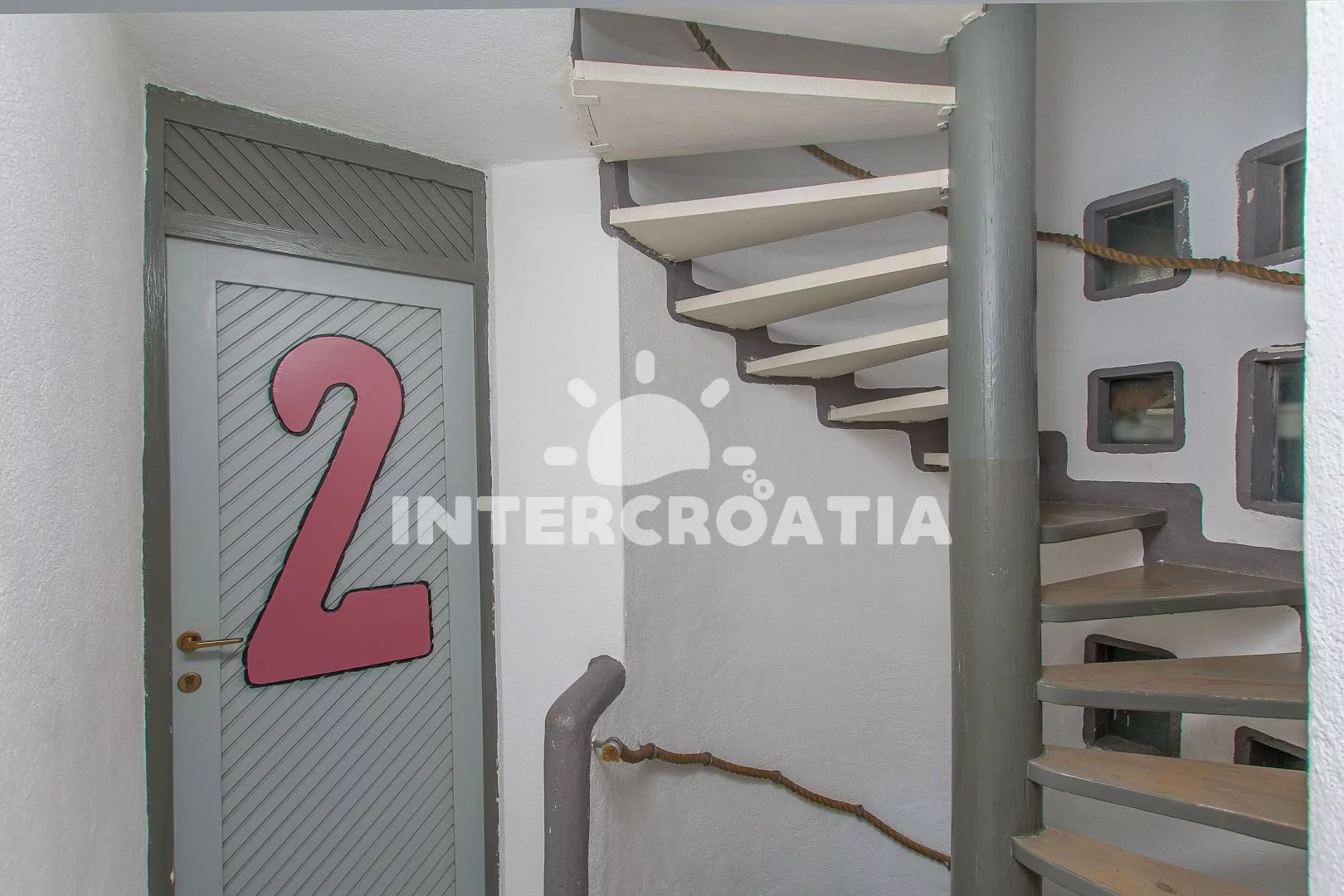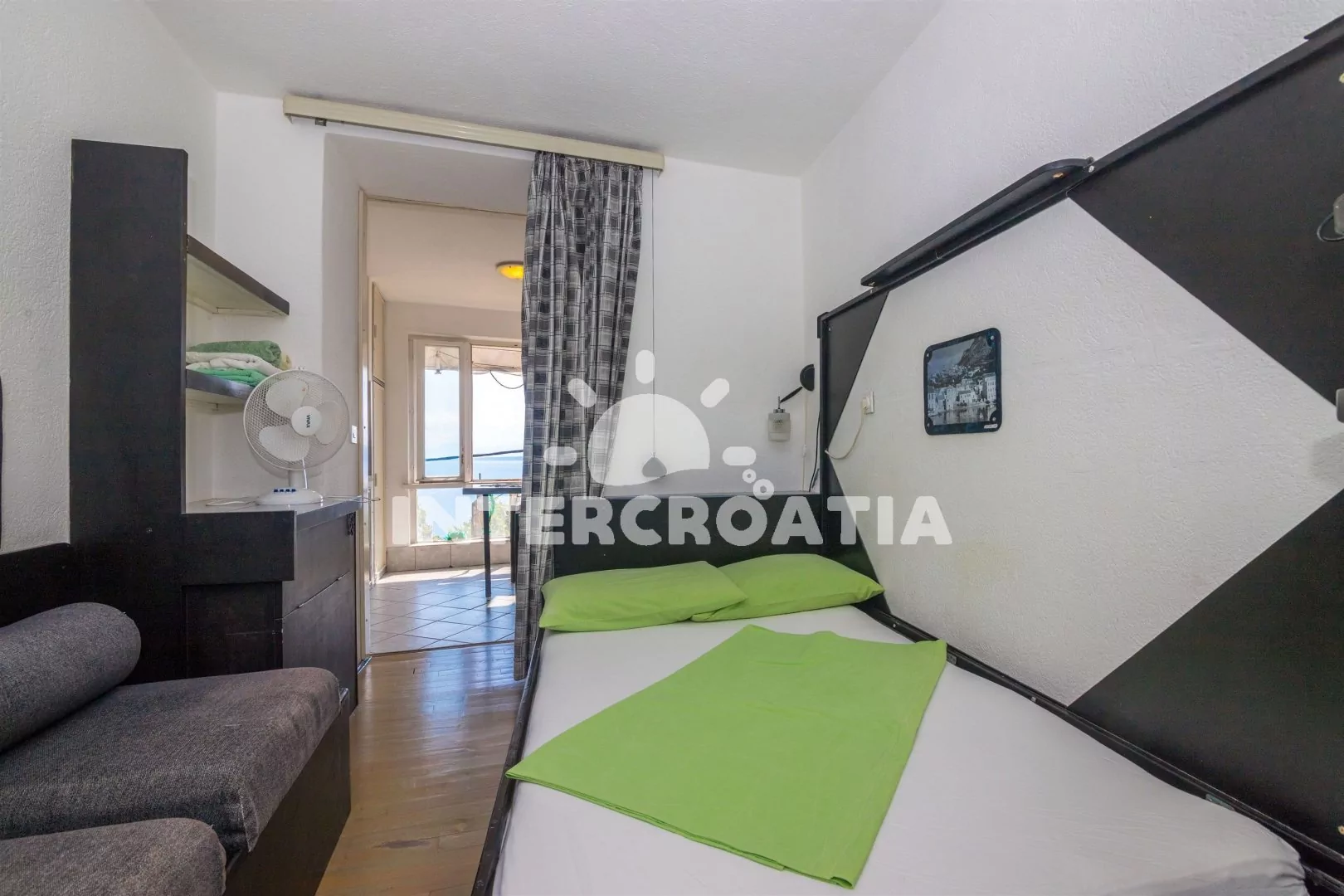 Apartmán (21 m2) typu studio s výhledem na moře se nachází v 1. patře domu. Obývací místnost je spojena s kuchyní. Kuchyňská linka je vybavena dvouplotýnkovým vařičem, rychlovarnou konvicí, nádobím a lednicí s mrazákem. Obývací místnost s jídelním stolem, pohovkou, dvoulůžkem a televizí. Koupelna se sprchovým koutem, umyvadlem a wc. Hostům je k dispozici parkování v blízkosti objektu zdarma (50-150 m).