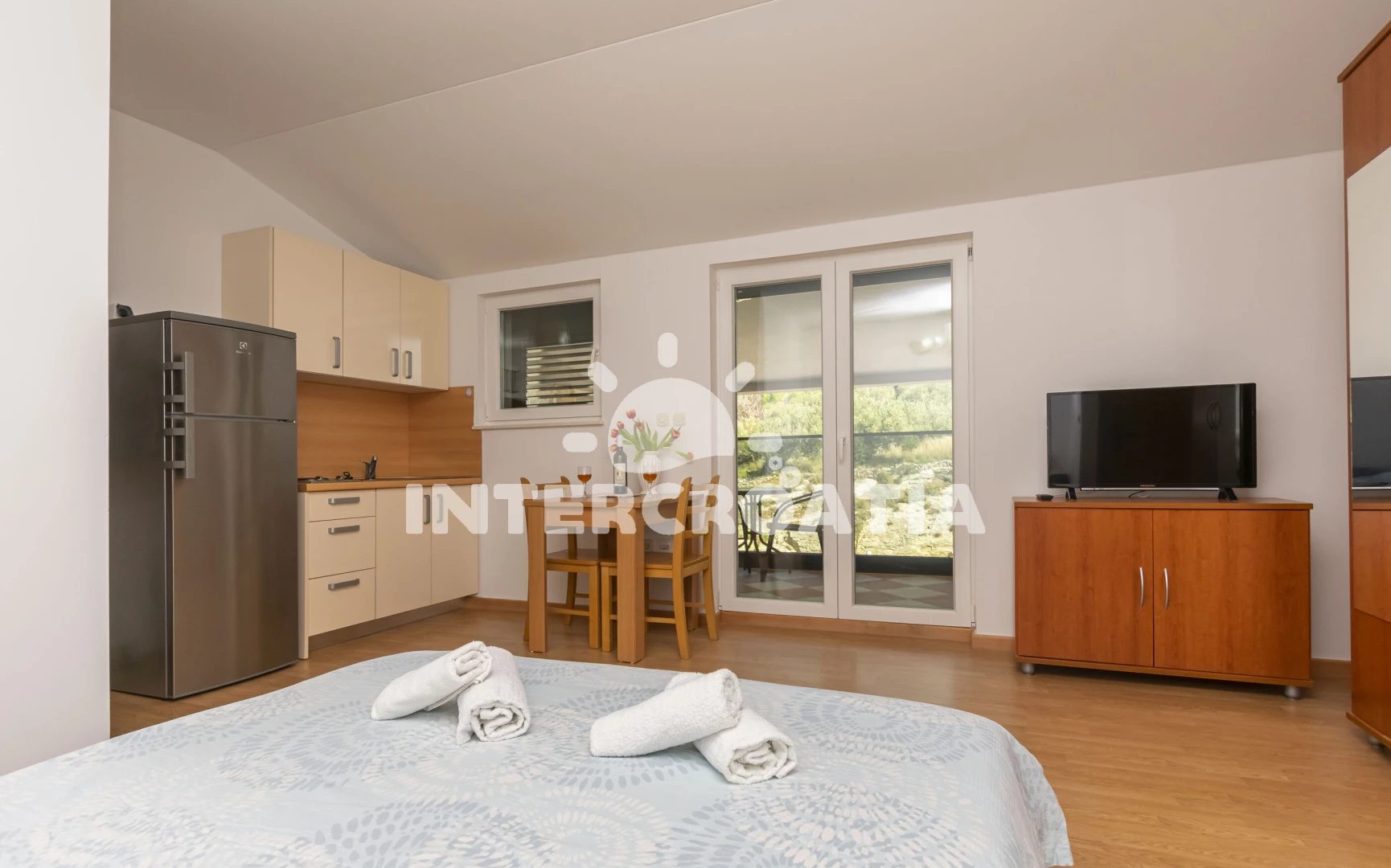 Apartmán (18 m2) typu studio s balkonem. Nachází se ve 2. patře objektu. Kuchyňská linka je vybavena varnou deskou, toustovačem, mikrovlnnou troubou, rychlovarnou konvicí, nádobím, lednicí, mrazákem. K dispozici dvoulůžko, televize, žehlička. Koupelna se sprchovým koutem, umyvadlem, fénem a WC.